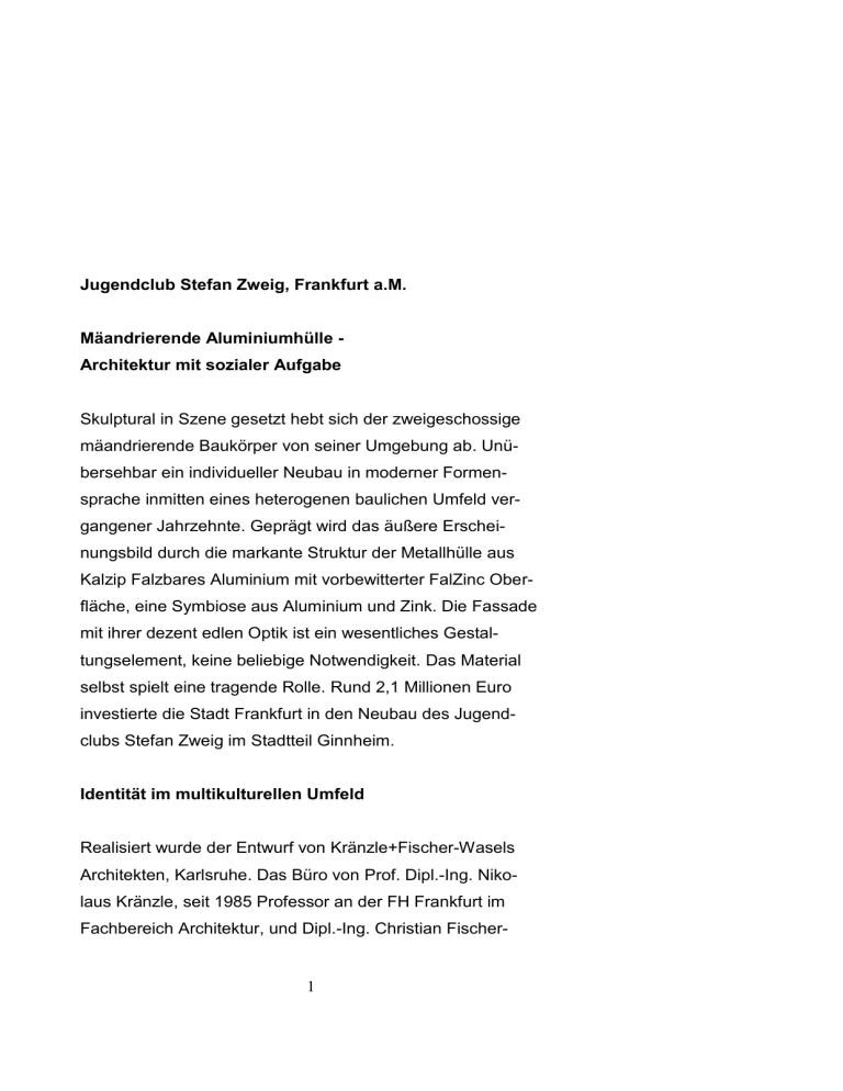 Jugendclub Stefan Zweig, Frankfurt a.M. Mäandrierende Aluminiumhülle Architektur mit sozialer Aufgabe Skulptural in Szene gesetzt hebt sich der zweigeschossige mäandrierende Baukörper von seiner Umgebung ab. Unübersehbar ein individueller Neubau in moderner Formensprache inmitten eines heterogenen baulichen Umfeld vergangener Jahrzehnte. Geprägt wird das äußere Erscheinungsbild durch die markante Struktur der Metallhülle aus Kalzip Falzbares Aluminium mit vorbewitterter FalZinc Oberfläche, eine Symbiose aus Aluminium und Zink. Die Fassade mit ihrer dezent edlen Optik ist ein wesentliches Gestaltungselement, keine beliebige Notwendigkeit. Das Material selbst spielt eine tragende Rolle. Rund 2,1 Millionen Euro investierte die Stadt Frankfurt in den Neubau des Jugendclubs Stefan Zweig im Stadtteil Ginnheim. Identität im multikulturellen Umfeld Realisiert wurde der Entwurf von Kränzle+Fischer-Wasels Architekten, Karlsruhe. Das Büro von Prof. Dipl.-Ing. Nikolaus Kränzle, seit 1985 Professor an der FH Frankfurt im Fachbereich Architektur, und Dipl.-Ing. Christian Fischer- 1 Wasels gewann 2004 den Wettbewerb. Zwei Jahre später begannen die Bauarbeiten. 2008 konnte das neue Domizil von den Jugendlichen in Besitz genommen werden. 350 qm auf zwei Etagen stehen für unterschiedliche Angebote und Freizeitgestaltungsmöglichkeiten zur Verfügung. Dazu zählen ein 90 qm großes, zentral gelegenes Café, ein Trainingsbereich, Gruppen- und Beratungsräume sowie ein Computerkabinett. Zwölf Jahre waren die Kids des Viertels auf Container angewiesen. Ein Provisorium, das in diesem bevölkerungsreichen Viertel besonders negativ auffiel. In Ginnheim gab es seit 1955 drei sogenannte housing areas, Siedlungen, in denen amerikanische Soldaten mit ihren Familien wohnten. Als diese 1995 abzogen, wurden allein im Platen Housing Area fast 800 Wohnungen mit vielen Grünflächen frei. Durch den Zuzug kinderreicher Familien entstand fast über Nacht ein multikulturelles Viertel, in dem nahezu 50 % der Bewohner unter 21 Jahre alt sind. Zu den vielfältigen Angeboten an Betreuungseinrichtungen zählt nun auch der Jugendclub, der in unmittelbarer Nachbarschaft in der Stefan Zweig Straße gebaut wurde. Der österreichische Schriftsteller, einer der bekanntesten Autoren des Frankfurter Insel Verlags, stand auch als Namensgeber Pate. 2 FalZinc – Aluminium mit vorbewitterter Zinkoberfläche Im diesem Umfeld wirkt Architektur auch identitätsstiftend. Der Jugendclub, ein wichtiges Projekt der Stadtteilpolitik, ist als zentraler Treffpunkt für die Jugendlichen konzipiert, ein Schutzraum, der Kids von der Straße holt, sie stützt und fördert. Diese Aufgabe spiegelt die Architektur wider. Der auf drei Seiten geschlossene Baukörper gruppiert sich um einen einseitig offenen Innenhof. Zur Straße hin kragt das Gebäude breitflächig über dem Eingangsbereich aus. Das äußere Erscheinungsbild korrespondiert mit der Struktur der Innenräume: Klarheit in der Gliederung, ohne Kanten und Ecken zu verwischen, helle, übersichtliche Örtlichkeiten. Die Geometrie des Daches bildet sich im Innenraum als Negativform ab. Ein Haus, das kommunikative Entfaltungsmöglichkeiten bietet und Freiräume öffnet. Die Architekten haben bei der Auswahl der Materialien Wert gelegt auf beste Qualität und gute Wirtschaftlichkeit. Kalzip Falzbares Aluminium besteht aus einer seewasserfesten Aluminium-Legierung mit einer hervorragenden Korrosionsbeständigkeit, die das Metall nahezu unvergänglich machen und auch nach Jahrzehnten einen sicheren Gebäudeschutz gewährleisten. Das geringe Gewicht, die hohe Wertbestän- 3 digkeit und der Verzicht auf eine strukturierte Trennlage machen FalZinc zu einer besonders wirtschaftlichen Lösung. Der Jugendclub, eine Stahlbetonkonstruktion, wird an der Fassade und auf dem Flachdach homogen umhüllt. Speziell für die handwerkliche Verarbeitung entwickelt, läßt sich der Werkstoff problemlos in allen fachgerechten Techniken wie Falzen, Kanten, Bördeln oder Schweißen bearbeiten und montieren. Die präzise geformten Winkelstehfalze der Fassade, die in exakt definierten Abständen zueinander stehen, bestimmen gemeinsam mit den Fensterelementen die elegante Ästhetik des Gebäudes. Durch die lebendige FalZinc Oberfläche offenbaren selbst große Flächen einen ausdruckstarken individuellen Charakter. BAUTAFEL Objekt: Neubau Jugendclub Stefan Zweig, Frankfurt a.M. – Ginnheim Trägerverein: Jugendzentrum Ginnheim e.V. Bauherr: Jugend- und Sozialamt (Dezernat Sozialies, Jugend- und Sport) Architekten: Kränzle+Fischer-Wasels Architekten BDA, Karlsruhe Fertigstellung: 2008 Wandfläche: 600 qm Kalzip Winkelstehfalz 4 Dachfläche: 565 qm Kalzip Doppelstehfalz, Banddeckung, Dachneigung 4-17 Grad Material: Kalzip Falzbares Aluminium mit FalZinc Oberfläche Dach- und Fassadenarbeiten: Ochs GmbH, Kirchberg Die Herstelleranschrift: Kalzip Europa Corus Bausysteme GmbH August-Horch-Straße 20-22 D - 56070 Koblenz Tel.: +49(0)261/9834-0 Fax: +49(0)261/9834-100 E-Mail: [email protected] www.kalzip.com Presseanfragen: Corus Bausysteme GmbH Joachim Wolke Tel.: +49(0)261/9834-142 E-Mail: [email protected] oder RedAktion Elvira Döscher Am Kupferberg 5 D - 53619 Rheinbreitbach Tel. : +49(0)2224/900146 Fax : +49(0)2224/900147 E-Mail: [email protected] 5 Bildnachweis: Stephan Baumann / Kalzip Europa Bildzeilen: 1 Fassade und Dach des Jugendclubs Stefan Zweig wurden mit Kalzip Falzbares Aluminium mit vorbewitterter FalZinc Oberfläche umhüllt. 2 Geprägt wird das äußere Erscheinungsbild des mäandrierenden Baukörpers durch die markante Struktur der Metallhülle. 3 Die Geometrie des Daches spiegelt sich im Innenraum als Negativform wider. 4 Wirtschaftlich und nachhaltig: Durch die hervorragende Korrosionsbeständigkeit ist Kalzip Falzbares Aluminium nahezu unvergänglich und gewährleistet auch nach Jahrzehnten einen sicheren Gebäudeschutz. 5-8 Ansichten, Schnitte, Dachgeschoß, Erdgeschoß Kränzle+Fischer-Wasels