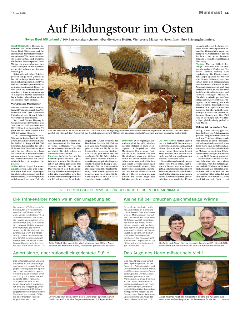 Munimast 17. Juni 2016 15 Auf Bildungstour im Osten Swiss Beef Mittelland / 100 Betriebsleiter schauten über die eigene Hoftür. Vier grosse Mäster verrieten ihnen ihre Erfolgsgeheimnisse. GUNDETSWIL Zwei Themen beredeten die Munimäster von Swiss Beef Mittelland auf der Hinfahrt in die Ostschweiz: Erstens das seit Wochen andauernde Regenwetter, und zweitens die hohen Tränkerpreise. Beim Wetter war man sich einig, dass alles Schimpfen nichts nützt und es nur die Hoffnung auf Sonnenschein gibt. Bei den aktuell hohen Tränkerpreisen von je nach Qualität 13 bis 15 Franken je Kilo lebend war man sich einig, dass dieser Preis indirekt auch der guten Nachfrage zuzuschreiben ist. Einer von den rund 100 mitreisenden Munimästern fasste es zusammen: «Solange die Mäster bereit sind, hohe Preise zu bezahlen, werden die Tränker nicht billiger.» im Aufzuchtstall bedeute weniger Stress für die jungen Kälber. Der Unterschied zum vorherigen Kälberstall mit einem Strohbett sei eine bessere Tränker-Gesundheit, ist Herzog überzeugt. Fliegen: Martin Stäheli bekämpft in seinem Stall die Fliegen einmal pro Woche mit Neporex. Simon Herzog füllt regelmässig die Kanäle unter den Lospa-Spalten mit Wasser oder dünner Gülle und lässt den Inhalt samt den Fliegenlarven ins Güllenloch. Generell ist der Automatisierungsgrad auf den Betrieben hoch. In Ställen sind Kraftfutter-Verteilautomaten und Futtermischwagen Standard. Ebenfalls wird sehr gut auf Qualität geachtet, sowohl bei der Silage für die Fütterung, wie auch bei der Qualität der abgelieferten Mastmuni. Eingestallt werden meistens Tränker mit Abstammung Fleischrassen oder mindestens Braunvieh. Das Ziel sind in der Regel sehr vollfleischige, gleichmässig gedeckte (C3)-Muni. Vier grössere Munimäster Besucht wurden zwei Munimäster mit Produktion nach den Vorschriften von QM Schweizer Fleisch und zwei die nach Labelvorschriften produzieren. Kurt und Simon Herzog in Gundetswil ZH (90 Kälber und 380 Vormast und Ausmast) und Oliver Engeli in Engishofen TG (380 Muni) produzieren nach QM Schweizer Fleisch. Die Betriebsgemeinschaft Widmer in Rickenbach ZH (350 Muni, maximal 420) und Familie Stäheli in Roggwil TG (240 Muni) produzieren für das Label IP Suisse. Das Fleisch ihrer Muni wird in der Migros als Terra Suisse verkauft. Die Betriebsleiter vernahmen Gemeinsamkeiten, hörten aber auch von unterschiedlichen Strategien der Mäster. Ställe: Oliver Engeli hat einen amortisierten, aber gut eingerichteten Stall mit Lospa-Spaltenböden, der rationell mit Futterautomaten, Mischwagen und Abfräsmaschine am Fahrsilo Widmer ist Harverstore-Fan Alle vier besuchten Munimäster wissen, dass das Einstallungsprogramm das Fundament einer erfolgreichen Munimast darstellt. Dazu gehört wie hier auf dem Römerhof der Betriebsgemeinschaft Stäheli ein sauberer, gut belüfteter und warmer, separater Kälberstall. funktioniert. Jakob Widmer hat den Ausmaststall für 200 Muni in einer einfachen, vielseitig verwendbaren Betonhalle eingerichtet, die sich jedoch als Munistall bewährt hat. Einstreu: Auf dem Betrieb der Betriebsgemeinschaft (BG) Widmer wurden die Muni seit jeher auf Stroh gemästet. Der Strohverbrauch für die im Durchschnitt 350 Labelmuni beträgt 1500 Rundballen jährlich oder vier Rundballen pro Tag. Ein Drittel des Strohs produziert die BG selber, zwei Drittel wird zugekauft. Dabei verläuft der Handel so, dass die BG Widmer den von den Ackerbauern begehrten Mist auf die Äcker liefert und im Gegenzug Stroh erhält. «Stroh gibt Arbeit, ist aber das beste für die Ackerböden», zieht Jakob Widmer Bilanz. Simon Herzog empfindet Liegeboxen für Kälber und Lospa-Spaltenböden für die Ausmasttiere als eine grosse Arbeitserleichterung, denn damit gebe es auf dem Hof nur noch eine GülleAusbring-Kette und die MistAusbring-Kette entfalle. Einstallen: Die sorgfältige Einstallung zählt bei allen vier besuchten Betrieben zum wichtigsten Erfolgsfaktor der Munimast. Ein grosser Fortschritt sei es, betonen alle vier Munimäster, dass die Kälber heute mit einem durchschnittlichen Alter von sechs Wochen und einem Gewicht von 75 kg in den Mastbetrieb kämen. Die Tierverluste seien mit schwereren und älteren Kälbern kleiner als in früheren Zeiten, als nur sieben bis zehn Tage alte Tränker angeliefert wurden. QM oder Label: Martin Stäheli hat von QM auf IP Suisse umgestellt. Seitdem seine Muni Auslauf hätten, habe er die Tiere auch besser unter Kontrolle, betont Martin Stäheli. «Ich möchte nicht mehr zurück zu geschlossenen Ställen», lautet sein Fazit. Simon Herzog bezeichnet geschlossene Ställe mit Liegeboxen als besser, wenn es darum geht, den Krankheitsdruck bei 30 Tränkern, die aus 30 verschiedenen Ställen stammen, gering zu halten. Ein kontrolliertes, gleichmässiges und zugfreies Klima Einzig Simon Herzog gibt zu, dass die Mast von A-Tränkern im grossen und ganzen rentabler sei weil die Tränker billiger sind. Man müsse es eben «ertragen» beim Gang durch den Stall, dass diese Tiere «nur mittelfleischig» seien und nicht dem Idealbild aller Metzger entsprächen. C-Muni rentierten weniger, hat Simon Herzog die Erfahrung gemacht. Die meisten Munimäster haben Fahrsilo oder noch dazu Hochsilos. Nur die Betriebsgemeinschaft Widmer in Rickenbach ZH hat alle Siloarten ausprobiert und ist zuletzt bei den Harverstore-Silos gelandet und «die haben sich bewährt», zieht Jakob Widmer sein Fazit. rü VIER ERFOLGSGEHEIMNISSE FÜR GESUNDE TIERE IN DER MUNIMAST Die Tränkekälber holen wir in der Umgebung ab Kleine Kälber brauchen gleichmässige Wärme Für unseren IPS-Munimast-Betrieb kaufen wir wöchentlich zwei bis drei Tränker im Gewicht von je mindestens 75 kg von Milchbauern in der Nähe, die Kunden von unserem Lohnunternehmen sind. Die Tränker sind maximal 20 Minunten auf dem Transport. Sie werden immer um 17 Uhr abgeholt. Am zweiten Tag, wenn die Kälber richtig trinken, bekommen sie eine Einstell-Behandlung nach Rezept. Weil
