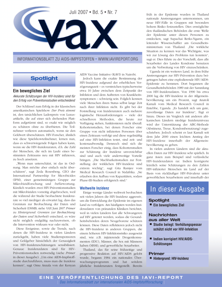 Juli 2007 • Bd. 5 • Nr. 7 INFORMATIONSBLATT ZU AIDS-IMPFSTOFFEN l WWW.IAVIREPORT.ORG Spotlight Ein bewegliches Ziel Akkurate Schätzungen der HIV-Inzidenz sind für den Erfolg von Präventionsstudien entscheidend Der Schlüssel zum Erfolg in der klassischen amerikanischen Spielshow Der Preis stimmt ist, den tatsächlichen Ladenpreis von Luxusartikeln, die auf einer sich drehenden Plattform aufgetürmt sind, so exakt wie möglich zu schätzen ohne zu überbieten. Die Teilnehmer verlieren automatisch, wenn sie den Geldwert überschätzen. HIV-Forscher, ähnlich wie diese Spielshowteilnehmer, lernen nun, dass es schwerwiegende Folgen haben kann, wenn sie die HIV-Inzidenzraten, d.h. die Zahl der Menschen, die sich im Laufe eines bestimmten Zeitraums neu mit HIV infizieren, zu hoch ansetzen. „Wenn man unterschätzt, ist das in Ordnung. Man möchte aber einfach nicht überschätzen“, sagt Zeda Rosenberg, CEO der International Partnership for Microbicides (IPM), einer gemeinnützigen Gruppe zur Mikrobizidforschung und -befürwortung. Kürzlich wurden zwei HIV-Präventionsstudien mit Mikrobiziden vorzeitig abgebrochen, weil die während der Studie beobachtete Inzidenzrate so viel niedriger als erwartet lag, dass das Gremium zur Beobachtung der Daten und Sicherheit (DSMB; siehe VAX Juni 2007 Primer zu Hintergrund: Gremien zur Beobachtung der Daten und Sicherheit) entschied, es wäre nicht möglich endgültig nachzuweisen, ob die Intervention wirksam war oder nicht. Diese Ereignisse, sowie die Trends, nach denen die HIV-Inzidenz in vielen Ländern zurückgeht, haben viele Studiensponsoren und Geldgeber hinsichtlich der Genauigkeit von HIV-Inzidenzschätzungen sensibilisiert. Genaue Inzidenzdaten sind für HIVPräventionsstudien notwendig (siehe Primer in dieser Ausgabe). „Um eine AIDS-Impfstoffstudie durchzuführen, muss man die Inzidenz kennen“, sagt Omu Anzala von der Kenyan AIDS Vaccine Initiative (KAVI) in Nairobi. Jedoch kann die exakte Bestimmung der HIV-Inzidenz aufgrund der erheblichen Verzögerungszeit – es verstreichen typischerweise etwa 10 Jahre zwischen dem Zeitpunkt der Infektion und dem Auftreten von Krankheitssymptomen – schwierig sein. Folglich kennen viele Menschen ihren Status selbst lange Zeit nach ihrer Infektion nicht. Es gibt bei der Feststellung von Inzidenzraten auch mehrere logistische Herausforderungen – viele der schnelleren Methoden, die heute zur Verfügung stehen, funktionieren nicht überall. Kohortenstudien, bei denen Forscher eine Gruppe von nicht infizierten Personen über einen Zeitraum verfolgt und diese regelmäßig auf eine HIV-Infektion testet, sind zeit- und kostenaufwendig. Dennoch sind sich die meisten Forscher einig, dass Kohortenstudien zur Schätzung der Inzidenz unverzichtbar sind und auch viele anderweitige Vorteile bringen. „Die Machbarkeitsstudien zur Feststellung der wirklichen HIV-Inzidenz sind extrem wichtig“, sagt Gita Ramjee vom Medical Research Council in Südafrika. „Sie erlauben den Aufbau von Kapazitäten, sodass Phase-III-Studien erfolgreich sind.“ Weltweite Inzidenz Einige wenige Länder weltweit beobachten seit vielen Jahren die HIV-Inzidenz aggressiv, um die Entwicklung der Epidemie im eigenen Land zu verfolgen. Am häufigsten werden Inzidenzdaten von pränatalen Kliniken berichtet, weil in vielen Ländern fast alle Schwangeren auf HIV getestet werden, sodass die Gesundheitsbehörden deren Neugeborene schützen können. Diese Daten reflektieren jedoch nicht die HIV-Inzidenz in anderen Gruppen, die einem höheren HIV-Infektionsrisiko ausgesetzt sind, wie z.B. injizierende Drogenkonsumenten (IDU), Männer, die Sex mit Männern haben (MSM), und gewerbliche Sexarbeiter. Thailand, das für seine frühzeitige und progressive Reaktion auf HIV/AIDS gelobt wurde, begann 1984 ein nationales Überwachungsprogramm und hat seitdem jährliche Inzidenzraten festgestellt. Bereits früh in der Epidemie wurden in Thailand nationale Anstrengungen unternommen, um neue HIV-Fälle in Gruppen mit besonders hohem Risiko festzustellen. Dies ermöglichte den thailändischen Behörden die erste Welle der Epidemie unter diesen Personen zu entdecken, sagt Supachai Rerks-Ngarm, ein leitender Wissenschaftler am Gesundheitsministerium von Thailand. „Die wirkliche Situation zu kennen war das Wichtigste, was wir zur Lösung des Problems tun konnten“, sagt er. Dies führte zu der Vorschrift, dass alle Sexarbeiter des Landes Kondome benutzen um die Verbreitung von HIV einzuschränken. Uganda ist ein weiteres Land, in dem frühe Anstrengungen zur HIV-Prävention dazu beigetragen haben eine explodierende HIV/AIDSEpidemie zu hemmen. Dort begannen die Gesundheitsbehörden 1989 mit der Sammlung von HIV-Inzidenzdaten. Von 1990 bis etwa 2000 lag die HIV-Inzidenz in der Allgemeinbevölkerung um ein Prozent, sagt Anatoli Kamali vom Medical Research Council in Entebbe, Uganda. „Es handelt sich um gute, zuverlässige Daten zur Inzidenz“, fügt er hinzu. Dieses im Vergleich mit anderen afrikanischen Ländern niedrige Inzidenzniveau wird der Unterstützung der ABC-Methode (Abstinenz, Treue, Kondombenutzung) zugeschrieben. Jedoch scheint es laut Kamali seit dem Jahr 2000 einen leichten Anstieg der HIV-Inzidenz innerhalb der Allgemeinbevölkerung zu geben. In vielen anderen Ländern sind die aktuellen Daten zur HIV-Inzidenz sehr spärlich. In ganz Asien zum Beispiel sind verlässliche HIV-Inzidenzdaten rar. Indien korrigierte kürzlich seine Schätzungen zu den Zahlen HIV-infizierter Menschen im Land auf der Basis von rückläufiger HIV-Prävalenz unter gewerblichen Sexarbeitern und innerhalb der In dieser Ausgabe Spotlight n Ein bewegliches Ziel Nachrichten aus aller Welt n n Studie belegt: Verhütungspessar schützt nicht vor HIV-Infektion Indien korrigiert HIV/AIDSSchätzungen Primer n Hintergrund: HIV-Inzidenz EINE VERÖFFENTLICHUNG DES IAVI-REPORT [ Das Informationsblatt zur internationalen AIDS-Impfstoffforschung ] Allgemeinbevölkerung in einige