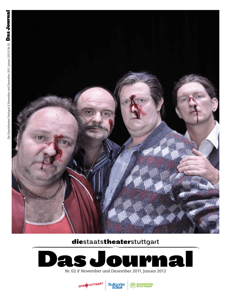 Das Journal Nr. 02 // November und Dezember 2011, Januar 2012 Die Staatstheater Stuttgart // November und Dezember 2011, Januar 2012 // Nr. 02 Das Journal 1. • Vorwort Vorwort Sehr geehrte Leserinnen und Leser, liebes Opern-, Ballett- und Schauspielpublikum! Blutige Nasen in den Staatstheatern Stuttgart? Nein, unser Titelfoto dokumentiert zum Glück nicht einen bedauerlichen Bühnenunfall, sondern die hervorragende Arbeit unserer Kostüm- und Maskenabteilung. In unseren zahlreichen Werkstätten hinter den Kulissen leisten viele Menschen Tag für Tag einen ganz wesentlichen Beitrag zu unseren Musik-, Tanz- und Sprechtheaterproduktionen. Unsere Reportage über „Die Theater-Ermöglicher: ein Portrait“ ab Seite 5 dieses Journals berichtet von fünf jungen Menschen, die sich in unseren Werkstätten ausbilden lassen. Wir hoffen, damit Ihre Neugierde auf Theater – getreu unseres bereits im Vorwort der ersten Ausgabe formulierten Wunsches – auch in dieser Ausgabe des „Journals“ wieder aufs Neue zu wecken. Wir freuen uns auf Sie! Die Staatstheater Stuttgart Inhalt Das Journal Nov. Dez. 2011 / Jan. 2012 v.l. Klaus Kächele, Johannes Petz, Urs Winter, Ulrich Wand, Peter Schaufelberger vom Staatsopernchor Stuttgart (Foto: Christian Wiehle) 01. • Ausbildungsberufe an den Staatstheatern // Seite 5 Die Theater-Ermöglicher: ein Portrait 02. • Ortstermin Leonhardsviertel // Seite 8 Ein Ausflug ins Stuttgarter Rotlichtviertel mit dem Regisseur Christian Weise 03. • Schwanensee // Seite 10 Femme fatale in Federm: Über schwarze und weiße Schwäne 04. • Catherine Naglestad // Seite 12 »Ich will dem Publikum nicht zeigen, was es denken soll«. Ein Portrait 05. • 40 Jahre John Cranko Schule // Seite 14 Interview mit Ballettschuldirektor Tadeusz Matacz 06. • Cary Gayler // Seite 16 »Spiel- und Denkräume entwerfen«. Ein Portrait der Bühnenbildnerin 07. • Fausts Verdammnis // Seite 18 Masse und Macht. Wie ein Chor zum Solisten wird 08. • Die Nachtwandlerin // Seite 19 Vincenzo Bellinis Oper: Zwischen Wildnis und Zivilisation 09. • Kompanie des Jahres // Seite 20 Das Stuttgarter Ballett gewann die Kritikerumfrage der Fachzeitschrift TANZ 10. • Kristo Šagor // Seite 22 Während der Proben zu »In weiter Ferne«: Sarah Israel befragte den Regisseur 11. • Jan Neumann // Seite 23 Auszüge der Laudatio zur Verleihung des Förderpreises für Komische Literatur Foto: Martin Siegmund 12. • Die Junge Oper // Seite 24 Lange Nasen, lächelnde Türen: Barbara Tacchini im Gespräch Plus • 10 Fragen an … // Seite 26 Raphael Agurkis, Leiter der Botenmeisterei 01. • Ausbildungsberufe an den Staatstheatern Foto: Maik Glemser 1. • Vorwort 01. Anika Roll, Modisterei Die Theater-Ermöglicher: ein Portrait Von Kopf bis Fuß, von Bühnenbild bis Beleuchtung – an den Staatstheatern Stuttgart wird nichts dem Zufall überlassen: der Nachwuchs aus Modisterei und Maske, aus Schuhmacherei und Schreinerei wird dabei in den theatereigenen Werkstätten ausgebildet. Foto: Martin Sigmund Sie stehen nicht im Rampenlicht, doch ohne sie hörte das Herz des Theaters auf zu schlagen. Ohne sie blieben all die Ideen von Künstlern nur Ideengespinste. Als Handwerker und Techniker aller Couleur sind sie Teil einer wundersamen Illusionsmaschine, deren feinmechanische Justierung ebenso kompliziert wie faszinierend ist. Manches von dem, was sie können, lässt sich heute nur noch am Theater erlernen und im Theaterbetrieb verwirklichen, denn draußen in der globalisierten Welt hieße es: „zu zeitaufwändig, zu teuer“. Vieles von dem, was sie können müssen, ist Teil der rasanten technischen Entwicklung. Doch so vielfältig wie am Theater werden all diese Techniken sonst kaum irgendwo eingesetzt. Nicht zuletzt geht es hier nicht einfach nur um Handwerk und Technik, hier geht es immer mit allem Know how auf das Spielfeld der angewandten Kunst. Hier trifft täglich Handwerk auf Hightech. Wer aber „nur“ nach einem Brotberuf Ausschau hält, ist hier sicher fehl am Platz. Denn ohne Idealismus im Gepäck geht am Theater nichts. Und weil das so ist, bilden die Werkstätten am Staats4 Das Journal Nov. Dez. 2011 / Jan. 2012 theater Stuttgart ihre Mitarbeiter am liebsten selbst aus. Die Erfahrung hat es gezeigt: die, die auf welchem Weg auch immer hierher finden, das sind die Richtigen. Annette Eckerle hat sich bei einigen von ihnen umgehört und umgesehen. Die Modisterei Mit Phantasie und heißer Nadel Gerade stichelt Anika Roll an einer Kopfbedeckung in Form eines Segelschiffs. So hätte der Kopfputz der Damen am Hof zu Versailles aussehen können, als Ludwig XIV., der Sonnenkönig, zu rauschenden Bällen bat. Zu fertigen ist das historisch anmutende Stück von Anika Roll für die Uraufführung des Balletts „Das Fräulein von S.“ (Choreografie: Christian Spuck) im Februar 2012. Dafür hat sich Anika Roll, betreut von ihrer Ausbilderin Katrin Männer, durch historisches Bildmaterial gearbeitet, hat sich Gedanken gemacht, welche Stoffe dafür passend sein könnten, ästhetisch wie praktisch. Wenn man so will, ist für Anika Roll mit der Ausbildung zur Modistin ein Traum wahr geworden, von dem sie vor einigen Jahren noch nicht einmal wusste, dass sie ihn einmal träumen würde. 2009 machte sie Abitur. Bis dahin dachte sie „Modedesign, das wäre es wohl“. Wer sich dafür einschreiben will, muss ein halbjähriges Praktikum vorweisen. Anika Roll landete deshalb in den Staatstheatern, drei Monate lang. Sie schnupperte bei den Kostümbildnerinnen rein, war bei Einkäufen und Anproben dabei, landete schließlich bei den Modistinnen und entdeckte dort, dass sie „lieber mit den Händen arbeiten“ mochte, als am PC Mode zu entwerfen. Jetzt, im zweiten Lehrjahr, weiß sie schon, dass Kopfbedeckungen für Tänzer so leicht wie irgend möglich sein müssen, auch weil die schönen Objekte an den Köpfen wie auch immer, auf jeden Fall aber unverrückbar und bis zum Äußersten festzuzurren sind. Sie weiß, da