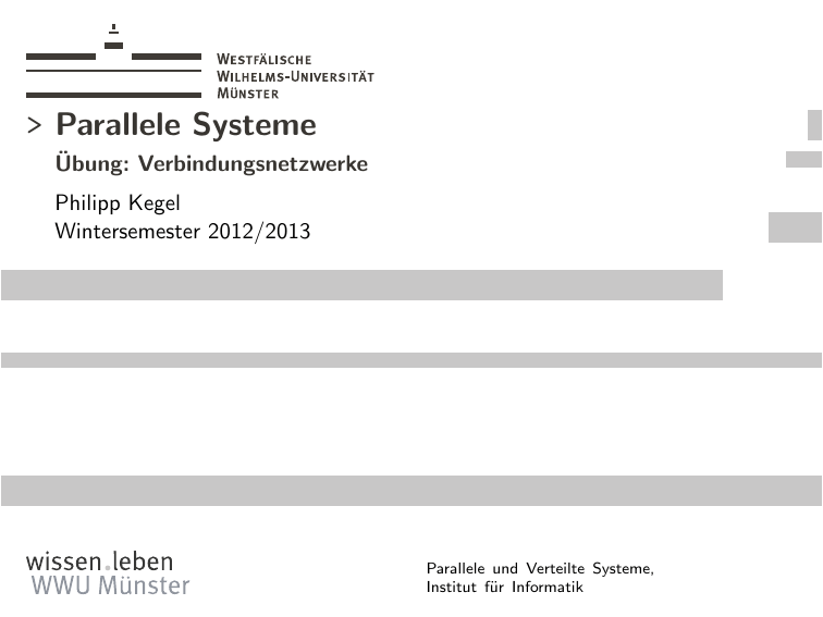 > Parallele Systeme Übung: Verbindungsnetzwerke Philipp Kegel Wintersemester 2012/2013 Parallele und Verteilte Systeme, Institut für Informatik Inhaltsverzeichnis 1 Verbindungsnetzwerke Topologien Kosten-Leistungs-Verhältnis PS, Übung Verbindungsnetzwerke WS 2012/13 Philipp Kegel 2 Bewertungskriterien für Topologien Größe: Anzahl von Knoten und/oder Kanten Durchmesser: maximale Distanz zwischen zwei beliebigen Knoten → Signallaufzeit Knotengrad: maximale Anzahl Kanten eines Knotens → Kosten, Skalierbarkeit Bisektionsbreite: minimale Anzahl Kanten, die entfernt werden müssen, um das Netzwerk in zwei gleich große (±1), getrennte Teile zu zerlegen → Durchsatz Konnektivität: minimale Anzahl Kanten, die entfernt werden müssen, um das Netzwerk in zwei getrennte Teile zu zerlegen → Zuverlässigkeit PS, Übung Verbindungsnetzwerke WS 2012/13 Philipp Kegel 3 Ring • Größe: n Knoten, n Kanten • Durchmesser: ⌊ n2 ⌋ • Knotengrad: 2 • Bisektionsbreite: 2 • Konnektivität: 2 • Beispiel: Token-Ring-Netzwerk PS, Übung Verbindungsnetzwerke WS 2012/13 Philipp Kegel 4 Stern • Größe: n Knoten, n − 1 Kanten • Durchmesser: 2 • Knotengrad: n − 1 • Bisektionsbreite: ⌊ n2 ⌋ • Konnektivität: 1 • Beispiel: Ethernetverkabelung • Rechner an einem Switch/Hub: Stern • Innerhalb des Switch/Hub: dynamisches Netzwerk (Crossbar bei Switch, Bus bei Hub) PS, Übung Verbindungsnetzwerke WS 2012/13 Philipp Kegel 5 d-dimensionaler Torus ( 1, 1 ) ( 1, 2 ) ( 1, 3 ) ( 2, 1 ) ( 2, 2 ) ( 2, 3 ) ( 3, 1 ) ( 3, 2 ) ( 3, 3 ) • Größe: n = n1 · . . . · nd Knoten, n · d Kanten • Durchmesser: Pd ni i=1 ⌊ 2 ⌋, bzw. d⌊ √ d n 2 ⌋, falls n1 = . . . = nd • Knotengrad: 2d • Bisektionsbreite: 2n d−1 d , falls n1 = . . . = nd • Konnektivität: 2d PS, Übung Verbindungsnetzwerke WS 2012/13 Philipp Kegel 6 Kosten-Leistungs-Verhältnis Beispiel: n Knoten (n ≥ 4) sollen zu einem quadratischem 2D-Gitter oder einem Hypercube verbunden werden Kosten Annahme: die Kosten eines Netzwerk sind proportional zur Anzahl der Leitungen • Kantenzahl 2n • Hypercube: n log Kanten 2 • 2D-Gitter: 2n Kanten ⇒ gleiche Kosten für Hyperwürfel mit einer Leitung je Kante und 2D-Gitter mit log42 n Leitungen je Kante PS, Übung Verbindungsnetzwerke WS 2012/13 Philipp Kegel 7 Kosten-Leistungs-Verhältnis Leistung • Durchschnittlicher Abstand lav √ • 2D-Gitter: 2n • Hypercube: log22 n ⇒ Durchschnittliche Übertragungszeit einer Nachricht der Länge m entspricht der Summe von Initialisierungszeit (Startup), der Zeit für die Zwischenspeicherung je Knoten (hop) und Übertragungszeit je Wort (ts + th lav + tw m) • Hypercube: ts + √ n 4tw m + log 2 2n log2 n th 2 + tw m • 2D-Gitter: ts + th PS, Übung Verbindungsnetzwerke WS 2012/13 Philipp Kegel 8 Kosten-Leistungs-Verhältnis 2D-Gitter: ts + th √ n 2 + 4tw m log2 n Hypercube: ts + th log2 n 2 + tw m • Für eine feste Anzahl von Knoten bestimmt die Länge einer Nachricht die Übertragungszeit ⇒ für n > 16 und genügend großes m ist die Übertragungszeit im 2D-Gitter geringer als im Hypercube • Bei steigender Netzlast, kann der Hypercube effizienter sein • Algorithmen, deren Kommunikationsstruktur für ein 2D-Gitter optimiert ist, profitieren von den zusätzlichen Leitungen zwischen den Knoten Anmerkung: die obigen Aussagen gelten nur, falls der Term th von der Länge m einer Nachricht unabhängig ist. Dies ist zum Beispiel beim sog. Cut-Trough-Switching der Fall. PS, Übung Verbindungsnetzwerke WS 2012/13 Philipp Kegel 9 Kosten-Leistungs-Verhältnis Andere Kostenvariante: Kosten proportional zur Bisektionsbreite ⇒ gleiche √ Kosten für Hyperwürfel mit einer Leitung je Kante und 2D-Gitter mit 4n Leitungen je Kante 2D-Gitter: ts + th √ n 2 + 4t√ wm n Hypercube: ts + th log2 n 2 + tw m • Für eine feste Anzahl von Knoten bestimmt die Länge einer Nachricht die Übertragungszeit ⇒ für n > 16 und genügend großes m ist die Übertragungszeit im 2D-Gitter geringer als im Hypercube • Mehr Leitungen (als im ersten Beispiel) zwischen den Knoten ⇒ auch bei hoher Netzlast ist die Leistung des 2D-Gitters nahe an der des Hypercubes PS, Übung Verbindungsnetzwerke WS 2012/13 Philipp Kegel 10