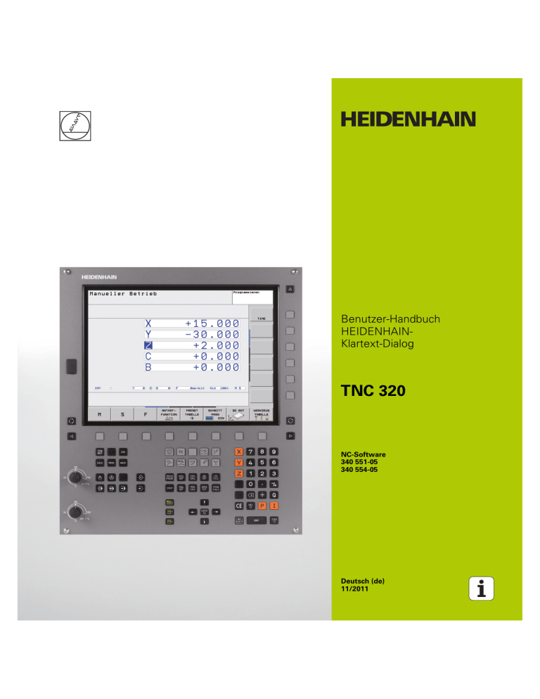 Benutzer-Handbuch HEIDENHAINKlartext-Dialog TNC 320 NC-Software 340 551-05 340 554-05 Deutsch (de) 11/2011 Bedienelemente der TNC Bedienelemente am Bildschirm Taste Programme/Dateien verwalten, TNC-Funktionen Taste Funktion Funktion Programme/Dateien wählen und löschen, externe Datenübertragung Bildschirm-Aufteilung wählen Programm-Aufruf definieren, Nullpunktund Punkte Tabellen wählen Bildschirm zwischen Maschinen- und Programmier-Betriebsart umschalten MOD-Funktion wählen Softkeys: Funktion im Bildschirm wählen Hilfstexte anzeigen bei NCFehlermeldungen, TNCguide aufrufen Softkey-Leisten umschalten Alle anstehenden Fehlermeldungen anzeigen Maschinen-Betriebsarten Taste Taschenrechner einblenden Funktion Manueller Betrieb Navigationstasten Elektronisches Handrad Taste Funktion Hellfeld verschieben Positionieren mit Handeingabe Sätze, Zyklen und Parameter-Funktionen direkt wählen Programmlauf Einzelsatz Potentiometer für Vorschub und Spindeldrehzahl Programmlauf Satzfolge Vorschub Spindeldrehzahl 100 100 Programmier-Betriebsarten Taste Funktion 50 150 50 150 Programm Einspeichern/Editieren 0 F % 0 S % Programm-Test Zyklen, Unterprogramme und ProgrammteilWiederholungen Taste Funktion Tastsystem-Zyklen definieren Zyklen definieren und aufrufen Unterprogramme und ProgrammteilWiederholungen eingeben und aufrufen Programm-Halt in ein Programm eingeben Angaben zu Werkzeugen Taste Funktion Werkzeugdaten im Programm definieren Werkzeugdaten aufrufen Bahnbewegungen programmieren Taste Taste Funktion ... ... Koordinatenachsen wählen bzw. ins Programm eingeben Ziffern Dezimal-Punkt/Vorzeichen umkehren Funktion Kontur anfahren/verlassen Polarkoordinaten Eingabe/ InkrementalWerte Freie Konturprogrammierung FK Q-Parameter-Programmierung/QParameter-Status Gerade Ist-Position, Werte vom Taschenrechner übernehmen Kreismittelpunkt/Pol für Polarkoordinaten Kreisbahn um Kreismittelpunkt Kreisbahn mit Radius Kreisbahn mit tangentialem Anschluss Fase/Ecken-Runden Sonderfunktionen Taste Koordinatenachsen und Ziffern eingeben, Editieren Funktion Sonderfunktionen anzeigen Nächsten Reiter in Formularen wählen Dialogfeld oder Schaltfläche vor/zurück Dialogfragen übergehen und Wörter löschen Eingabe abschließen und Dialog fortsetzen Satz abschließen, Eingabe beenden Zahlenwert-Eingaben rücksetzen oder TNC Fehlermeldung löschen Dialog abbrechen, Programmteil löschen Über dieses Handbuch Über dieses Handbuch Nachfolgend finden Sie eine Liste der in diesem Handbuch verwendeten Hinweis-Symbole Dieses Symbol zeigt Ihnen, dass zur beschriebenen Funktion besondere Hinweise zu beachten sind. Dieses Symbol zeigt Ihnen, dass bei Verwendung der beschriebenen Funktion eine oder mehrere der folgenden Gefahren bestehen: Gefahren für Werkstück Gefahren für Spannmittel Gefahren für Werkzeug Gefahren für Maschine Gefahren für Bediener Dieses Symbol zeigt Ihnen, dass die beschriebene Funktion von Ihrem Maschinenhersteller angepasst werden muss. Die beschriebene Funktion kann demnach von Maschine zu Maschine unterschiedlich wirken. Dieses Symbol zeigt Ihnen, dass Sie detailliertere Beschreibungen einer Funktion in einem anderen Benutzer-Handbuch finden. Änderungen gewünscht oder den Fehlerteufel entdeckt? Wir sind ständig bemüht unsere Dokumentation für Sie zu verbessern. Helfen Sie uns dabei und teilen uns bitte Ihre Änderungswünsche unter folgender E-Mail-Adresse mit: [email protected]. HEIDENHAIN TNC 320 5 TNC-Typ, Software und Funktionen TNC-Typ, Software und Funktionen Dieses Handbuch beschreibt Funktionen, die in den TNCs ab den folgenden NC-Software-Nummern verfügbar sind. TNC-Typ NC-Software-Nr. TNC 320 340 551-05 TNC 320 Programmierplatz 340 554-05 Der Maschinenhersteller passt den nutzbaren Leistungsumfang der TNC über Maschinen-Parameter an die jeweilige Maschine an. Daher sind in diesem Handbuch auch Funktionen beschrieben, die nicht an jeder TNC verfügbar sind. TNC-Funktionen, die nicht an allen Maschinen zur Verfügung stehen, sind beispielsweise: Werkzeug-Vermessung mit dem TT Setzen Sie sich bitte mit dem Maschinenhersteller in Verbindung, um den tatsächlichen Funktionsumfang Ihrer Maschine kennenzulernen. Viele Maschinenhersteller und HEIDENHAIN bieten für die TNCs Programmier-Kurse an. Die Teilnahme an solchen Kursen ist empfehlenswert, um sich intensiv mit den TNC-Funktionen vertraut zu machen. Benutzer-Handbuch Zyklenprogrammierung: Alle Zyklen-Funktionen (Tastsystemzyklen und Bearbeitungszyklen sind in einem separaten BenutzerHandbuch beschrieben. Wenden Sie sich ggf. an HEIDENHAIN, wenn Sie dieses Benutzer-Handbuch benötigen. ID: 679 220-xx 6 TNC-Typ, Software und Funktionen Software-Optionen Die TNC 320 verfügt über verschiedene Software-Optionen, die von Ihrem Maschinenhersteller freigeschaltet werden können. Jede Option ist separat freizuschalten und beinhaltet jeweils die nachfolgend aufgeführten Funktionen: Hardware-Optionen Zusatzachse für 4 Achsen und ungeregelte Spindel Zusatzachse für 5 Achsen und ungeregelte Spindel Software-Option 1 (Optionsnummer #08) Zylindermantel-Interpolation (Zyklen 27, 28 und 29) Vorschub in mm/min bei Rundachsen: M116 Schwenken der Bearbeitungsebene (Plane-Funktionen, Zyklus 19 und Softkey 3D-ROT in der Betriebsart Manuell) Kreis in 3 Achsen bei geschwenkter Bearbeitungsebene Entwicklungsstand (Upgrade-Funktionen) Neben Software-Optionen werden wesentliche Weiterentwicklungen der TNC-Software über Upgrade-Funktionen, den sogenannten Feature Content Level (engl. Begriff für Entwicklungsstand), verwaltet. Funktionen die dem FCL unterliegen, stehen Ihnen nicht zur Verfügung, wenn Sie an Ihrer TNC einen Software-Update erhalten. Wenn Sie eine neue Maschine erhalten, dann stehen Ihnen alle Upgrade-Funktionen ohne Mehrkosten zur Verfügung. Upgrade-Funktionen sind im Handbuch mit FCL n gekennzeichnet, wobei n die fortlaufende Nummer des Entwicklungsstandes kennzeichnet. Sie können durch eine käuflich zu erwerbende Schlüsselzah