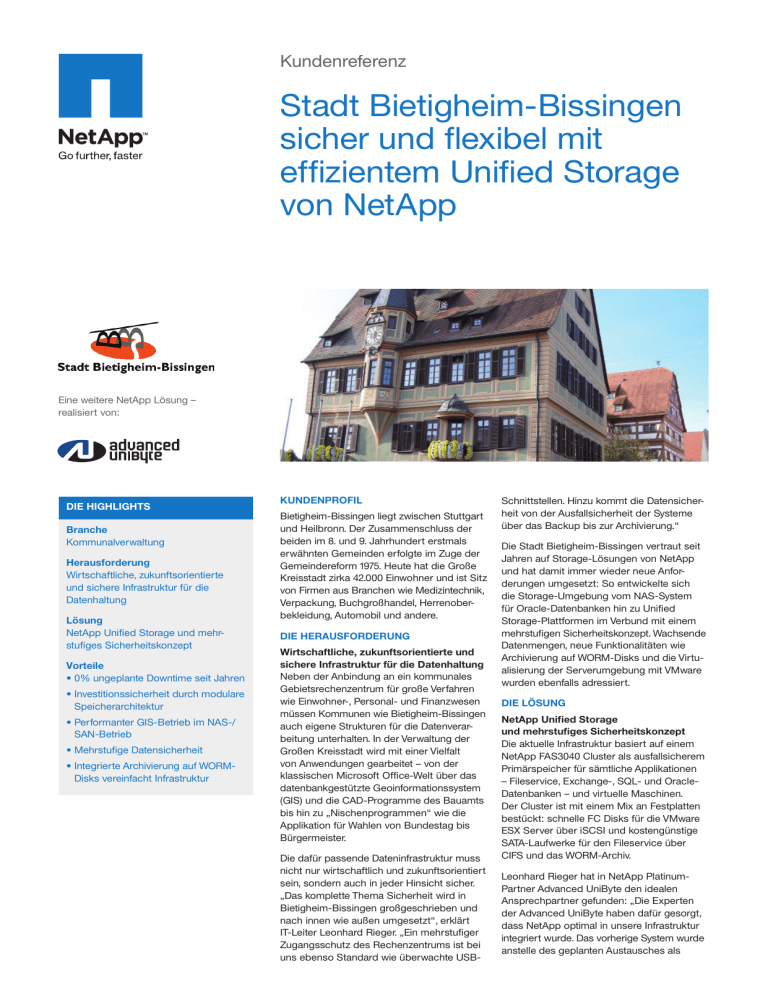 Kundenreferenz Stadt Bietigheim-Bissingen sicher und flexibel mit effizientem Unified Storage von NetApp Eine weitere NetApp Lösung – realisiert von: DIE HIGHLIGHTS Branche Kommunalverwaltung Herausforderung Wirtschaftliche, zukunftsorientierte und sichere Infrastruktur für die Datenhaltung Lösung NetApp Unified Storage und mehrstufiges Sicherheitskonzept Vorteile • 0% ungeplante Downtime seit Jahren • Investitionssicherheit durch modulare Speicherarchitektur • Performanter GIS-Betrieb im NAS-/ SAN-Betrieb • Mehrstufige Datensicherheit • Integrierte Archivierung auf WORMDisks vereinfacht Infrastruktur KUNDENPROFIL Bietigheim-Bissingen liegt zwischen Stuttgart und Heilbronn. Der Zusammenschluss der beiden im 8. und 9. Jahrhundert erstmals erwähnten Gemeinden erfolgte im Zuge der Gemeindereform 1975. Heute hat die Große Kreisstadt zirka 42.000 Einwohner und ist Sitz von Firmen aus Branchen wie Medizintechnik, Verpackung, Buchgroßhandel, Herrenoberbekleidung, Automobil und andere. DIE HERAUSFORDERUNG Wirtschaftliche, zukunftsorientierte und sichere Infrastruktur für die Datenhaltung Neben der Anbindung an ein kommunales Gebietsrechenzentrum für große Verfahren wie Einwohner-, Personal- und Finanzwesen müssen Kommunen wie Bietigheim-Bissingen auch eigene Strukturen für die Datenverarbeitung unterhalten. In der Verwaltung der Großen Kreisstadt wird mit einer Vielfalt von Anwendungen gearbeitet – von der klassischen Microsoft Office-Welt über das datenbankgestützte Geoinformationssystem (GIS) und die CAD-Programme des Bauamts bis hin zu „Nischenprogrammen“ wie die Applikation für Wahlen von Bundestag bis Bürgermeister. Die dafür passende Dateninfrastruktur muss nicht nur wirtschaftlich und zukunftsorientiert sein, sondern auch in jeder Hinsicht sicher. „Das komplette Thema Sicherheit wird in Bietigheim-Bissingen großgeschrieben und nach innen wie außen umgesetzt“, erklärt IT-Leiter Leonhard Rieger. „Ein mehrstufiger Zugangsschutz des Rechenzentrums ist bei uns ebenso Standard wie überwachte USB- Schnittstellen. Hinzu kommt die Datensicherheit von der Ausfallsicherheit der Systeme über das Backup bis zur Archivierung.“ Die Stadt Bietigheim-Bissingen vertraut seit Jahren auf Storage-Lösungen von NetApp und hat damit immer wieder neue Anforderungen umgesetzt: So entwickelte sich die Storage-Umgebung vom NAS-System für Oracle-Datenbanken hin zu Unified Storage-Plattformen im Verbund mit einem mehrstufigen Sicherheitskonzept. Wachsende Datenmengen, neue Funktionalitäten wie Archivierung auf WORM-Disks und die Virtualisierung der Serverumgebung mit VMware wurden ebenfalls adressiert. DIE LÖSUNG NetApp Unified Storage und mehrstufiges Sicherheitskonzept Die aktuelle Infrastruktur basiert auf einem NetApp FAS3040 Cluster als ausfallsicherem Primärspeicher für sämtliche Applikationen – Fileservice, Exchange-, SQL- und OracleDatenbanken – und virtuelle Maschinen. Der Cluster ist mit einem Mix an Festplatten bestückt: schnelle FC Disks für die VMware ESX Server über iSCSI und kostengünstige SATA-Laufwerke für den Fileservice über CIFS und das WORM-Archiv. Leonhard Rieger hat in NetApp PlatinumPartner Advanced UniByte den idealen Ansprechpartner gefunden: „Die Experten der Advanced UniByte haben dafür gesorgt, dass NetApp optimal in unsere Infrastruktur integriert wurde. Das vorherige System wurde anstelle des geplanten Austausches als “Das Schöne ist, dass sich NetApp Storage den Business-Anforderungen anpasst und nicht umgekehrt.” Leonhard Rieger IT-Leiter, Stadt Bietigheim-Bissingen Disaster-Schutz gleich mit eingebunden. Servervirtualisierung, Backup und Archivierung wurden ebenfalls berücksichtigt, so dass wir gemeinsam eine nahezu perfekte Lösung erreicht haben.“ Ein NetApp FAS3020 System ist mehrere Kilometer vom Hauptrechenzentrum entfernt installiert und dient als Backup- und Disaster Recovery-Plattform. Per SnapMirror wird der mehrmals täglich per Snapshot gesicherte Datenbestand repliziert. Dies gilt auch für das Archiv, dessen Inhalte auf diese Weise zusätzlich geschützt werden. Archiviert werden vor allem Buchungsbelege der Stadtkasse, die 15 Jahre unveränderbar und lesbar aufbewahrt werden müssen. Die VMware-Umgebung mit drei ESX-Servern und 16 virtuellen Maschinen für Domain Controller, Server für Datenbanken, Applikationen, Web, Internet Security und anderes kommuniziert per iSCSI mit den VMware DataStores auf dem zentralen Storage. Das Management der ESX Server und VMs erfolgt über VMware Virtual Center und VMware Infrastructure Client. DIE VORTEILE Flexibilität, Effizienz und Sicherheit Konsolidierung, Zentralisierung und Virtualisierung haben die IT der Stadt BietigheimBissingen seit Einführung des ersten Netzwerkspeichers 2004 deutlich verändert. Es entstand nicht nur eine flexible, sichere und einfach zu managende Storage-Infrastruktur. Auch die Wirtschaftlichkeit, Effizienz und Zukunftsorientierung der Investitionen wurde immer wieder unter Beweis gestellt. Der hohe Konsolidierungsgrad der Architektur trägt ebenso dazu bei wie die im Betriebssystem verankerte Deduplizierung. Leonhard Rieger hat sie auf allen Systemen aktiviert und spart dadurch knapp 20% Speicherkapazität. Die Virtualisierung der Festplatten zu einem reinen Kapazitätspool sorgt für maximale Ressourcenauslastung, da sich buchstäblich jedes Megabyte schnell, einfach und flexibel nutzen lässt. www.netapp.de NetApp Snapshot-Technologie macht das Backup schnell und platzsparend, da sie nur veränderte Datenblöcke erfasst. „Das Problem ist ja weniger das Datenwachstum als die Zeit für das Backup und die ständige Anpassung der Abläufe“, so IT-Leiter Rieger. „Mit den NetApp Snapshots haben wir das Optimum erreicht, mehrere online Tagessicherungen, Replizierung von Disk zu Disk und Bandsicherung. Advanced UniByte hat alles so getaktet, dass Engpässe ausgeschlossen sind. Da wir im Ernstfall den Datenservice vom Backup Stor