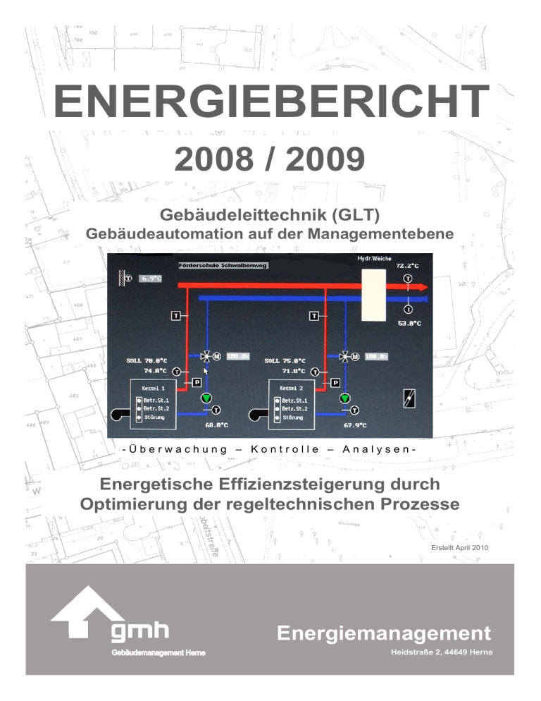 ENERGIEBERICHT 2008 / 2009 Gebäudeleittechnik (GLT) Gebäudeautomation auf der Managementebene -Überwachung – Kontrolle – Analysen- Energetische Effizienzsteigerung durch Optimierung der regeltechnischen Prozesse Erstellt April 2010 Energiemanagement Heidstraße 2, 44649 Herne ENERGIEBERICHT 2008 / 2009 Inhaltsverzeichnis ENERGIEBERICHT 2008/2009 …………………….……. 3 …………………………………………. 7 1. Verbrauchsanalyse Wärme / Strom / Wasser 2008 / 2009 zu 2007 , Statistik 2. Beurteilung Wärme 2008 / 2009 witterungsbereinigt, Statistik 3. Kostenanalyse Wärme / Strom / Wasser …………………………………. 2008 / 2009 zu 2007 , Statistik 11 4. Kostenprognose Wärme / Strom / Wasser ………………………….…… 2010 und 2011 17 5. Haushaltsansatz / Vorauszahlung / Abrechnung Energiebudget 2008 / 2009 (kaufm. Rechnungsergebnis) ……..….… 21 6. Sachstandsbericht Energieausweise für städtische Gebäude …..…. 25 7. Gebäudeleittechnik (GLT), Regeltechnik, Sachstandsbericht Energiekontrolle......................................................................................... 29 8. Energetische Bewertung Konjunkturpaket II / Investitionspakt …...... 35 9. Sachstandsbericht rationelle Energieverwendung in städtischen Immobilien ……………………..…………………………………….…..… 39 9.1 Energieeffizienzkampagne „mission E“ ………………………..… 43 9.2 Dienstanweisung Energie …..............…………………........….… 47 9.3 Arbeitsanweisung Energie für Hausmeister / Schulungen……… 49 9.4 Leitlinien zum ökologischen und wirtschaftlichen Bauen ….…. 53 Seite 1 ENERGIEBERICHT 2008 / 2009 10. Bauliche und technische Maßnahmen 10.1 Bautechnik 10.1.1 Grundschule Vellwigstraße ……………………………… 57 10.1.2 Kindertagesstätte Pantrings Hof ………………………… 61 10.2 Technik 10.2.1 Grundschule Overwegstraße …………………………. Impressum …………….....……………………………………………………....... Seite 2 65 69 ENERGIEBERICHT 2008 / 2009 1. Verbrauchsanalyse Wärme / Strom / Wasser Wärme Die nachfolgende Tabelle / Diagramm 1 zeigt die Verbrauchsentwicklung Wärme aller städtischen Liegenschaften. Die Darstellung umfasst die Verbrauchsjahre 2004-2009 mit absoluter und prozentualer Verbrauchsstatistik, gegliedert nach unterschiedlichen Energieträgern, Versorgern und Tarifen. Dargestellt werden die realen Verbräuche ohne Berücksichtigung der Witterung. Tabelle 1 Diagramm 1 Für die Versorgung aller städtischen Liegenschaften mit Wärme der Träger Gas, Fernwärme sowie Sonstige waren im Verbrauchsjahr 2008 real rd. 63.200.000 kWh notwendig. Bezogen auf das Verbrauchsjahr 2007 ergab sich 2008 eine ausschließlich witterungsbedingte Verbrauchserhöhung von 3% und absolut von rd. 1.777.000 kWh. Der Vergleich der Verbrauchsjahre 2007 zu 2009 ist mit rd. 61.400.000 kWh zu 61.700.000 kWh in dieser Größenordnung als gleich zu bezeichnen. In der Statistik der Verbrauchsjahre 2004-2009 zeigt sich der reale Verbrauch trotz unterschiedlicher Witterungseinflüsse mit einer Verbrauchsreduzierung von 13 %. Im direkten Vergleich der Verbrauchsjahre 2004 zu 2009 hat sich der Verbrauch real um 9.645.233 kWh reduziert. Diese Verbrauchseinsparung entspräche bei einer gleichbleibenden Preisbasis einer Kosteneinsparung von 579.000 €. Seite 3 ENERGIEBERICHT 2008 / 2009 Die Verbrauchsreduzierung von 13% hat auch den CO2- Ausstoß um real 2025 t verringert. Wie schon im Energiebericht 2007 erläutert, kann trotz Witterungseinflüsse in der realen Verbrauchsstatistik 2004-2009 eine deutliche Verbrauchsreduzierung festgestellt werden, die sowohl durch energetisch optimierte Instandhaltungsmaßnahmen aber immer deutlicher durch die nachfolgend beispielhaft aufgeführten Maßnahmen des Energiemanagements erreicht wurden. - Energiekontrolle Optimierung der Regelparameter Optimierung der Regeltechnik Optimierung der Raum- und Wassertemperaturen Hausmeisterschulung Teil 1 Weitergehende Erläuterung werden unter dem Punkt 2 „Beurteilung Wärme 2008/2009 witterungsbereinigt“ sowie Punkt 7 „Gebäudeleittechnik (GLT), Regeltechnik, Sachstandsbericht Energiekontrolle „ dargestellt. Strom Die nachfolgende Tabelle / Diagramm 2 zeigt die Verbrauchsentwicklung Strom aller städtischen Liegenschaften. Die Darstellung umfasst die Verbrauchsjahre 20042009 mit absoluter und prozentualer Verbrauchsstatistik, gegliedert nach den Tarifen SA Strom (Sonderabnehmer Strom, Mittelspannung), Sondertarif (Niederspannung mit Lastgangzählung) und TA Strom (Tarifabnehmer Strom, Niederspannung). Tabelle 2 Diagramm 2 Seite 4 ENERGIEBERICHT 2008 / 2009 Für die Versorgung aller Liegenschaften mit Strom wurden im Verbrauchsjahr 2008 rd. 13.840.000 kWh und im Verbrauchsjahr 2009 rd. 13.560.000 kWh benötigt. Die prozentualen aber auch absoluten Verbrauchsunterschiede innerhalb der einzelnen Tarifgruppen begründen sich durch allg. Verbrauchsschwankungen und durch verbrauchsbedingte Tarifgruppenwechsel, die im Rahmen der Kosten nicht relevant sind. Grundsätzlich zeigt die Statistik, dass der Stromverbrauch trotz verstärkten Bedarfs an Informations- und Kommunikationstechnik mit vielfältigem Einsatz an EDV sowie notwendiger technischer Kühlung in den letzten Jahren stabil gehalten werden konnte. Zeigt sich der Stromverbrauch für 2008 in der Gesamtstatistik als stabil, so kann der um rd. 270.000 kWh verringerte Stromverbrauch für das Versorgungsjahr 2009 als eine außerhalb der Schwankungsbreite zu wertende Reduzierung des Stromverbrauchs gewertet werden. Unter den Punkten 7,8 und 9 des Energieberichts 2008/2009 werden Maßnahmen vorgestellt, bei denen in den Folgejahren auch im Bereich der Stromversorgung eine deutliche Verbrauchsreduzierung erwartet wird. Wasser Wie regelmäßig erläutert ist der Wasserverbrauch von den Faktoren - Anzah