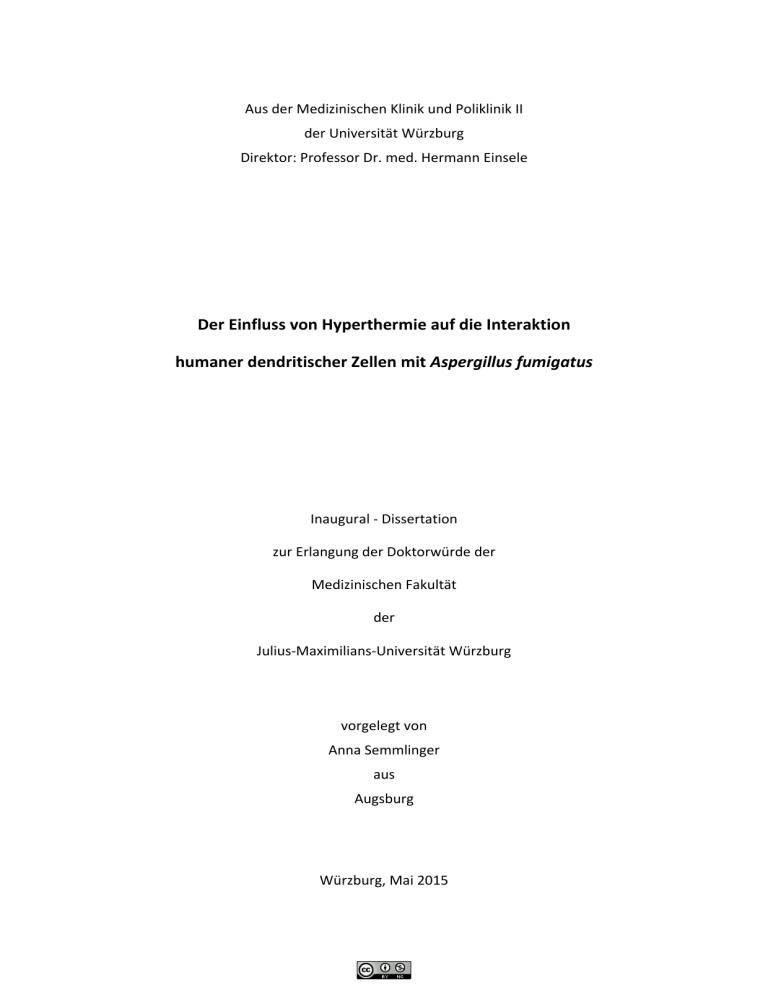 Aus der Medizinischen Klinik und Poliklinik II der Universität Würzburg Direktor: Professor Dr. med. Hermann Einsele Der Einfluss von Hyperthermie auf die Interaktion humaner dendritischer Zellen mit Aspergillus fumigatus Inaugural - Dissertation zur Erlangung der Doktorwürde der Medizinischen Fakultät der Julius-Maximilians-Universität Würzburg vorgelegt von Anna Semmlinger aus Augsburg Würzburg, Mai 2015 Referent: Professor Dr. rer. nat. Jürgen Löffler Korreferent: Professor Dr. med. Matthias Eyrich Dekan: Professor Dr. med. Matthias Frosch Tag der mündlichen Prüfung: Die Promovendin ist Ärztin. 29.01.2016 Inhaltsverzeichnis 1 Einleitung .......................................................................................... 1 1.1 1.1.1 Pathobiologie von A. fumigatus ............................................................................ 1 1.1.2 Medizinische Bedeutung von A. fumigatus........................................................... 3 1.1.3 Invasive Aspergillose ............................................................................................. 4 1.2 2 Aspergillus fumigatus ................................................................................... 1 Bedeutung von DCs für die Immunantwort gegen A. fumigatus ................... 7 1.2.1 DCs als Teil des angeborenen Immunsystems ...................................................... 7 1.2.2 Funktionen von DCs .............................................................................................. 8 1.2.2.1 Erkennung und Phagozytose von Pathogenen .............................................................. 8 1.2.2.2 Reifung und Migration in Lymphknoten ........................................................................ 9 1.2.2.3 Freisetzung von Zytokinen und Chemokinen............................................................... 10 1.2.2.4 Antigenpräsentation und T-Zell-Aktivierung................................................................ 11 1.3 Fieber bei Infektionen ................................................................................ 13 1.4 Zielsetzung der Arbeit................................................................................. 16 Material und Methoden .................................................................. 19 2.1 Material ..................................................................................................... 19 2.1.1 Geräte .................................................................................................................. 19 2.1.2 Verbrauchsmaterialien ........................................................................................ 20 2.1.3 Reagenzien, Medien und Zytokine ...................................................................... 20 2.1.4 Kits ....................................................................................................................... 21 2.1.5 FACS-Antikörper und Beads ................................................................................ 21 2.1.6 Primer .................................................................................................................. 22 2.1.7 Zellen und Stämme.............................................................................................. 23 2.1.8 Software .............................................................................................................. 23 2.2 Methoden .................................................................................................. 23 2.2.1 Modellsystem monozytäre DCs........................................................................... 23 2.2.1.1 Isolierung von Monozyten ........................................................................................... 23 2.2.1.2 Generierungsprozess von moDCs ................................................................................ 25 2.2.2 Arbeiten mit A. fumigatus ................................................................................... 25 3 2.2.3 Stimulation von DCs mit Zymosan oder A. fumigatus......................................... 26 2.2.4 Durchflusszytometrie .......................................................................................... 27 2.2.5 Analyse der Viabilität .......................................................................................... 28 2.2.6 Analyse der Zytokinexpression und -sekretion ................................................... 30 2.2.6.1 RNA-Extraktion ............................................................................................................ 30 2.2.6.2 cDNA-Umschrieb.......................................................................................................... 31 2.2.6.3 Real-Time PCR – Genexpression .................................................................................. 32 2.2.6.4 Human Cytokine 10-Plex Panel – Zytokinsekretion ..................................................... 35 2.2.7 Analyse der Antigenaufnahme ............................................................................ 36 2.2.8 Analyse der Oberflächenmarkerexpression ........................................................ 39 2.2.9 Statistik ................................................................................................................ 40 Ergebnisse ....................................................................................... 41 3.1 Erfolgreiche Generierung von DCs aus Monozyten ..................................... 41 3.2 Viabilität von DCs unter Hyperthermie ....................................................... 43 3.2.1 Vorversuchsreihe zur Apoptoserate von DCs unter Hyperthermie .................... 43 3.2.2 Apoptoserate von DCs bei 24 h Inkubation unter Hyperthermie ....................... 45 3.2.3 Anteil toter DCs bei 24 h Inkubation unter Hyperthermie .................................. 46 3.3 Zytokinexpression und -sekretion durch DCs unter Hyperthermie .............. 47 3.