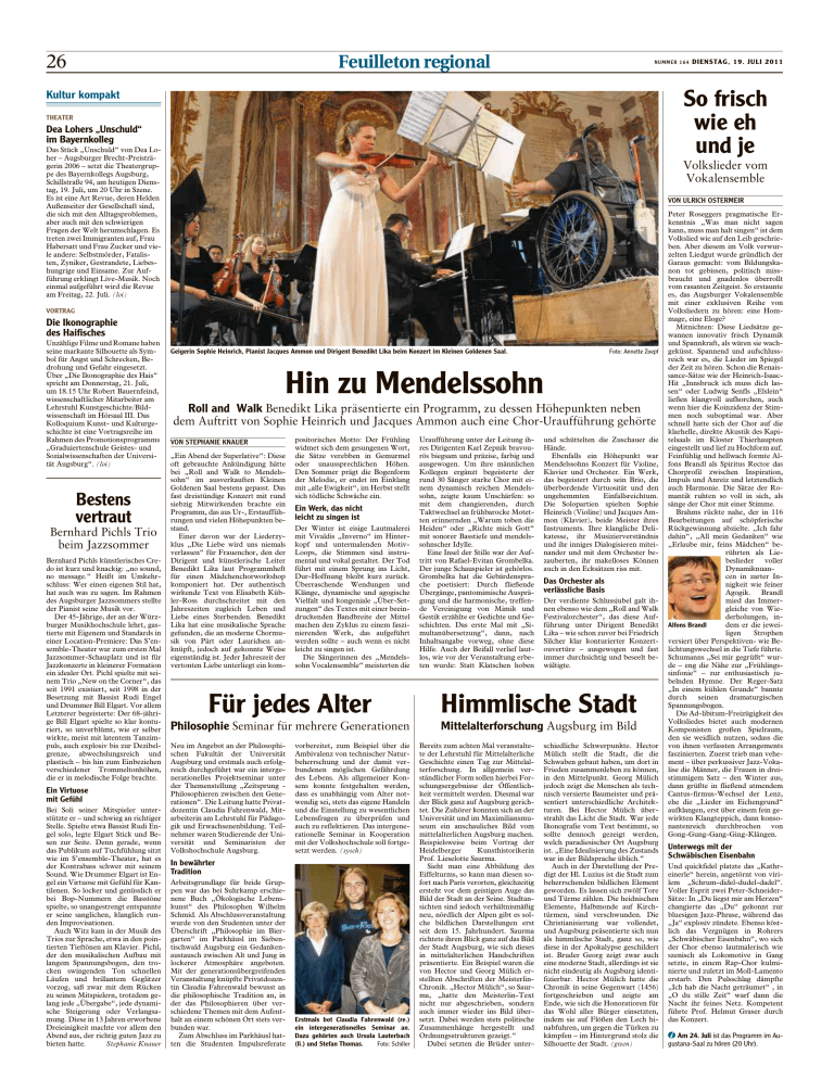 26 Feuilleton regional NUMMER 164 So frisch wie eh und je Kultur kompakt THEATER Dea Lohers „Unschuld“ im Bayernkolleg Das Stück „Unschuld“ von Dea Loher – Augsburger Brecht-Preisträgerin 2006 – setzt die Theatergruppe des Bayernkollegs Augsburg, Schillstraße 94, am heutigen Dienstag, 19. Juli, um 20 Uhr in Szene. Es ist eine Art Revue, deren Helden Außenseiter der Gesellschaft sind, die sich mit den Alltagsproblemen, aber auch mit den schwierigen Fragen der Welt herumschlagen. Es treten zwei Immigranten auf, Frau Habersatt und Frau Zucker und viele andere: Selbstmörder, Fatalisten, Zyniker, Gestrandete, Liebeshungrige und Einsame. Zur Aufführung erklingt Live-Musik. Noch einmal aufgeführt wird die Revue am Freitag, 22. Juli. (loi) Volkslieder vom Vokalensemble VON ULRICH OSTERMEIR VORTRAG Die Ikonographie des Haifisches Unzählige Filme und Romane haben seine markante Silhouette als Symbol für Angst und Schrecken, Bedrohung und Gefahr eingesetzt. Über „Die Ikonographie des Hais“ spricht am Donnerstag, 21. Juli, um 18.15 Uhr Robert Bauernfeind, wissenschaftlicher Mitarbeiter am Lehrstuhl Kunstgeschichte/Bildwissenschaft im Hörsaal III. Das Kolloquium Kunst- und Kulturgeschichte ist eine Vortragsreihe im Rahmen des Promotionsprogramms „Graduiertenschule Geistes- und Sozialwissenschaften der Universität Augsburg“. (loi) Bestens vertraut Bernhard Pichls Trio beim Jazzsommer Bernhard Pichls künstlerisches Credo ist kurz und knackig: „no sound, no message.“ Heißt im Umkehrschluss: Wer einen eigenen Stil hat, hat auch was zu sagen. Im Rahmen des Augsburger Jazzsommers stellte der Pianist seine Musik vor. Der 45-Jährige, der an der Würzburger Musikhochschule lehrt, gastierte mit Eigenem und Standards in einer Location-Premiere: Das S’ensemble-Theater war zum ersten Mal Jazzsommer-Schauplatz und ist für Jazzkonzerte in kleinerer Formation ein idealer Ort. Pichl spielte mit seinem Trio „New on the Corner“, das seit 1991 existiert, seit 1998 in der Besetzung mit Bassist Rudi Engel und Drummer Bill Elgart. Vor allem Letzterer begeisterte: Der 68-jährige Bill Elgart spielte so klar konturiert, so unverblümt, wie er selber wirkte, meist mit latentem Tanzimpuls, auch explosiv bis zur Dezibelgrenze, abwechslungsreich und plastisch – bis hin zum Einbeziehen verschiedener Trommeltonhöhen, die er in melodische Folge brachte. Ein Virtuose mit Gefühl Bei Soli seiner Mitspieler unterstützte er – und schwieg an richtiger Stelle. Spielte etwa Bassist Rudi Engel solo, legte Elgart Stick und Besen zur Seite. Denn gerade, wenn das Publikum auf Tuchfühlung sitzt wie im S’ensemble-Theater, hat es der Kontrabass schwer mit seinem Sound. Wie Drummer Elgart ist Engel ein Virtuose mit Gefühl für Kantilenen. So locker und genüsslich er bei Bop-Nummern die Basstöne spielte, so unangestrengt entspannte er seine sanglichen, klanglich runden Improvisationen. Auch Witz kam in der Musik des Trios zur Sprache, etwa in den pointierten Tieftönen am Klavier. Pichl, der den musikalischen Aufbau mit langem Spannungsbogen, den trocken swingenden Ton schnellen Läufen und brillantem Geglitzer vorzog, saß zwar mit dem Rücken zu seinen Mitspielern, trotzdem gelang jede „Übergabe“, jede dynamische Steigerung oder Verlangsamung. Diese in 13 Jahren erworbene Dreieinigkeit machte vor allem den Abend aus, der richtig guten Jazz zu bieten hatte. Stephanie Knauer DIENSTAG, 19. JULI 2011 Geigerin Sophie Heinrich, Pianist Jacques Ammon und Dirigent Benedikt Lika beim Konzert im Kleinen Goldenen Saal. Foto: Annette Zoepf Hin zu Mendelssohn Roll and Walk Benedikt Lika präsentierte ein Programm, zu dessen Höhepunkten neben dem Auftritt von Sophie Heinrich und Jacques Ammon auch eine Chor-Uraufführung gehörte VON STEPHANIE KNAUER „Ein Abend der Superlative“: Diese oft gebrauchte Ankündigung hätte bei „Roll and Walk to Mendelssohn“ im ausverkauften Kleinen Goldenen Saal bestens gepasst. Das fast dreistündige Konzert mit rund siebzig Mitwirkenden brachte ein Programm, das aus Ur-, Erstaufführungen und vielen Höhepunkten bestand. Einer davon war der Liederzyklus „Die Liebe wird uns niemals verlassen“ für Frauenchor, den der Dirigent und künstlerische Leiter Benedikt Lika laut Programmheft für einen Mädchenchorworkshop komponiert hat. Der authentisch wirkende Text von Elisabeth Kübler-Ross durchschreitet mit den Jahreszeiten zugleich Leben und Liebe eines Sterbenden. Benedikt Lika hat eine musikalische Sprache gefunden, die an moderne Chormusik von Pärt oder Lauridsen anknüpft, jedoch auf gekonnte Weise eigenständig ist. Jeder Jahreszeit der vertonten Liebe unterliegt ein kom- positorisches Motto: Der Frühling widmet sich dem gesungenen Wort, die Sätze verebben in Gemurmel oder unaussprechlichen Höhen. Den Sommer prägt die Bogenform der Melodie, er endet im Einklang mit „alle Ewigkeit“, im Herbst stellt sich tödliche Schwäche ein. Ein Werk, das nicht leicht zu singen ist Der Winter ist eisige Lautmalerei mit Vivaldis „Inverno“ im Hinterkopf und untermalenden MotivLoops, die Stimmen sind instrumental und vokal gestaltet. Der Tod führt mit einem Sprung ins Licht, Dur-Hoffnung bleibt kurz zurück. Überraschende Wendungen und Klänge, dynamische und agogische Vielfalt und kongeniale „Über-Setzungen“ des Textes mit einer beeindruckenden Bandbreite der Mittel machen den Zyklus zu einem faszinierenden Werk, das aufgeführt werden sollte – auch wenn es nicht leicht zu singen ist. Die Sängerinnen des „Mendelssohn Vocalensemble“ meisterten die Uraufführung unter der Leitung ihres Dirigenten Karl Zepnik bravourös biegsam und präzise, farbig und ausgewogen. Um ihre männlichen Kollegen ergänzt begeisterte der rund 30 Sänger starke Chor mit einem dynamisch reichen Mendelssohn, zeigte kaum Unschärfen: so mit dem changierenden, durch Taktwechsel an frühbarocke Motetten erinnernden „Warum toben die Heiden“ oder „Richte mich Gott