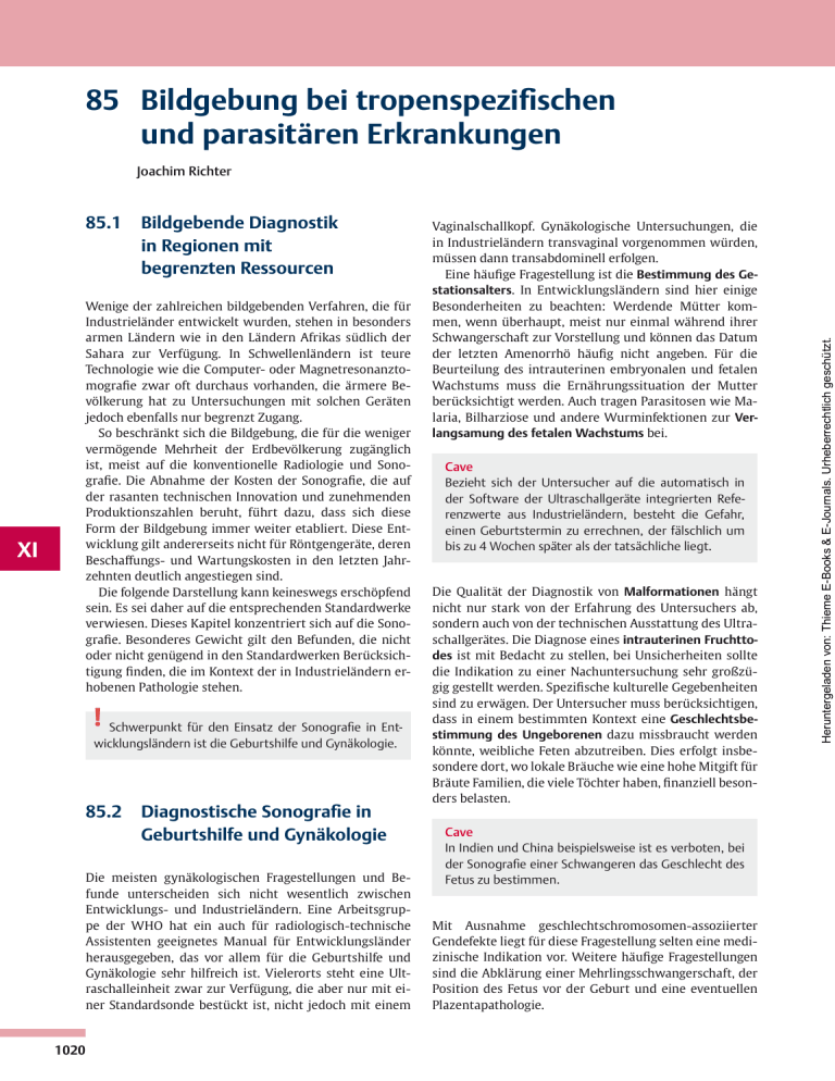 III IV V VI VII VIII IX X XI XII XIII Joachim Richter 85.1 Bildgebende Diagnostik in ­Regionen mit begrenzten Ressourcen Wenige der zahlreichen bildgebenden Verfahren, die für Industrieländer entwickelt wurden, stehen in besonders armen Ländern wie in den Ländern Afrikas südlich der Sahara zur Verfügung. In Schwellenländern ist teure Technologie wie die Computer- oder Magnetresonanztomografie zwar oft durchaus vorhanden, die ärmere Bevölkerung hat zu Untersuchungen mit solchen Geräten jedoch ebenfalls nur begrenzt Zugang. So beschränkt sich die Bildgebung, die für die weniger vermögende Mehrheit der Erdbevölkerung zugänglich ist, meist auf die konventionelle Radiologie und Sonografie. Die Abnahme der Kosten der Sonografie, die auf der rasanten technischen Innovation und zunehmenden Produktionszahlen beruht, führt dazu, dass sich diese Form der Bildgebung immer weiter etabliert. Diese Entwicklung gilt andererseits nicht für Röntgengeräte, deren Beschaffungs- und Wartungskosten in den letzten Jahrzehnten deutlich angestiegen sind. Die folgende Darstellung kann keineswegs erschöpfend sein. Es sei daher auf die entsprechenden Standardwerke verwiesen. Dieses Kapitel konzentriert sich auf die Sonografie. Besonderes Gewicht gilt den Befunden, die nicht oder nicht genügend in den Standardwerken Berücksichtigung finden, die im Kontext der in Industrieländern erhobenen Pathologie stehen. ! Schwerpunkt für den Einsatz der Sonografie in Entwicklungsländern ist die Geburtshilfe und Gynäkologie. 85.2 Diagnostische Sonografie in ­Geburtshilfe und Gynäkologie Die meisten gynäkologischen Fragestellungen und Befunde unterscheiden sich nicht wesentlich zwischen Entwicklungs- und Industrieländern. Eine Arbeitsgruppe der WHO hat ein auch für radiologisch-technische Assistenten geeignetes Manual für Entwicklungsländer herausgegeben, das vor allem für die Geburtshilfe und Gynäkologie sehr hilfreich ist. Vielerorts steht eine Ultraschalleinheit zwar zur Verfügung, die aber nur mit einer Standardsonde bestückt ist, nicht jedoch mit einem 1020 Vaginalschallkopf. Gynäkologische Untersuchungen, die in Industrieländern transvaginal vorgenommen würden, müssen dann transabdominell erfolgen. Eine häufige Fragestellung ist die Bestimmung des Gestationsalters. In Entwicklungsländern sind hier einige Besonderheiten zu beachten: Werdende Mütter kommen, wenn überhaupt, meist nur einmal während ihrer Schwangerschaft zur Vorstellung und können das Datum der letzten Amenorrhö häufig nicht angeben. Für die Beurteilung des intrauterinen embryonalen und fetalen Wachstums muss die Ernährungssituation der Mutter berücksichtigt werden. Auch tragen Parasitosen wie Malaria, Bilharziose und andere Wurminfektionen zur Verlangsamung des fetalen Wachstums bei. Cave Bezieht sich der Untersucher auf die automatisch in der Software der Ultraschallgeräte integrierten Referenzwerte aus Industrieländern, besteht die Gefahr, einen Geburtstermin zu errechnen, der fälschlich um bis zu 4 Wochen später als der tatsächliche liegt. Die Qualität der Diagnostik von Malformationen hängt nicht nur stark von der Erfahrung des Untersuchers ab, sondern auch von der technischen Ausstattung des Ul­tra­ schallgerätes. Die Diagnose eines intrauterinen Fruchttodes ist mit Bedacht zu stellen, bei Unsicherheiten sollte die Indikation zu einer Nachuntersuchung sehr großzügig gestellt werden. Spezifische kulturelle Gegebenheiten sind zu erwägen. Der Untersucher muss berücksichtigen, dass in einem bestimmten Kontext eine Geschlechtsbestimmung des Ungeborenen dazu missbraucht werden könnte, weibliche Feten abzutreiben. Dies erfolgt insbesondere dort, wo lokale Bräuche wie eine hohe Mitgift für Bräute Familien, die viele Töchter haben, finanziell besonders belasten. Cave In Indien und China beispielsweise ist es verboten, bei der Sonografie einer Schwangeren das Geschlecht des Fetus zu bestimmen. Mit Ausnahme geschlechtschromosomen-assoziierter Gendefekte liegt für diese Fragestellung selten eine medizinische Indikation vor. Weitere häufige Fragestellungen sind die Abklärung einer Mehrlingsschwangerschaft, der Position des Fetus vor der Geburt und eine eventuellen Plazentapathologie. Heruntergeladen von: Thieme E-Books & E-Journals. Urheberrechtlich geschützt. II 85 Bildgebung bei tropenspezifischen und parasitären Erkrankungen Sonografie endemischer E ­ rkrankungen im Rahmen von Kontrollmaßnahmen Die häufigsten Notfallindikationen in der Geburtshilfe sind der Verdacht auf eine rupturierte extrauterine Schwangerschaft und die Abklärung von Vaginalblutungen. Uterusfibromyome und benigne und maligne Tumoren sind zum Untersuchungszeitpunkt oft bereits sehr voluminös, da Frauen sich häufig erst bei sehr fortgeschrittener Erkrankung vorstellen. Zu berücksichtigen ist, dass auch Bilharziose und Tuberkulose tumorverdächtige Massen hervorrufen können. Die Darstellung vesikovaginaler Fisteln gelingt nur mit Einsatz von Kontrastmitteln. Tropenspezifische gynäkologische Befunde betreffen die Filariose, die urogenitale Bilharziose und das relativ häufige Auftreten der urogenitalen Tuberkulose. Infektiöse und bilharziöse Salpingitiden können zum Tubenverschluss führen und so zur Extrauteringravidität prädisponieren. Verkalkungen können bei Tbc und Bilharziose auftreten. 23 47 6 7 ! Bei jedem tumorverdächtigen Befund müssen diffe- 8 renzialdiagnostisch Tuberkulose und Bilharziose in Betracht gezogen werden. Indikationen der Mammasonografie entsprechen denen in Industrieländern. Tumorverdächtige Befunde sind von Infektionen abzugrenzen, wie Tuberkulose, Myiasis, Sparganose, Gnathostomiasis und anderen Wurminfektionen, die primär oder ektop in der Mamma auftreten können. Eine der bevorzugten Lokalisationen adulter Würmer von Wuchereria bancrofti ist die weibliche Brust. 9 31 11 a 12 85.3 Diagnostische Sonografie in ­anderen Fachrichtungen Die diagnostische Sonografie hat in allen medi