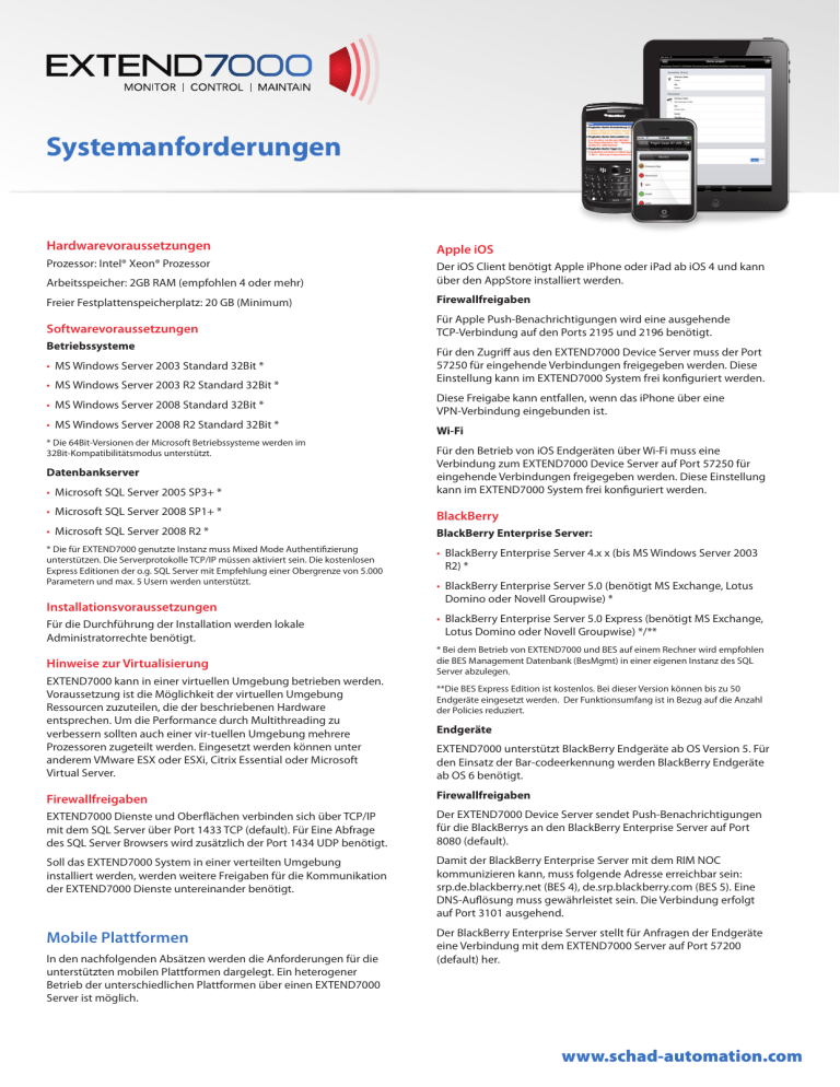 Systemanforderungen # Q *A alt 1 w 2 3 E R ( T 4 5 6 / 7 8 9 ? S D Z aA F C X 0 G V Y ) H B space : ! - _ I U ; , + 0 “ J K L N M $ , . sym @ P del aA Hardwarevoraussetzungen Apple iOS Prozessor: Intel® Xeon® Prozessor Arbeitsspeicher: 2GB RAM (empfohlen 4 oder mehr) Der iOS Client benötigt Apple iPhone oder iPad ab iOS 4 und kann über den AppStore installiert werden. Freier Festplattenspeicherplatz: 20 GB (Minimum) Firewallfreigaben Softwarevoraussetzungen Für Apple Push-Benachrichtigungen wird eine ausgehende TCP-Verbindung auf den Ports 2195 und 2196 benötigt. Betriebssysteme • MS Windows Server 2003 Standard 32Bit * • MS Windows Server 2003 R2 Standard 32Bit * • MS Windows Server 2008 Standard 32Bit * • MS Windows Server 2008 R2 Standard 32Bit * * Die 64Bit-Versionen der Microsoft Betriebssysteme werden im 32Bit-Kompatibilitätsmodus unterstützt. Für den Zugriff aus den EXTEND7000 Device Server muss der Port 57250 für eingehende Verbindungen freigegeben werden. Diese Einstellung kann im EXTEND7000 System frei konfiguriert werden. Diese Freigabe kann entfallen, wenn das iPhone über eine VPN-Verbindung eingebunden ist. Wi-Fi • Microsoft SQL Server 2005 SP3+ * Für den Betrieb von iOS Endgeräten über Wi-Fi muss eine Verbindung zum EXTEND7000 Device Server auf Port 57250 für eingehende Verbindungen freigegeben werden. Diese Einstellung kann im EXTEND7000 System frei konfiguriert werden. • Microsoft SQL Server 2008 SP1+ * BlackBerry • Microsoft SQL Server 2008 R2 * BlackBerry Enterprise Server: * Die für EXTEND7000 genutzte Instanz muss Mixed Mode Authentifizierung unterstützen. Die Serverprotokolle TCP/IP müssen aktiviert sein. Die kostenlosen Express Editionen der o.g. SQL Server mit Empfehlung einer Obergrenze von 5.000 Parametern und max. 5 Usern werden unterstützt. • BlackBerry Enterprise Server 4.x x (bis MS Windows Server 2003 R2) * Datenbankserver Installationsvoraussetzungen Für die Durchführung der Installation werden lokale Administratorrechte benötigt. Hinweise zur Virtualisierung EXTEND7000 kann in einer virtuellen Umgebung betrieben werden. Voraussetzung ist die Möglichkeit der virtuellen Umgebung Ressourcen zuzuteilen, die der beschriebenen Hardware entsprechen. Um die Performance durch Multithreading zu verbessern sollten auch einer vir-tuellen Umgebung mehrere Prozessoren zugeteilt werden. Eingesetzt werden können unter anderem VMware ESX oder ESXi, Citrix Essential oder Microsoft Virtual Server. • BlackBerry Enterprise Server 5.0 (benötigt MS Exchange, Lotus Domino oder Novell Groupwise) * • BlackBerry Enterprise Server 5.0 Express (benötigt MS Exchange, Lotus Domino oder Novell Groupwise) */** * Bei dem Betrieb von EXTEND7000 und BES auf einem Rechner wird empfohlen die BES Management Datenbank (BesMgmt) in einer eigenen Instanz des SQL Server abzulegen. **Die BES Express Edition ist kostenlos. Bei dieser Version können bis zu 50 Endgeräte eingesetzt werden. Der Funktionsumfang ist in Bezug auf die Anzahl der Policies reduziert. Endgeräte EXTEND7000 unterstützt BlackBerry Endgeräte ab OS Version 5. Für den Einsatz der Bar-codeerkennung werden BlackBerry Endgeräte ab OS 6 benötigt. Firewallfreigaben Firewallfreigaben EXTEND7000 Dienste und Oberflächen verbinden sich über TCP/IP mit dem SQL Server über Port 1433 TCP (default). Für Eine Abfrage des SQL Server Browsers wird zusätzlich der Port 1434 UDP benötigt. Der EXTEND7000 Device Server sendet Push-Benachrichtigungen für die BlackBerrys an den BlackBerry Enterprise Server auf Port 8080 (default). Soll das EXTEND7000 System in einer verteilten Umgebung installiert werden, werden weitere Freigaben für die Kommunikation der EXTEND7000 Dienste untereinander benötigt. Damit der BlackBerry Enterprise Server mit dem RIM NOC kommunizieren kann, muss folgende Adresse erreichbar sein: srp.de.blackberry.net (BES 4), de.srp.blackberry.com (BES 5). Eine DNS-Auflösung muss gewährleistet sein. Die Verbindung erfolgt auf Port 3101 ausgehend. Mobile Plattformen Der BlackBerry Enterprise Server stellt für Anfragen der Endgeräte eine Verbindung mit dem EXTEND7000 Server auf Port 57200 (default) her. In den nachfolgenden Absätzen werden die Anforderungen für die unterstützten mobilen Plattformen dargelegt. Ein heterogener Betrieb der unterschiedlichen Plattformen über einen EXTEND7000 Server ist möglich. www.schad-automation.com Wi-Fi SMS-Gateway Für den Betrieb von BlackBerry Endgeräten über Wi-Fi muss eine DNS-Auflösung auf den internen BlackBerry Router Dienst gewährleistet sein. Die BlackBerry Endgeräte kommunizieren mit dem Router über den Port 4101. Für den Versand von Push-Benachrichtigungen an Windows Mobile Geräte wird der Zugriff auf einen SMS-Gateway benötigt. Proxy Für Internetverbindungen der BlackBerry Endgeräte über den BES kann ein transparenter Proxy eingesetzt werden. Die benötigten Informationen zur Konfiguration können auf der Webseite von RIM abgerufen werden. Windows Mobile Der EXTEND7000 Windows Mobile Client benötigt Windows Mobile Endgeräte mit OS 5, 6.0, 6.1, 6.5. Die Geräte müssen über eine mobile Datenverbindung und/oder Wi-Fi verfügen. Der Empfang von SMS wird für Push-Benachrichtigungen benötigt. Wi-Fi Für den Betrieb von Windows Mobile Endgeräten über Wi-Fi muss eine Verbindung zum EXTEND7000 Device Server auf Port 57250 für eingehende Verbindungen freigegeben werden. Diese Einstellung kann im EXTEND7000 System frei konfiguriert werden. Firewall Für den Zugriff aus den EXTEND7000 Device Server muss der Port 57250 für eingehende Verbindungen freigegeben werden. Diese Einstellung kann im EXTEND7000 System frei konfiguriert werden. Diese Freigabe kann entfallen, wenn das Windows Mobile Endgerät über eine VPN-Verbindung eingebunden ist. Installationsvoraussetzungen Auf den Windows Mobile Geräten muss das .Net Compact Framework Version 2.0 installiert werden. Die SCHAD GmbH wurde 2007 von Christian Schad gegrün