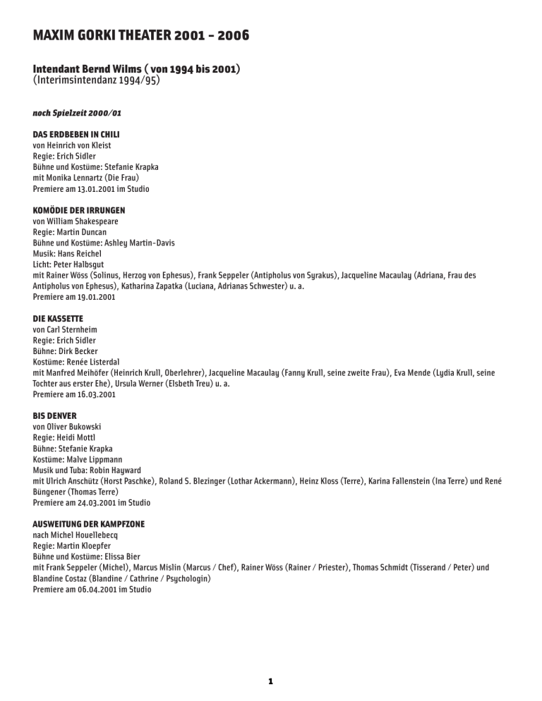 MAXIM GORKI THEATER 2001 - 2006 Intendant Bernd Wilms ( von 1994 bis 2001) (Interimsintendanz 1994/95) noch Spielzeit 2000/01 DAS ERDBEBEN IN CHILI von Heinrich von Kleist Regie: Erich Sidler Bühne und Kostüme: Stefanie Krapka mit Monika Lennartz (Die Frau) Premiere am 13.01.2001 im Studio KOMÖDIE DER IRRUNGEN von William Shakespeare Regie: Martin Duncan Bühne und Kostüme: Ashley Martin-Davis Musik: Hans Reichel Licht: Peter Halbsgut mit Rainer Wöss (Solinus, Herzog von Ephesus), Frank Seppeler (Antipholus von Syrakus), Jacqueline Macaulay (Adriana, Frau des Antipholus von Ephesus), Katharina Zapatka (Luciana, Adrianas Schwester) u. a. Premiere am 19.01.2001 DIE KASSETTE von Carl Sternheim Regie: Erich Sidler Bühne: Dirk Becker Kostüme: Renée Listerdal mit Manfred Meihöfer (Heinrich Krull, Oberlehrer), Jacqueline Macaulay (Fanny Krull, seine zweite Frau), Eva Mende (Lydia Krull, seine Tochter aus erster Ehe), Ursula Werner (Elsbeth Treu) u. a. Premiere am 16.03.2001 BIS DENVER von Oliver Bukowski Regie: Heidi Mottl Bühne: Stefanie Krapka Kostüme: Malve Lippmann Musik und Tuba: Robin Hayward mit Ulrich Anschütz (Horst Paschke), Roland S. Blezinger (Lothar Ackermann), Heinz Kloss (Terre), Karina Fallenstein (Ina Terre) und René Büngener (Thomas Terre) Premiere am 24.03.2001 im Studio AUSWEITUNG DER KAMPFZONE nach Michel Houellebecq Regie: Martin Kloepfer Bühne und Kostüme: Elissa Bier mit Frank Seppeler (Michel), Marcus Mislin (Marcus / Chef), Rainer Wöss (Rainer / Priester), Thomas Schmidt (Tisserand / Peter) und Blandine Costaz (Blandine / Cathrine / Psychologin) Premiere am 06.04.2001 im Studio 1 Intendant Volker Hesse (von 2001 bis 2006) Spielzeit 2001/02 DIE HELDIN VON POTSDAM von Theresia Walser Regie: Volker Hesse Bühne und Kostüme: Kazuko Watanabe mit Katharina Thalbach (Paula Wündrich), Burghart Klaußner (Richard), Monika Lennartz (Paulas Mutter), Ursula Werner (Molly), Bettina Hoppe (Fina), Klaus Manchen (Scotti, Richards Freund) u. a. Uraufführung am 14.09.2001 Volker Hesse NEUE MITTE von Raphael Urweider und Samuel Schwarz Koproduktion mit dem Künstlerhaus Mousonturm Frankfurt a. M. Regie: Samuel Schwarz Bühne und Kostüme: Chantal Wuhrmann Komposition: Michael Sauter Musikalische Leitung: Raphael Urweider mit Fabian Krüger (Jobst), Siegfried Terpoorten (Fridolin), Norman Schenk (Dietrich), Anya Fischer (Züs 1), Meret Hottinger (Züs 2) u. a. Uraufführung am 16.09.2001 im Studio GENOM GENESIS Konzeption und Regie: Lavinia Frey Bühne und Kostüme: Kathrin Hegedüsch Komposition: Christian Zehnder Projektionen: Sevrina Giard mit Christian Zehnder Uraufführung am 20.09.2001 FAMILIE GORKI - Folge 1 „Der Frieden“ von Peter Hacks nach Aristophanes Regie: Katharina Thalbach Bühne: Matthias Schaller Kostüme: Hanne Günther mit Fabian Krüger (Hermes), Katharina Thalbach (Der Krieg), Siegfried Terpoorten (Helmschmied), Joachim Meyerhoff (Waffenkrämer) u. a. Premiere am 29.09.2001 WAS MER KENNT’ MACHEN Jüdischer Witz und Literatur Ein Abend von und mit Hilmar Baumann Musik: Heiko Lehmann Premiere am 12.10.2001 im Studio MERKELS BRÜDER von Hajo Kurzenberger und Stephan Müller Regie: Stephan Müller Raum: Bernhard Siegl Kostüme: Marion Münch Musik: Gerd Bessler mit Anja Herden, Jacqueline Macaulay, Ruth Reinecke, Ulrich Anschütz, Thomas Bischofberger, Joachim Meyerhoff, Tilo Nest und Gerd Bessler Uraufführung am 13.10.2001 2 EINE GANZ NORMALE KATASTROPHE von Swetlana Alexijewitsch Leitung: Annette Reber Raum: Bernhard Siegl mit Franziska Hayner, Anna Kubin, Tim Hoffmann und Klaus Manchen Premiere am 25.11.2001 im Studio MOSKAU-PETUSCHKI von Stephen Mulrine nach Wenedikt Jerofejew Regie: Joachim Meyerhoff und Beate Heine Bühne und Kostüme: Tatjana Lyssenko mit Joachim Meyerhoff Premiere am 30.11.2001 im Studio DER IMPRESARIO VON SMYRNA von Carlo Goldoni Ensembleinszenierung mit Hilmar Baumann (Ali), Tilo Nest (Carluccio), Jacqueline Macaulay (Lucrezia), Ruth Reinecke (Tognina), Ursula Werner (Annina), Burghart Klaußner (Graf von Lasca) u. a. Premiere am 08.12.2001 KOPPSTOFF nach Feridun Zaimoglu Regie und Bühne: Dominic Huber Kostüme: Valerie von Stillfried mit Ilknur Bahadir, Idil Baydar, Sengül Boral, Günfer Gölgecen, Idil Üner u. a. Premiere am 13.12.2001 im Studio EDMUND KEAN von Raymund FitzSimons Regie: Peter Dehler Bühne: Olaf Grambow Kostüme: Hanne Günther mit Götz Schubert (Edmund Kean) Premiere am 16.12.2001 CASH von Michael Cooney Regie: Bernd Mottl Bühne: Hansjörg Hartung Kostüme: Janina Audick mit Ulrich Anschütz (Eric Swan), Jacqueline Macaulay (Linda Swan), Thomas Bischofberger (Norman Basset), Fabian Krüger (Doktor Chapman), Anya Fischer (Brenda Dixon) u. a. Premiere am 26.01.2002 im Studio IPHIGENIE AUF TAURIS von Johann Wolfgang von Goethe Regie: Thomas Langhoff Bühne und Kostüme: Peter Schubert Musik: Hermann Naerhring mit Ulrike Krumbiegel (Iphigenie), Klaus Manchen (Thoas, König der Taurier), Joachim Meyerhoff (Orest), Tilo Nest (Pylades) und Siegfried Terpoorten (Arkas) Premiere am 22.02.2002 3 HYSTERIKON von Ingrid Lausund Inszenierung in Zusammenarbeit mit der Universität der Künste Berlin und dem Regieinstitut der Hochschule für Schauspielkunst „Ernst Busch“ Berlin Regie: Sandrine Hutinet Bühne: Matthias Schaller Kostüme: Hanne Günther Klanggestaltung: Maik Voss mit Frank Streffing (Der Kassierer), Franziska Olm (Die Frau mit der Jutetasche, die aus Leinen ist), Anja Herden (Das schwarze Mädchen, das auf einmal den Impuls hat), Henning Bormann (Der Mann, der für seine Freundin eben…), Bettina Hoppe (Die Frau, die zufällig beobachtet, wie…) u. a. Premiere am 20.03.2002 im Studio GESPENSTER von Henrik Ibsen Regie, Bühne und Kostüme: Kazuko Watanabe mit Barbara Nüsse (Helene Alving), Fabian Krüger (Osvald Alving), Burghart Klaußner (Pastor Manders), Ulrich Anschütz (Tischler Engstrand) und Jacqueline Macaulay (Regine Engstrand) Premiere am 26.03.2002 9MM von Lionel Spycher Regie: 
