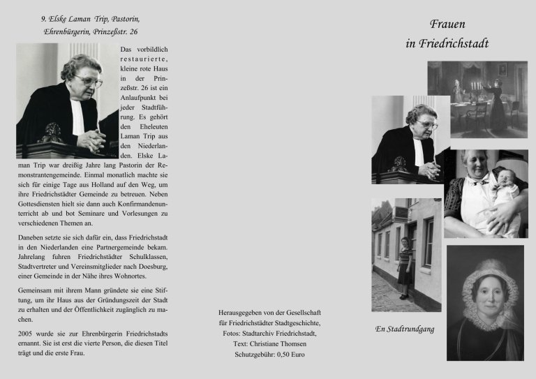 9. Elske Laman Trip, Pastorin, Ehrenbürgerin, Prinzeßstr. 26 Frauen in Friedrichstadt Das vorbildlich restaurierte, kleine rote Haus in der Prinzeßstr. 26 ist ein Anlaufpunkt bei jeder Stadtführung. Es gehört den Eheleuten Laman Trip aus den Niederlanden. Elske Laman Trip war dreißig Jahre lang Pastorin der Remonstrantengemeinde. Einmal monatlich machte sie sich für einige Tage aus Holland auf den Weg, um ihre Friedrichstädter Gemeinde zu betreuen. Neben Gottesdiensten hielt sie dann auch Konfirmandenunterricht ab und bot Seminare und Vorlesungen zu verschiedenen Themen an. Daneben setzte sie sich dafür ein, dass Friedrichstadt in den Niederlanden eine Partnergemeinde bekam. Jahrelang fuhren Friedrichstädter Schulklassen, Stadtvertreter und Vereinsmitglieder nach Doesburg, einer Gemeinde in der Nähe ihres Wohnortes. Gemeinsam mit ihrem Mann gründete sie eine Stiftung, um ihr Haus aus der Gründungszeit der Stadt zu erhalten und der Öffentlichkeit zugänglich zu machen. 2005 wurde sie zur Ehrenbürgerin Friedrichstadts ernannt. Sie ist erst die vierte Person, die diesen Titel trägt und die erste Frau. Herausgegeben von der Gesellschaft für Friedrichstädter Stadtgeschichte, Fotos: Stadtarchiv Friedrichstadt, Text: Christiane Thomsen Schutzgebühr: 0,50 Euro En Stadtrundgang Frauen in Friedrichstadt Warum ein eigener Stadtrundgang auf den Spuren der Friedrichstädter Frauen? Ist das unbedingt nötig? Bestimmt! Frauen waren ebenso am Aufbau und am Gedeihen unserer kleinen Stadt beteiligt wie Männer. Doch sie kommen kaum in den Quellen vor. Sie wirkten im Stillen. Frauen regelten den Haushalt, erzogen die Kinder, sorgten dafür, dass von dem, was der Mann heimbrachte, alle einigermaßen satt wurden. Manchmal leisteten die Frauen auch mehr als das: als Witwen führten sie das Geschäft ihres Mannes weiter und waren damit für das Auskommen vieler Menschen verantwortlich. Einige Frauen sorgten auch mit einem Beruf für sich selbst. Als Lehrerin durften sie nur unverheiratet arbeiten, schlossen sie den Bund fürs Leben, war es mit der Erwerbstätigkeit vorbei. Es gab aber auch Erwerbstätigkeiten, die nur Frauen ausüben durften, wie etwa Hebammen, von denen es in Friedrichstadt einige gab. Erst im 20. Jahrhundert traten Frauen verstärkt öffentlich in Erscheinung. Als Politikerinnen engagierten sie sich für die Geschicke der Stadt, leiteten Vereine und arbeiteten für wohltätige Zwecke oder arbeiteten in Berufen, die zuvor den Männern vorbehalten gewesen waren. In diesem Faltblatt sollen einige Frauen vorgestellt werden, die ihre Spuren in unserer Stadt hinterlassen haben, in schriftlichen, bildlichen und steinernen Quellen oder im Gedächtnis der Menschen. Es sind Frauen mit verschiedenen Religionen und aus verschiedenen Schichten, sie alle lebten und wirkten in Friedrichstadt. 1. Catharine de Wael - die Lilie von Friedrichstadt , Remonstrantenkirche 1624 wurde die erste Remonstrantenkirche der Welt in Friedrichstadt errichtet. Den Grundstein für dieses Gotteshaus legte eine Frau: Catharine de Wael. Sie war die Tochter des von Herzog Friedrich III. eingesetzten Statthalters Adolf van Wael und seiner Frau Occa van den Klooster. Es war damals üblich, dass die Kinder hochgestellter Persönlichkeiten solche symbolischen Grundsteinlegungen durchführten. Catherine wurde wegen ihrer ehrlichen, offenherzigen Art die „Lilie von Friedrichstadt“ genannt. Eine Romanze mit Anton van Wedde wurde von ihrem Vater unterbunden, da es schlecht um die Geschäfte von dessen Familie stand. Catherine wurde nach Utrecht geschickt, um bei ihrem Onkel zu leben. 1630 verließ Familie van Wael endgültig Friedrichstadt. 2. Jette Geskel, Geschäftsfrau Westermarktstr. 21 1792 erwarb Joseph Geskel von dem Melker Peter Reimers das Haus in der Westermarktstraße 21 und richtete dort eine Schlachterei ein. Schon bald darauf starb Joseph. Seine Witwe Jette führte die Schlachterei weiter, unterstützt von ihrem älteren Bruder David Moses. Zu Werbezwecken ließ sie Anzeigen im „Ditmarser und Eiderstedter Boten“ veröffentlichen, eine Maßnahme, die damals nur von wenigen Geschäftsleuten angewendet wurde. Jette Geskel war um 1759 geboren worden. Ihr Herkunftsort ist unbekannt. Joseph und Jette Geskel hatten drei Töchter: Feiljen (geb. 1787), Rachel (geb. 1790) und Sara (geb. 1798). Nach 1813 verließ Jette Geskel Friedrichstadt. Ihre beiden ältesten Töchter zogen mit ihren Männern nach Tondern und nahmen die Mutter und die jüngste Schwester mit. 1829 wurde das Haus in der Westermarktstraße verkauft. Schließlich heiratete auch Sara Geskel und nahm ihre Mutter mit nach Ribe. Um 1843 starb Jette Geskel. Ihr Enkel Geskel Saloman (1821-1902), Sohn von Feiljen und Isaak Salomon, war ein bekannter Maler. In einem seiner Gemälde porträtierte er seine Großmutter Jette und seine Mutter Feiljen beim Anzünden der Sabbatkerzen. 3. Margarete Löpchens, Kaneelstr. 32, die erste Stadtverordnete 4. Frl. von Taschitzka, Private Mädchenschule, Osterlilienstr. 1 5. Erna Peters, Fledermaus-Bar, Osterlilienstr. 6 1868 wurde in Friedrichstadt eine private Mädchenschule eingerichtet, auch „Töchterschule“ genannt. Die Mädchen erhielten neben Religion, Deutsch und Rechnen auch Unterricht in Englisch, Französisch, Turnen, Zeichnen und Physik. Um die Jahrhundertwende leitete Frl. von Taschitzka die Schule, sie unterrichtete alle Fächer außer Mathematik. Mit ihrer Mutter bewohnte sie einige Räume des Schulgebäudes. Zur besseren Versorgung mit Lebensmitteln bauten die Frauen im Garten Gemüse an. Margarethe Löpchens wurde 1869 im benachbarten Schwabstedt geboren. Im Juli 1919 trat sie als erste Frau in das Friedrichstädter Stadtparlament ein und gehörte ihm bis 1924 an. Erst seit 1918 durften Frauen in Deutschland wählen und in öffentliche Ämter gewählt werden. Unter dem Vorsitz des Bürgermeisters trafen sich die Stadtverordneten regelmäßig. Dabei wurde über ganz verschiedene Themen entschi