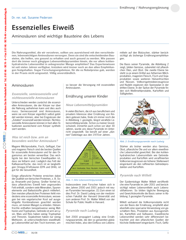 Ausgabe 06/08. Fordern Sie Ihr Probeheft an! Tel.: 0 61 46 - 90 74 - 0 • Fax: 0 61 46 - 90 74-44 • www.comedverlag.de Ernährung / Nahrungsergänzung Dr. rer. nat. Susanne Pedersen Essenzielles Eiweiß Aminosäuren sind wichtige Bausteine des Lebens Die Nahrungsmittel, die wir verzehren, sollten uns ausreichend mit den verschiedenen, lebenswichtigen Aminosäuren versorgen. Denn sie sind die entscheidenden Bausteine, die helfen, uns gesund zu erhalten und auch gesund zu werden. Wie passen dort die immer noch gängigen Lebensmittelpyramiden hinein, die vor allem kohlenhydratreiche Lebensmittel in unbegrenzter Menge empfehlen? Das Expertenwissen ist seit vielen Jahren verfügbar, trotzdem wird immer noch an den alten Empfehlungen festgehalten. Sogar Forschungsergebnisse, für die es Nobelpreise gab, werden in der Praxis nicht umgesetzt. Völlig unverständlich. Aminosäuren so besser die Versorgung mit essenziellen Aminosäuren. Essenzielle, semiessenzielle und nichtessenzielle Aminosäuren Ernährung unserer Kinder Unterschieden werden zunächst die essenziellen Aminosäuren, die der Körper nur über die Nahrung aufnehmen kann und dies auch muss. Semiessenziell sind Aminosäuren, wenn sie vom Körper eigentlich selbst gebildet werden können, aber bei Engpässen der „Zutaten“ essenziell werden können. Nichtessenzielle Aminosäuren können in fast allen Situationen ausreichend vom Körper synthetisiert werden. Der nachfolgende Artikel ist mit freundlicher Genehmigung entnommen aus Was ist reich bzw. arm an besonders welcher Aminosäure? mitteln auf den Blutzucker, stärker berücksichtigt als bisherige Ernährungsempfehlungen. Die Basis seiner Pyramide, die Abbildung 2 zeigt, bilden Gemüse, zubereitet mit pflanzlichen Ölen, und Obst. Die zweite Ebene besteht zu je einem Drittel aus fettarmen Milchprodukten, magerem Fleisch, Fisch und Sojaprodukten sowie weiteren Hülsenfrüchten und Nüssen. Vollkorngetreideerzeugnisse und Nudeln ergänzen den Speiseplan in der dritten Ebene. In der Spitze der Pyramide finden sich Weißmehlprodukte, Kartoffeln und Süßigkeiten. Neue Lebensmittelpyramiden In vielen Büchern, die ich aus beruflichem und privatem Interesse über Ernährung von Kindern gelesen habe, finde ich immer noch die in Abbildung 1 gezeigte, längst veraltete Lebensmittelpyramide. Schon zu meiner Grundschulzeit, immerhin auch schon vor über 30 Jahren, wurde uns diese Pyramide im Unterricht vorgestellt. Sie beruht auf einer „dünnen“ Datenlage aus den 1970-er Jahren. Abb. 2: Ernährungspyramide nach Ludwig Magere Milchprodukte, Fisch, Geflügel, Eier und mageres Fleisch sind die besten Quellen für essenzielle Aminosäuren und für den Organismus am besten verwertbar. Das wichtigste bei den tierischen Eiweißquellen ist, dass sie fettarm sind. Lediglich das Fett der Kaltwasserfische, das reich ist an langkettigen Omega-3-Fettsäuren (EPA und DHA), ist gut für die Gesundheit. Stärker als bisher werden also Gemüse, Obst, pflanzliche Öle und vor allem eiweißreiche Lebensmittel gewichtet. Bei den kohlenhydratreichen Lebensmitteln wie Getreideprodukten und Kartoffeln wird unraffinierten Vollkornerzeugnissen ein höherer Stellenwert eingeräumt als den raffinierten Getreideprodukten und Kartoffeln. Einige pflanzliche Proteine erreichen dabei die Qualität von tierischen Proteinen, z. B. Soja, Amaranth und Quinoa. Großer Vorteil ist, dass pflanzliches Eiweiß kein ungesundes Fett enthält, sondern viele Mineralien, Spurenelemente und Ballaststoffe gleich mitliefert. Den meisten pflanzlichen Proteinen fehlt mindestens eine essenzielle Aminosäure, weswegen bei rein vegetarischer Kost auf ausgeklügelte Kombinationen geachtet werden muss, um keinen Mangel zu erleiden. Hülsenfrüchte enthalten beispielsweise wenig Methionin und Tryptophan, Getreide ist arm an Lysin. Mais und Reis haben wenig Tryptophan und Threonin. Sojabohnen haben nur wenig Methionin. Je unterschiedlichere eiweißhaltige Lebensmittel auf den Tisch kommen, um- Pyramide nach Willett 06/08 Abb. 1: Alte Lebensmittelpyramide Insbesondere zwei Forscher haben sich in den Jahren 2000 und 2001 jedoch mit neuen Pyramiden hervorgetan. [1] Zum einen ist dies Prof. Dr. David Ludwig von der medizinischen Fakultät der Harvard Universität und zum anderen Prof. Dr. Walter Willett von der Schule für Public Health in Harvard. Pyramide nach Ludwig Seit 2000 propagiert Ludwig eine Ernährungspyramide, die den so genannten glykämischen Index, also den Einfluss von Lebens- Der Epidemiologe Walter Willett veröffentliche eine Pyramide im Jahr 2001 und berücksichtigt neben Lebensmitteln auch Lebensstilfaktoren. So bilden tägliche Bewegung und Gewichtskontrolle die Basis seiner in Abbildung 3 gezeigten Pyramide. Willett verbannt die Vollkornprodukte nicht von der Basis der Ernährung, empfiehlt aber ebenfalls eine sparsame Verwendung von geschältem Reis, Produkten aus Auszugsmehlen, Kartoffeln und Süßwaren. Eiweißreiche Lebensmittel werden sehr differenziert betrachtet und den pflanzlichen Quellen der höchste Stellenwert eingeräumt. Fisch, Geflü- 1 Ernährung / Nahrungsergänzung Dr. rer. nat. Susanne Pedersen Studium der Wirtschaftsmathematik in Ulm, seit 1999 in eigener Praxis als Heilpraktikerin mit den Schwerpunkten Elektroakupunktur nach Dr. Voll, Orthomolekulare Medizin und Dorntherapie tätig. Adipositastherapie mit dem forever-young-Konzept. Durch enge Zusammenarbeit mit der Zahnarztpraxis ihres Mannes Dr. med. dent. Jürgen Pedersen Einbeziehung von Zähnen und zahnärztlichen Werkstoffen in Diagnostik und Therapie. 2005 Promotion in Medizininformatik zum Dr. rer. nat. mit dem Schwerpunkt „Interoperabilität im Gesundheitswesen“. Sie betreut in CO’MED die ständige Rubrik „Gesundheitspolitik“. Das Genmaterial für unseren Stoffwechsel hat sich nicht geändert, nur unsere Lebensmittelversorgung und Lebensweise. Lebensmittel werden um den ganzen Globus gekarrt, von Frische kann da wirklich nicht mehr 
