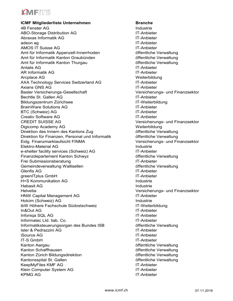 ICMF Mitgliederliste Unternehmen 4B Fenster AG ABO-Storage Distribution AG Abraxas Informatik AG adeon ag AMOS IT Suisse AG Amt für Informatik Appenzell-Innerrhoden Amt für Informatik Kanton Graubünden Amt für Informatik Kanton Thurgau Antalis AG AR Informatik AG Arcplace AG AXA Technology Services Switzerland AG Axians GNS AG Basler Versicherungs-Gesellschaft Bechtle St. Gallen AG Bildungszentrum Zürichsee BrainWare Solutions AG BTC (Schweiz) AG Creativ Software AG CREDIT SUISSE AG Digicomp Academy AG Direktion des Innern des Kantons Zug Direktion für Finanzen, Personal und Informatik Eidg. Finanzmarktaufsicht FINMA Elektro-Material AG e-shelter facility services (Schweiz) AG Finanzdepartement Kanton Schwyz Frei Submissionsberatung Gemeindeverwaltung Wallisellen Glenfis AG greenITplus GmbH H+S Kommunikation AG Habasit AG Helvetia HNW Capital Management AG Holcim (Schweiz) AG ibW Höhere Fachschule Südostschweiz In&Out AG Infoniqa SQL AG Informatec Ltd. liab. Co. Informatiksteuerungsorgan des Bundes ISB Isler & Pedrazzini AG iSource AG IT-S GmbH Kanton Aargau Kanton Schaffhausen Kanton Zürich Bildungsdirektion Kantonsspital St. Gallen KeepMyFiles KMF AG Klein Computer System AG KPMG AG www.icmf.ch Branche Industrie IT-Anbieter IT-Anbieter IT-Anbieter IT-Anbieter öffentliche Verwaltung öffentliche Verwaltung öffentliche Verwaltung IT-Anbieter IT-Anbieter Weiterbildung IT-Anbieter IT-Anbieter Versicherungs- und Finanzsektor IT-Anbieter IT-Weiterbildung IT-Anbieter IT-Anbieter IT-Anbieter Versicherungs- und Finanzsektor Weiterbildung öffentliche Verwaltung öffentliche Verwaltung Versicherungs- und Finanzsektor Industrie IT-Anbieter öffentliche Verwaltung IT-Anbieter öffentliche Verwaltung IT-Anbieter IT-Anbieter Industrie Industrie Versicherungs- und Finanzsektor IT-Anbieter Industrie IT-Weiterbildung IT-Anbieter IT-Anbieter IT-Anbieter öffentliche Verwaltung IT-Anbieter IT-Anbieter IT-Anbieter öffentliche Verwaltung öffentliche Verwaltung öffentliche Verwaltung öffentliche Verwaltung IT-Anbieter IT-Anbieter IT-Anbieter 07.11.2016 LeanBI AG Luzerner Kantonalbank Medela AG Medio-Ingeno AG Metagon AG Microsoft Schweiz GmbH Migros-Genossenschafts-Bund Netcetera AG nexellent ag Option Consulting Pensionskasse Basel-Stadt PricewaterhouseCoopers AG Priora Group AG Pro Senectute Kanton Zürich PSP Management AG Psychiatriedienste Süd Raiffeisen Schweiz Genossenschaft RealStuff Informatik AG Robert Aebi AG Schroder & Co Bank AG SoftwareONE AG Sozialdepartement der Stadt Zürich SRG SSR Stadt Winterthur Stadtverwaltung Burgdorf Stadtverwaltung St.Gallen Stadtverwaltung Zug Stämpfli AG Statistisches Amt des Kantons Zürich STFW SWICA Krankenversicherung Swiss Re Swisscard AECS AG Swisscom (Schweiz) AG Swisscom Banking Provider AG Swisscom IT SERVICES AG TBZ Höhere Fachschule Thurgauer Kantonalbank uniQconsulting ag United Management AG Universität St. Gallen VINCI Energies Schweiz AG VITS WiB Solutions AG WWF Schweiz ZID Basel-Stadt Zühlke Engineering AG Zürcher Kantonalbank ZKB IT-Anbieter Versicherungs- und Finanzsektor Industrie IT-Anbieter Unternehmensberater IT-Anbieter Industrie IT-Anbieter IT-Anbieter IT-Anbieter öffentliche Verwaltung IT-Anbieter IT-Anbieter NPO öffentliche Verwaltung öffentliche Verwaltung Versicherungs- und Finanzsektor IT-Anbieter Industrie Versicherungs- und Finanzsektor IT-Anbieter öffentliche Verwaltung Dienstleistung öffentliche Verwaltung öffentliche Verwaltung öffentliche Verwaltung öffentliche Verwaltung Industrie öffentliche Verwaltung IT-Weiterbildung Versicherungs- und Finanzsektor Versicherungs- und Finanzsektor Versicherungs- und Finanzsektor Dienstleistung Versicherungs- und Finanzsektor IT-Anbieter IT-Weiterbildung Versicherungs- und Finanzsektor IT-Anbieter IT-Anbieter Weiterbildung IT-Anbieter Alumni IT-Anbieter NPO öffentliche Verwaltung Unternehmensberater Versicherungs- und Finanzsektor www.icmf.ch 07.11.2016