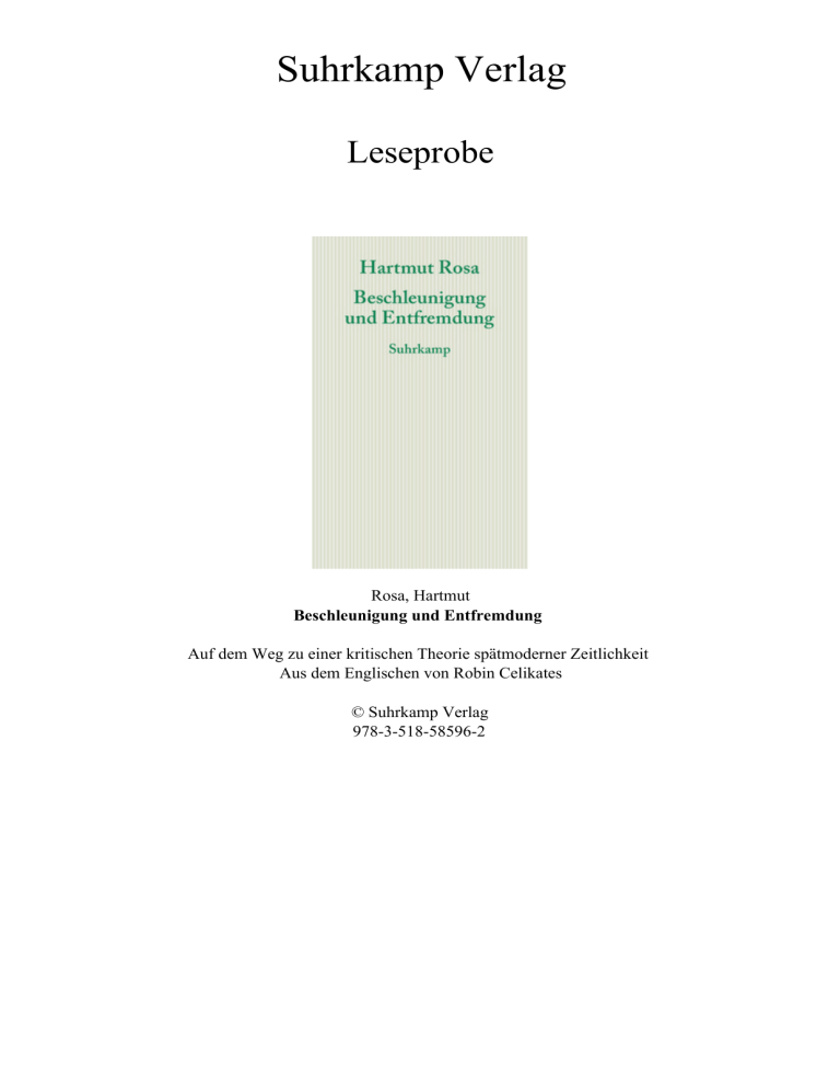 Suhrkamp Verlag Leseprobe Rosa, Hartmut Beschleunigung und Entfremdung Auf dem Weg zu einer kritischen Theorie spätmoderner Zeitlichkeit Aus dem Englischen von Robin Celikates © Suhrkamp Verlag 978-3-518-58596-2 SV Hartmut Rosa Beschleunigung und Entfremdung Entwurf einer Kritischen Theorie spätmoderner Zeitlichkeit Aus dem Englischen von Robin Celikates Suhrkamp Titel der Originalausgabe: Alienation and Acceleration. Towards a Critical Theory of Late-Modern Temporality © Hartmut Rosa and NSU Press 2010 Bibliografische Information der Deutschen Nationalbibliothek Die Deutsche Nationalbibliothek verzeichnet diese Publikation in der Deutschen Nationalbibliografie; detaillierte bibliografische Daten sind im Internet über http://dnb.d-nb.de abrufbar. Erste Auflage 2013 © dieser Ausgabe Suhrkamp Verlag Berlin 2013 Alle Rechte vorbehalten, insbesondere das der Übersetzung, des öffentlichen Vortrags sowie der Übertragung durch Rundfunk und Fernsehen, auch einzelner Teile. Kein Teil des Werkes darf in irgendeiner Form (durch Fotografie, Mikrofilm oder andere Verfahren) ohne schriftliche Genehmigung des Verlages reproduziert oder unter Verwendung elektronischer Systeme verarbeitet, vervielfältigt oder verbreitet werden. Druck: Druckhaus Nomos, Sinzheim Printed in Germany ISBN 978-3-518-58596-2 Inhalt Einleitung . . . . . . . . . . . . . . . . . . . . . . . . . . . . . . . . . 7 Teil I Eine Theorie der sozialen Beschleunigung . . . . . . . . . . 1. Was ist soziale Beschleunigung? . . . . . . . . . . . . . 2. Die Motoren der sozialen Beschleunigung . . . . . 3. Was ist soziale Entschleunigung? . . . . . . . . . . . . 4. Warum es Beschleunigung und nicht Entschleuni­­gung gibt . . . . . . . . . . . . . . . . . . . . . 5. Warum ist das wichtig? Beschleunigung und die Transformation unseres »In-der-Welt-Seins« . . . . . . . . . . . . . . . . . . . . . . 13 15 34 46 55 59 Teil II Soziale Beschleunigung und die gegenwärtigen Varianten der Kritischen Theorie . . . . . . . . . . . . . . . . 6. Anforderungen an eine Kritische Theorie . . . . . 7. Beschleunigung und die Kritik der Verständigungsverhältnisse . . . . . . . . . . . . . . . . 8. Beschleunigung und die Kritik der Anerkennungsverhältnisse . . . . . . . . . . . . . . . . . 9. Beschleunigung als neue Form des Totalitarismus . . . . . . . . . . . . . . . . . . . . . . . . . . . 69 71 78 83 89 Teil III Entwurf einer Kritischen Theorie der sozialen Beschleunigung . . . . . . . . . . . . . . . . . . . . . . . . . . . . . . 93 10. Drei Varianten einer Kritik der Zeitverhältnisse . . . . . . . . . . . . . . . . . . . . . . . . 95 11. Die funktionalistische Kritik: Pathologien der Desynchronisierung . . . . . . . . . . . . . . . . . . 99 12. Die normative Kritik: Eine ideologiekritische Entlarvung sozialer Normen der Zeitlichkeit . . 107 13. Die ethische Kritik I: Das gebrochene Versprechen der Moderne . . . . . . . . . . . . . . . . 113 14. Die ethische Kritik II: Eine Neubestimmung von Entfremdung – Warum soziale Beschleunigung zu Entfremdung führt . . . . . . . 122 Schlußbetrachtung . . . . . . . . . . . . . . . . . . . . . . . . . . 144 Literaturverzeichnis . . . . . . . . . . . . . . . . . . . . . . . . . 151 Einleitung Dieses Buch ist ein kurzer Versuch über das moderne Leben. Es strebt nicht nach vollkommener wissenschaftlicher oder philosophischer Präzision, sondern danach, die »richtige« Art von Fragen zu stellen, die es der Sozialphilosophie und der Soziologie erlauben würden, wieder an die sozia­ len Erfahrungen der Menschen in unseren spätmodernen Gesellschaften anzuknüpfen. Es gründet in der Überzeugung, daß die Sozialwissenschaften Fragen stellen müssen, die im Leben der Menschen einen Widerhall finden, Studierende mitreißen und empirische Forschungen antreiben. Zudem bin ich überzeugt, daß Soziologen, Philosophinnen und politische Theoretiker heutzutage allzuoft in Debatten und Forschungsprojekte verstrickt sind, die nicht einmal in ihnen selbst irgendwelche Leidenschaften entfachen. Wir ergehen uns einfach im routinierten Problemlösen im Rahmen etablierter Paradigmen im Sinne Thomas Kuhns, mit dem Ergebnis, daß Soziologie und Sozialphilosophie der breiteren Öffentlichkeit nicht mehr viel zu bieten haben. Aus diesem Grund befürchte ich, daß uns die Behauptungen, Hypothesen und Theorien auszugehen drohen, die für unsere spätmoderne Kultur, für Studierende, Künstler und all diejenigen, die am Schicksal und der Zukunft unserer Gesellschaften interessiert sind, sowohl eine Inspiration als auch eine Herausforderung darstellen. In diesem Buch werde ich daher zu jener Frage zurückkehren, die uns Menschen am wichtigsten ist: der Frage nach dem guten Leben – und der Frage danach, warum wir eigentlich kein gutes Leben haben (denn ich gehe zunächst davon aus, daß unser persönliches und gesellschaftliches Leben unter den gegenwärtigen Bedingungen dringend re7 formbedürftig ist). Da wir alle wissen, daß eine Antwort auf den ersten Teil dieser Frage so gut wie unmöglich ist, werde ich mit ihrem zweiten Teil beginnen. Tatsächlich bin ich der Auffassung, daß dieser Teil der Frage im Zentrum aller bisherigen Varianten und Generationen der Kritischen Theorie steht. Mit Sicherheit handelt es sich hierbei um Adornos Frage, aber auch Benjamin und Marcuse und in jüngerer Zeit Habermas und Honneth werden von ihr umgetrieben; und sie bewegt den jungen Marx in seinen frühen Pariser Manuskripten. Dieser Essay stellt daher auch den Versuch dar, die Tradition der Kritischen Theorie mit neuem Leben zu füllen. Um die im folgenden zu entwickelnde These ohne Umschweife zu formulieren: Wenn wir die Struktur und Qualität unseres Lebens untersuchen wollen, sollten wir uns seinen Zeitstrukturen zuwenden. Nicht nur lassen sich so gut wie alle Aspekte unseres Lebens aufschlußreich aus einer zeitlichen Perspektive analysieren; darüber hinaus verbinden Zeitstrukturen die Mikround Makro-Ebenen der Gesellschaft, da un