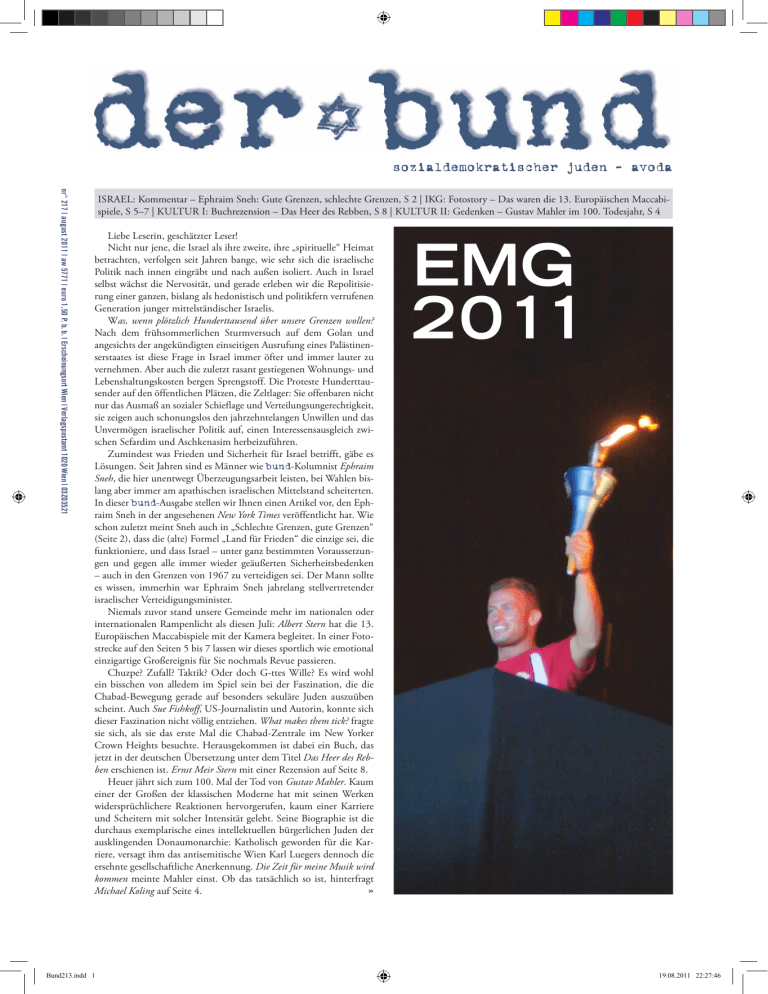sozialdemokratischer juden – avoda nr° 217 | august 2011 | aw 5771 | euro 1,50 P. b. b. | Erscheinungsort Wien | Verlagspostamt 1020 Wien | 03Z03521 ISRAEL: Kommentar – Ephraim Sneh: Gute Grenzen, schlechte Grenzen, S 2 | IKG: Fotostory – Das waren die 13. Europäischen Maccabispiele, S 5–7 | KULTUR I: Buchrezension – Das Heer des Rebben, S 8 | KULTUR II: Gedenken – Gustav Mahler im 100. Todesjahr, S 4 EMG 2011 Liebe Leserin, geschätzter Leser! Nicht nur jene, die Israel als ihre zweite, ihre „spirituelle“ Heimat betrachten, verfolgen seit Jahren bange, wie sehr sich die israelische Politik nach innen eingräbt und nach außen isoliert. Auch in Israel selbst wächst die Nervosität, und gerade erleben wir die Repolitisierung einer ganzen, bislang als hedonistisch und politikfern verrufenen Generation junger mittelständischer Israelis. Was, wenn plötzlich Hunderttausend über unsere Grenzen wollen? Nach dem frühsommerlichen Sturmversuch auf dem Golan und angesichts der angekündigten einseitigen Ausrufung eines Palästinenserstaates ist diese Frage in Israel immer öfter und immer lauter zu vernehmen. Aber auch die zuletzt rasant gestiegenen Wohnungs- und Lebenshaltungskosten bergen Sprengstoff. Die Proteste Hunderttausender auf den öffentlichen Plätzen, die Zeltlager: Sie offenbaren nicht nur das Ausmaß an sozialer Schieflage und Verteilungsungerechtigkeit, sie zeigen auch schonungslos den jahrzehntelangen Unwillen und das Unvermögen israelischer Politik auf, einen Interessensausgleich zwischen Sefardim und Aschkenasim herbeizuführen. Zumindest was Frieden und Sicherheit für Israel betrifft, gäbe es Lösungen. Seit Jahren sind es Männer wie bund-Kolumnist Ephraim Sneh, die hier unentwegt Überzeugungsarbeit leisten, bei Wahlen bislang aber immer am apathischen israelischen Mittelstand scheiterten. In dieser bund-Ausgabe stellen wir Ihnen einen Artikel vor, den Ephraim Sneh in der angesehenen New York Times veröffentlicht hat. Wie schon zuletzt meint Sneh auch in „Schlechte Grenzen, gute Grenzen“ (Seite 2), dass die (alte) Formel „Land für Frieden“ die einzige sei, die funktioniere, und dass Israel – unter ganz bestimmten Voraussetzungen und gegen alle immer wieder geäußerten Sicherheitsbedenken – auch in den Grenzen von 1967 zu verteidigen sei. Der Mann sollte es wissen, immerhin war Ephraim Sneh jahrelang stellvertretender israelischer Verteidigungsminister. Niemals zuvor stand unsere Gemeinde mehr im nationalen oder internationalen Rampenlicht als diesen Juli: Albert Stern hat die 13. Europäischen Maccabispiele mit der Kamera begleitet. In einer Fotostrecke auf den Seiten 5 bis 7 lassen wir dieses sportlich wie emotional einzigartige Großereignis für Sie nochmals Revue passieren. Chuzpe? Zufall? Taktik? Oder doch G-ttes Wille? Es wird wohl ein bisschen von alledem im Spiel sein bei der Faszination, die die Chabad-Bewegung gerade auf besonders sekuläre Juden auszuüben scheint. Auch Sue Fishkoff, US-Journalistin und Autorin, konnte sich dieser Faszination nicht völlig entziehen. What makes them tick? fragte sie sich, als sie das erste Mal die Chabad-Zentrale im New Yorker Crown Heights besuchte. Herausgekommen ist dabei ein Buch, das jetzt in der deutschen Übersetzung unter dem Titel Das Heer des Rebben erschienen ist. Ernst Meir Stern mit einer Rezension auf Seite 8. Heuer jährt sich zum 100. Mal der Tod von Gustav Mahler. Kaum einer der Großen der klassischen Moderne hat mit seinen Werken widersprüchlichere Reaktionen hervorgerufen, kaum einer Karriere und Scheitern mit solcher Intensität gelebt. Seine Biographie ist die durchaus exemplarische eines intellektuellen bürgerlichen Juden der ausklingenden Donaumonarchie: Katholisch geworden für die Karriere, versagt ihm das antisemitische Wien Karl Luegers dennoch die ersehnte gesellschaftliche Anerkennung. Die Zeit für meine Musik wird kommen meinte Mahler einst. Ob das tatsächlich so ist, hinterfragt Michael Koling auf Seite 4. » 1 Bund213.indd 1 19.08.2011 22:27:46 Zuletzt noch der Hinweis auf eine Personalie, die uns mit besonderer Freude und auch klein wenig Stolz erfüllt: Julia Kaldori, langjähriges Mitglied der bund-Redaktion, im „Brotjob“ zuletzt CoGeschäftsführerin des Verlags Edition Atelier in der Wiener Zeitung, ist seit Juli Geschäftsführerin der JMV, der neugegründeten Jüdischen Medien Verlagsgesellschaft m.b.H. In dieser IKG-Tochter sind künftig alle Medienauftritte der Kultusgemeinde gebündelt (insbesondere Insider und IKG-Homepage). Ein Nachfolger für die Gemeinde wird gerade konzipiert; dieses neue „jüdische Stadtmagazin“ (Selbstbeschreibung) soll offener, pluralistischer und vor allem unabhängiger sein als sein Vorgänger und erstmals zu den Hohen Feiertagen erscheinen. Ich darf Ihnen, liebe Leserin, geschätzter Leser, nun viel Spaß und angenehme Unterhaltung mit dieser 217. Ausgabe des bund wünschen sowie einen angenehmen und erholsamen Spätsommer! Robert Sperling SCHLECHTE GRENZEN, Während offizielle Vertreter des „Nahost-Quartetts“, also der Vereinigten Staaten, der Europäischen Union, Russlands und der Vereinten Nationen, intensiv nach Lösungsansätzen für einen Frieden in Nahost suchen, bleibt Israels Premierminister Benjamin Netanyahu bislang unnachgiebig. Er erklärt, dass ein Friedensabkommen, das auf einer Rückkehr zu den Grenzen von 1967 (also zu jenen vor dem Sechstagekrieg) aufbaut, ein für Israel inakzeptables Sicherheitsrisiko darstellt. Netanyahu hat Recht: Die Grenzen von 1967 sind militärisch nicht zu verteidigen. Andererseits ist es falsch und dient nicht den Interessen Israels, mit eben diesem Sicherheitsargument den einzigen Weg zu einem israelisch-palästinensischen Friedensabkommen zu verbauen. Dieser Weg ist übrigens längst bekannt und basiert auf einer verhandelten Zwei Staaten-Lösung mit gegenseitigem Gebietstausch. Israel braucht den Frieden mit den Palästinensern. Will man ihn, wird es tatsächl