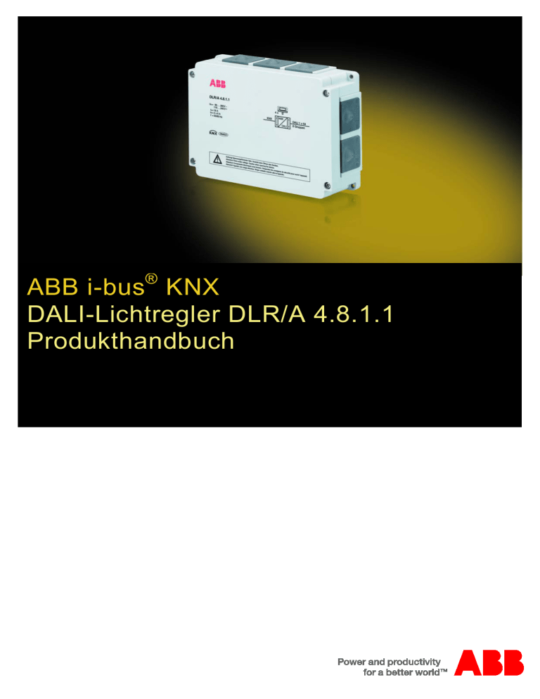 ABB i-bus® KNX DALI-Lichtregler DLR/A 4.8.1.1 Produkthandbuch ABB i-bus KNX Inhalt Inhalt Seite 1 Allgemein.............................................................................................. 3 1.1 1.1.1 1.1.1.1 1.1.2 1.2 1.3 1.3.1 Nutzung des Produkthandbuchs...................................................................................................4 Aufbau des Produkthandbuchs.....................................................................................................4 Software Tool ...............................................................................................................................4 Hinweise .......................................................................................................................................5 Produkt- und Funktionsübersicht ..................................................................................................6 DALI-Grundlagen zum DLR/A ......................................................................................................8 DALI-Gruppenansteuerung...........................................................................................................9 2 Gerätetechnik ..................................................................................... 11 2.1 2.1.1 2.1.2 2.1.3 2.2 2.2.1 2.2.2 2.2.3 2.2.4 2.2.5 2.3 2.4 2.5 2.6 DLR/A 4.8.1.1 .............................................................................................................................12 Technische Daten DLR/A 4.8.1.1 ...............................................................................................12 Anschlussbild DLR/A 4.8.1.1 ......................................................................................................15 Maßbild DLR/A 4.8.1.1 ...............................................................................................................17 Lichtfühler LF/U 2.1 ....................................................................................................................18 Technische Daten LF/U 2.1 ........................................................................................................18 Anschlussbild LF/U 2.1 ...............................................................................................................20 Maßbild LF/U 2.1 ........................................................................................................................21 Richtdiagramm LF/U 2.1 .............................................................................................................22 Überprüfung LF/U 2.1 .................................................................................................................22 Montage und Installation.............................................................................................................23 Beschreibung DALI-Ausgang .....................................................................................................25 Anzeigeelemente ........................................................................................................................26 Bedienelemente..........................................................................................................................27 3 Inbetriebnahme .................................................................................. 29 3.1 3.1.1 3.1.1.1 3.1.2 3.1.2.1 3.1.2.2 3.1.3 3.2 3.2.1 3.2.2 3.2.3 3.2.3.1 3.2.3.2 3.2.3.2.1 3.2.3.2.2 3.2.3.2.3 3.2.3.2.4 3.2.3.2.5 3.2.3.2.6 3.2.3.2.7 3.2.4 3.2.4.1 3.3 3.3.1 3.3.2 3.3.3 3.3.4 3.3.5 3.3.6 3.3.7 3.3.8 Überblick.....................................................................................................................................30 Konvertierung .............................................................................................................................33 Vorgehensweise zur Konvertierung ............................................................................................34 Kopieren und Tauschen von Parametereinstellungen ................................................................35 Vorgehensweise zum Kopieren und Tauschen ..........................................................................36 Funktionsübersicht .....................................................................................................................37 Überlappende Leuchtengruppen ................................................................................................38 Parameter ...................................................................................................................................39 Parameterfenster Allgemein .......................................................................................................40 Parameterfenster Lichtfühler ......................................................................................................47 Parameterfenster Zentral ............................................................................................................49 Parameterfenster Status - Zentral ..............................................................................................57 Parameterfenster Gx Gruppe .....................................................................................................63 Parameterfenster - Gx Status .....................................................................................................73 Parameterfenster - Gx Störung...................................................................................................77 Parameterfenster - Gx Funktionen .............................................................................................82 Parameterfenster - Gx Treppenlicht ...........................................................................................90 Parameterfenster - Gx Regler.....................................................................................................95 Parameterfenster -