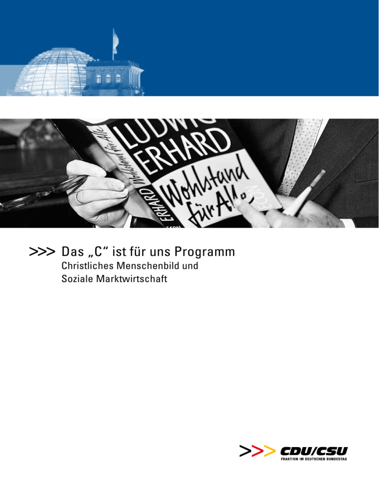 Das „C“ ist für uns Programm Christliches Menschenbild und Soziale Marktwirtschaft Vorwort >>> Christliches Menschenbild als Richtschnur für Wirtschaftsordnung D er Mensch ist, wie es im Galaterbrief des Apostel Paulus in der Bibel heißt, zur Freiheit geboren. Paulus mahnt die Christen aber auch zur Mitmenschlichkeit. Die Lasten soll die Gemeinschaft wirklich gemeinsam schultern. Jeder zur Freiheit Geborene soll für den anderen einstehen. Diese Gedanken können uns auch heute helfen, wenn wir über unsere Wirtschaftsordnung neu nachdenken. Die Wirtschafts- und Finanzkrise zwingt uns, den Blick zu weiten. Die Bundesrepublik konnte nur so erfolgreich sein, weil sie in ihrer Wirtschaftsordnung einen Mittelweg beschritten hat und die Leitlinien des christlichen Menschenbilds aufnahm, das Paulus im Galaterbrief beschrieben hat. Die Soziale Marktwirtschaft ist die Absage an kapitalistische Marktradikalität und sozialistische Entmündigung. Beides nimmt den Menschen ihre Freiheit und läuft dem Gedanken wirklicher Gemeinschaft zuwider. Unsere Aufgabe ist es nun, die Soziale Marktwirtschaft fortzuentwickeln. In unserem Land müssen wir vor allem jeden Menschen zur Freiheit befähigen. Das bedeutet, dass wir jedem Bürger – egal welcher Herkunft – eine wirkliche Chance geben müssen, sein Freiheitsrecht wahrzunehmen. Bildung ist dafür der Schlüssel. Wir müssen aber auch dafür werben, dass sich die Prinzipien der Sozialen Marktwirtschaft international durchsetzen. Denn gezügelte Märkte – gerade im Finanzbereich – sind die Voraussetzung für das Wohlergehen der Menschen in der neuen globalen Gemeinschaft. Im Februar 2011 hat die CDU/CSU-Bundestagsfraktion auf einem Kongress diese Fragen näher beleuchtet. Ich danke allen Teilnehmern dafür, dass sie ihre Beiträge für diese Broschüre aktualisiert haben. Die Überlegungen sind für unsere parlamentarische Tätigkeit äußerst wertvoll. Besonders hervorheben möchte ich die Kirchenbeauftragte der Fraktion, Maria Flachsbarth, die die „C“-Kongresse so hervorragend inhaltlich vorbereitet. 3 Volker Kauder MdB Vorsitzender der CDU/CSU-Bundestagsfraktion >>> Inhaltsverzeichnis >>> Das „C“ als Herausforderung – auch in der Sozialen Marktwirtschaft >>> Dr. Maria Flachsbarth Vorwort Volker Kauder 3 Christliches Menschenbild ist Grundlage und Selbstverpflichtung >>> Das „C“ als Herausforderung – auch in der Sozialen Marktwirtschaft Dr. Maria Flachsbarth 5 Soziale Marktwirtschaft auf Basis des „C“ – Wurzeln und Reformbedarf Dr. Dr. Anton Losinger 9 Öffentliche Kirche und Soziale Marktwirtschaft Prof. Dr. Heinrich Bedford-Strohm 19 Christliches Menschenbild im Zeitalter globaler Märkte Dr. Wolfgang Schäuble 23 Christliche Sozialethik – Impulsgeber für unsere heutige Sozialpolitik Ingrid Fischbach 27 Sozialstaat an seinen Grenzen? – Aufruf zur Eigenverantwortung Bartholomäus Kalb 31 Quo vadis Soziale Marktwirtschaft? – Fazit und Ausblick Peter Weiß 33 4 D as „C“ im Parteinamen zu tragen, ist eine Herausforderung, an der sich gerade die Politik unserer Fraktion messen lassen muss. Politik am christlichen Menschenbild auszurichten, kann nicht gelingen, wenn wir uns neben dem politischen Alltagsgeschäft nicht immer wieder auch unserer Grundlagen vergewissern. Die Veranstaltungsreihe „Das ‚C‘ ist für uns Programm“, die wir auf Initiative unseres Fraktionsvorsitzenden Volker Kauder durchführen, bietet uns dafür Gelegenheit. Die Grundsätze und ethischen Gewissheiten, auf die wir uns berufen, sind in einer religiös pluralen bzw. „religiös unmusikalischen“ Gesellschaft – um eine Formulierung von Jürgen Habermas aufzugreifen – für viele keine Selbstverständlichkeit mehr. Daher müssen vorpolitische Maßgaben unseres Zusammenlebens, die unserer Demokratie und auch dem Gestaltungsprinzip der Sozialen Marktwirtschaft zugrundeliegen, neu erklärt und für die Allgemeinheit verständlich gemacht werden. Diese Reflexion kann nicht im Alleingang gelingen: Wir freuen uns daher besonders über die Impulse der Vertreter der beiden großen Kirchen in unserer Veranstaltungsreihe. Darüber hinaus unterstreicht jeder einzelne der Teilnehmenden durch sein aktives Mitdenken und Mitdiskutieren, wie richtig und notwendig es ist, die Frage nach dem „C“ kontinuierlich wach zu halten. Das große Interesse, auf das die Frage nach der Bedeutung des christlichen Menschenbildes und der ethischen Grundsätze aus dem christlichjüdischen Erbe in unserer Politik stößt, zeigt uns, dass wir damit auf dem richtigen Weg sind. Für uns Christdemokraten und Christsoziale ist das „C“ im Parteinamen eine stete Selbstverpflichtung – das gilt auch und besonders mit Blick auf die Soziale Marktwirtschaft im nationalen Binnenraum wie auf globaler Ebene. 5 Dr. Maria Flachsbarth MdB Beauftragte für Kirchen und Religionsgemeinschaften der CDU/CSU-Bundestagsfraktion >>> Sittliche Grundsätze trotz angespannter Haushaltslage I n der politischen Entscheidungsfindung sind Kompromisse unumgänglich. Uns alle treibt die Frage um, wie wir dem Gemeinwohl angesichts der angespannten Haushaltslage gerecht werden können. Diese darf jedoch nicht zu einer Missachtung der sittlichen Grundsätze führen. So stellte schon 1949 einer der „Väter“ der Sozialen Marktwirtschaft, Alfred Müller-Armack, in seiner „Diagnose unserer Gegenwart“ fest: „Eine solche [Wirtschaftsordnung] kann nie aus dem Zweckdenken und überalterten politischen Ideen allein hervorgehen, sondern bedarf der tieferen Begründung durch sittliche Ideale, welche ihr erst die innere Berechtigung verleihen. Zwei großen sittlichen Zielen fühlen wir uns verpflichtet, der Freiheit und der sozialen Gerechtigkeit.” Wie kann eine verantwortungsvolle und nachhaltige Politik gestaltet werden, damit soziale Gerechtigkeit keine Worthülse bleibt? Wie können wir sicherstellen, dass politisches Handeln auch die Perspektive der kommenden Generationen in den Blick 