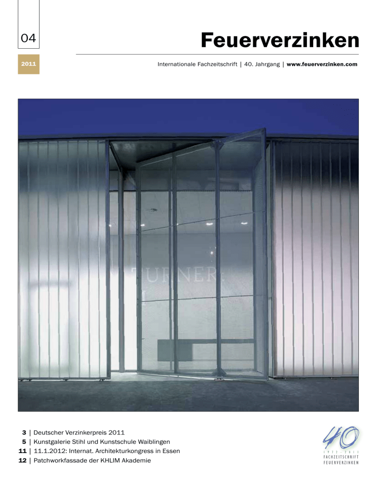 Feuerverzinken 04 2011 Internationale Fachzeitschrift | 40. Jahrgang | www.feuerverzinken.com 3 | Deutscher Verzinkerpreis 2011 5 | Kunstgalerie Stihl und Kunstschule Waiblingen 11 | 11.1.2012: Internat. Architekturkongress in Essen 12 | Patchworkfassade der KHLIM Akademie 04 Editorial 2011 1 Holger Glinde | Chefredakteur 2 Natürlich, lebenswichtig, recycelbar: Zink (S.14) Special Fassaden jetzt downloaden Feuerverzinkter Stahl wird zunehmend als Element der Fassadengestaltung entdeckt. Er profitiert dabei von seinen bewährten Stärken, die aus dem Stahl- und Metallbau bekannt sind. Seit Juni 2010 ist feuerverzinkter Stahl im Fassadenbau auch normungstechnisch für die Tragkonstruktion, die Fassadenbekleidung und die verwendeten Verbindungselemente geregelt, so dass eine baurechtliche Zustimmung im Einzelfall nicht mehr notwendig ist. Das Special „Fassaden“ des Industrieverbandes Feuerverzinken zeigt die vielfältigen Einsatzmöglichkeiten und Beispiele von Liebe Leserinnen, liebe Leser, feuerverzinktem Stahl im Fassadenbau - als Fassadenbekleidung in Form von Gitterrost-, Blech-, Streckmetall- oder Lamellenfassaden, aber auch als Unterkonstruktion oder als Verbindungselement. Feuerverzinkte Fassadenelemente sind dauerhaft gegen Korrosion mit der Verleihung des 12. Deutschen Verzin- Bereits zum fünften Mal lobt der Industrie- geschützt und besitzen eine einzigartige, kerpreises im Oktober 2011 wurde eine mehr verband Feuerverzinken den Innovationspreis metallische Anmutung. Sie sind eine echte als 20-jährige Erfolgsgeschichte fortgeschrie- Feuerverzinken aus. Er prämiert neue Pro- Alternative zu etablierten Metallfassadensyste- ben. Wir berichten ab S. 3 darüber. Der Preis duktanwendungen und innovative Forschungs- men, da sie großflächig elementierte Fassaden gehört in Deutschland zu den bedeutenden leistungen rund um den Korrosionsschutz mit lebendig wirkenden Oberflächen schaffen. Industrie-Awards für Architektur und Metallge- durch Feuerverzinken. Unter Nachhaltigkeitsaspekten sind feuerver- staltung. Dieser Ausgabe liegen die Auslobungsunter- zinkte Fassaden ebenfalls eine gute Wahl, da Das Spektrum der Einreicher reicht von global lagen des Innovationspreises 2012 bei. die langlebige Feuerverzinkung zur Ressour- agierenden Mega-Architekturbüros bis hin zu Einsendeschluss ist der 31. März 2012. censchonung und zur CO2-Einsparung beiträgt. jungen Nachwuchskräften, die den Wettbewerb als Sprungbrett nutzen. Das Fassaden-Special steht als kostenloser Ich wünsche Ihnen eine spannende Lektüre Download unter www.feuerverzinken.com zur Verfügung und kann als Print-Version bestellt Nicht wenige Projekte, die wir Ihnen in der Zeit- werden beim: schrift Feuerverzinken vorstellen, gehen auf Ver- Industrieverband Feuerverzinken e.V., zinkerpreis-Einreichungen zurück. Sie beweisen Postfach 140451, 40074 Düsseldorf, die durchgängig hohe Qualität der eingereichten Fax: 0211/690765-28, Architekturen und Gestaltungsobjekte. Holger Glinde, Chefredakteur [email protected] Feuerverzinken@Social Web facebook.com/feuerverzinken 2 | Feuerverzinken youtube.com/feuerverzinken ingfinder.com/profile/feuerverzinken 04 2011 1 Awards Deutscher Verzinkerpreis 2011 Auszeichnungen für herausragende und nachhaltige Objekte Der Industrieverband Feuerverzinken hat zum 12. Mal den Deutschen Verzinkerpreis für Architektur und Metallgestaltung verliehen. Erstmals wurde der Preis in zwei getrennten Kategorien und mit einem auf 15.000 Euro erhöhten Preisgeld vergeben. Mit 67 eingereichten, innovativen Objekten Projektbeschreibung: in Feuerverzinken metall wechseln sich mit Gussglaselementen fand der Preis erneut eine große Resonanz. Die 1/2011, Seite 4 ff ab. Die streckmetallverkleideten Lamellen Einreichungen offenbarten das breite Anwen- Die Jury: Die Jury war besonders beeindruckt und Tore filtern das Licht und schaffen den dungsspektrum von feuerverzinktem Stahl, von der Fassadenverkleidung des Neubaus - räumlichen Bezug zwischen innen und außen. vor allem, unter den Aspekten Nachhaltigkeit, großformatige, feuerverzinkte Stahlbleche. Die Die aus dem Industriebau stammenden Mate- Dauerhaftigkeit und Ästhetik. Einstimmig ver- hohe Materialeffizienz und Dauerhaftigkeit stel- rialien kamen präzise zum Einsatz und werden gab eine unabhängige, hochkarätige Jury unter len wichtige Argumente in der Nachhaltigkeits- dadurch modifiziert. Aus der Industrie-Ästhetik Vorsitz von Prof. Manfred Hegger, Präsident der diskussion dar. Die Präzision in Detaillierung werden Räume für die Kunst. Deutschen Gesellschaft für Nachhaltiges Bau- und Fugenbild ist besonders benennenswert. Kategorie Architektur: Dritter Preis en, drei erste Preise, einen dritten Preis und drei Anerkennungen. Preisträger: Hartwig Schneider Architekten, Preisträger: ARGE Ahlbrecht-Scheidt- Stuttgart Kasprusch, Essen sowie Schülke und Kategorie Architektur: Erste Preise Objekt: Kunstgalerie Stihl und Kunstschule Wiesmann Ingenieurbüro, Dortmund Preisträger: Waiblingen Objekt: Überdachung St. Antony Reiser + Partner Architekten BDA, Bochum Preisgeld: 4000 Euro Oberhausen 2 Objekt: Ganztagesbereich der Werner-von- Projektbeschreibung: ab Seite 5 dieser Preisgeld: 1000 Euro Siemens-Schule in Bochum 1 Ausgabe Projektbeschreibung: in Feuerverzinken Preisgeld: 4000 Euro Die Jury: Flächen aus feuerverzinktem Streck- 3/2011, Seite 12 Feuerverzinken |3 2 3 4 Die Jury: Auf dem Gelände der St. Antony Hüt- Projektbeschreibung: in Feuerverzinken Kategorie Metallgestaltung: Anerkennung te in Oberhausen wurde vor ca. 250 Jahren 3/2011, Seite 8 Preisträger: Metallbau und Kunstschmiede der erste Hochofen im Revier errichtet. Zum Die Jury: Das Hochwasserpumpwerk entstand Schwarz, Hetschburg Schutz der Gebäudereste wurde die gewählte im Zuge des Hochwasserschutzkonzeptes der Objekt: Restaurierungen an der Gedenkstätte Schalenkonstruktion aus Metall entwickelt. Alle Stadt Köln. Der Hochbauteil wurde mit einer Buchenwald Blechschi