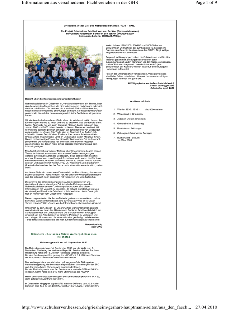 Informationen aus verschiedenen Fachbereichen in der GHS Page 1 of 9 Griesheim im der Zeit des Nationalsozialismus (1933 -- 1945) Ein Projekt Griesheimer Schülerinnen und Schüler (Gymnasialklassen) der Gerhart-Hauptmann-Schule in den Jahren 2000/2005/2009 Betreuende Leiterin: OStR'n B. Willige In den Jahren 1999/2000, 2004/05 und 2008/09 haben Schülerinnen und Schüler der gymnasialen 10. Klassen im Rahmen des Geschichtsunterrichtes der OStR´n Birgit Willige Projektarbeit vor Ort betrieben. Aufgeteilt in Kleingruppen haben die Schülerinnen und Schüler Material gesammelt. Die Ergebnisse wurden dann zusammengestellt und in Referaten vor der Klasse vorgetragen und auf Plakaten dargestellt. Von der Internet-AG (je 4 SchülerInnen der Klassen) wurden Texte für die schuleigene Homepage aufbereitet. Falls in der umfangreichen vorliegenden Arbeit gravierende inhaltliche Fehler unterliefen, bitten wir das zu entschuldigen. Anregungen nehmen wir gerne auf. B.Willige (betreuende Geschichtslehrerin) E-mail: [email protected] Griesheim, April 2009 Bericht über die Recherchen und Arbeitsmethoden Inhaltsverzeichnis: Nationalsozialismus in Griesheim ist, verständlicherweise, ein Thema, über das die wenigsten Menschen, die hier wohnen gerne nachdenken oder sich darüber unterhalten. Die meisten, die von dieser Zeit erzählen konnten, haben damals schreckliche Erfahrungen gemacht. Sie haben Erinnerungen gesammelt, die sich bis heute unvergesslich in ihr Gedächtnis eingebrannt haben. Wir danken deshalb an dieser Stelle allen, die sich bereit erklärt haben, ihre Erinnerungen mit uns zu teilen und uns zu erzählen, was sie damals erlebt haben. Aber nicht nur wir, auch damalige Klassen dieser Schule in den Jahren 2000 und 2005 haben bereits zu diesem Thema recherchiert. Wir können uns deshalb glücklich schätzen auf zehn Berichte von Zeitzeugen zurückgreifen zu können (die Texte sind im Abschnitt 6 zu finden). Ich möchte in diesem Bericht einen Eindruck über unsere Arbeit vermitteln. Unsere Arbeit fing im Herbst 2008 an und ging bis in den Mai 2009 hinein. Dieses mehrmonatige Projekt hat einen Großteil unserer Zeit in Anspruch genommen. Die Arbeitsweise hat sich stark von anderen Projekten unterschieden, bei denen meist einige kopierte Informationen aus dem Internet genügen. 1. Wahlen 1930 / 1933 - Machtübernahme 2. Widerstand in Griesheim 3. Juden in und um Griesheim 4. Griesheim im 2. Weltkrieg 5. Berichte von Zeitzeugen 6. Zeitungen / Griesheimer Anzeiger 7. Buchenwald - Besuch im März 2009 Man findet nämlich nur schwer Material über Griesheim zu diesem heiklen Thema im Internet, es mussten also andere Quellen herangezogen werden. Eine davon waren die Zeitzeugen, die ja bereits oben erwähnt wurden. Eine andere, zuverlässige Informationsquelle waren die Stadt- und Bibliotheksarchive, in denen zahlreiche Bücher zu diesem Thema von uns gelesen und ausgewertet wurden. Frau Dr. Wagemann vom Stadtarchiv Griesheim hat uns hier bei der Suche nach Informationen unterstützt, vielen Dank! An dieser Stelle ein besonderes Dankeschön an Herrn Knapp, der mehrere Bücher zu diesem Thema verfasst hat, die uns sehr weitergeholfen haben und der sich auch noch persönlich mit vielen von uns unterhalten hat. Die Archive des Griesheim-Anzeigers wurden ebenfalls von uns durchkämmt, da zur damaligen Zeit jedoch die Zeitungen von den Nationalsozialisten zensiert und manipuliert wurden, sind diese Informationen mit Vorsicht zu genießen, da schnell ein falsches Bild von der damaligen Situation in Griesheim entstehen kann. Unser Dank geht hier an Herrn Vogt vom Griesheimer Anzeiger! Diesen ungeordneten Haufen an Material galt es nun zu sortieren und zu bewerten. Welche Informationen sind zuverlässig? Was ist für unser Thema relevant? Wie können wir die Informationen übersichtlich gliedern? Um ehrlich zu sein, dieser Teil unserer Arbeit war der langwierigste und unspektakulärste, denn das Gliedern und Sortieren fand hauptsächlich am Schreibtisch oder am Computer statt. Die Schüler wurden in Gruppen eingeteilt um die Arbeitszeiten für einzelne Personen zu verkürzen und nach einigen Monaten war die Informationsflut gebändigt und die ersten Texte daraus entstanden (die alle hier auf der Homepage zu finden sind). Marco Portisch, April 2009 Griesheim - Deutsches Reich: Wahlergebnisse zum Reichstag Reichstagswahl am 14. September 1930 Die Reichstagswahl vom 14. September 1930 war die Wahl zum 5. Deutschen Reichstag der Weimarer Republik. Reichspräsident Paul von Hindenburg hatte am 18. Juli den Reichstag vorzeitig aufgelöst. Bei den Reichstagswahlen gelang der NSDAP mit 6,4 Millionen Stimmen der Durchbruch: Sie wurde zweitstärkste Fraktion. Das Wahlergebnis erweckte keine Hoffnungen auf die Bildung einer Mehrheitsregierung, da die wirtschaftspolitischen Vorstellungen der SPD und der bürgerlichen Parteien weit auseinander lagen. Bei der Reichstagswahl vom 14. September konnte die SPD mit 26.9 % vorlegen. Somit hatte sie 6.9 % mehr Stimmen als die NSDAP. Hinter den Nationalsozialisten lagen die Kommunisten (KPD) mit 14.4 %, dicht gefolgt vom Zentrum mit 12.8 %. In Griesheim hingegen lag die SPD mit einer Differenz von 30.3 % der Stimmen also 43.8 % vor der KPD, welche 13.5 % hatte. Hinter der KPD http://www.schulserver.hessen.de/griesheim/gerhart-hauptmann/seiten/aus_den_faech... 27.04.2010 Informationen aus verschiedenen Fachbereichen in der GHS Page 2 of 9 befand sich die NSDAP mit nur 9.9 %. Reichstagswahl 1933 Die Reichstagswahl am 5. März 1933 war die Wahl zum 8. Deutschen Reichstag in der Weimarer Republik. Sie war die letzte Reichstagswahl, an der mehr als eine Partei teilnahm, und stand bereits unter dem Eindruck des NS-Regimes. Die Wahl fand gut fünf Wochen nach der sogenannten Machtergreifung Adolf Hitlers, d. h. seiner Ernennung zum Reichskanzler am 30. Januar 1933 statt. Die NSDAP wurde mit einem Stimmengewinn von über fünf Millionen mit 17,2 Millionen Stimmen (43,8 %) stärkste Par