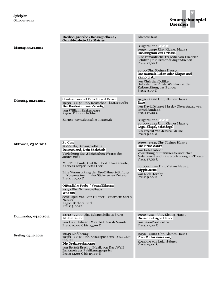 Spielplan Oktober 2012 Dreikönigskirche / Schauspielhaus / Gemäldegalerie Alte Meister Kleines Haus Bürgerbühne 19:30 - 21:30 Uhr, Kleines Haus 1 Die Jungfrau von Orleans Eine romantische Tragödie von Friedrich Schiller | mit Dresdner Jugendlichen Preis: 17,00 € Montag, 01.10.2012 20:00 Uhr, Kleines Haus 3 Das normale Leben oder Körper und Kampfplatz von Christian Lollike Gefördert im Fonds Wanderlust der Kulturstiftung des Bundes Preis: 9,00 € Dienstag, 02.10.2012 Mittwoch, 03.10.2012 Staatsschauspiel Dresden auf Reisen 19:30 - 22:30 Uhr, Deutsches Theater Berlin Der Kaufmann von Venedig von William Shakespeare Regie: Tilmann Köhler 19:30 - 21:00 Uhr, Kleines Haus 1 Race von David Mamet | In der Übersetzung von Bernd Samland Preis: 17,00 € Karten: www.deutschestheater.de Bürgerbühne 20:00 - 21:15 Uhr, Kleines Haus 3 Legal, illegal, scheißegal Ein Projekt von Jessica Glause Preis: 9,00 € Zu Gast 11:00 Uhr, Schauspielhaus Deutschland, Dein Sächsisch Verleihung des „Sächsischen Wortes des Jahres 2012“ 16:00 - 17:45 Uhr, Kleines Haus 1 Die Firma dankt von Lutz Hübner Vorstellung mit familienfreundlicher Anfangszeit und Kinderbetreuung im Theater Preis: 17,00 € Mit: Tom Pauls, Olaf Schubert, Uwe Steimle, Andreas Berger, Peter Ufer Eine Veranstaltung der Ilse-Bähnert-Stiftung in Kooperation mit der Sächsischen Zeitung Preis: 20,00 € 20:00 - 21:00 Uhr, Kleines Haus 3 Nipple Jesus von Nick Hornby Preis: 9,00 € Öffentliche Probe / Voraufführung 19:30 Uhr, Schauspielhaus Was tun Schauspiel von Lutz Hübner | Mitarbeit: Sarah Nemitz Regie: Barbara Bürk Preis: 5,00 € Donnerstag, 04.10.2012 19:30 - 22:00 Uhr, Schauspielhaus | AD06 Blütenträume von Lutz Hübner | Mitarbeit: Sarah Nemitz Preis: 10,00 € bis 23,00 € 19:30 - 21:15 Uhr, Kleines Haus 1 Die schmutzigen Hände von Jean-Paul Sartre Preis: 17,00 € Freitag, 05.10.2012 18:45 Einführung 19:30 - 22:30 Uhr, Schauspielhaus | AE01, AE07, 19:30 - 21:00 Uhr, Kleines Haus 1 Frau Müller muss weg Komödie von Lutz Hübner Preis: 19,00 € IGG, IGK Die Dreigroschenoper von Bertolt Brecht | Musik von Kurt Weill Im Anschluss Publikumsgespräch Preis: 14,00 € bis 25,00 € Samstag, 06.10.2012 19:00 Uhr, Foyer 1. Rang Treffpunkt „Premiere“ des Fördervereins Staatsschauspiel – mit einer Einführung durch den Intendanten Sonderprojekt zur 100. Spielzeit Uraufführung 19:30 - 21:15 Uhr, Schauspielhaus | PRSH Was tun Schauspiel von Lutz Hübner | Mitarbeit: Sarah Nemitz Regie: Barbara Bürk Im Anschluss Premierenfeier im Felix Restaurant im Schauspielhaus. DJ Studio 17 legt für Sie auf. Preis: 14,00 € bis 25,00 € 18:45 Einführung 19:30 - 22:00 Uhr, Kleines Haus 1 Titus Andronicus Römische Tragödie von William Shakespeare | Deutsch von Wolf von Baudissin | Polnisch von Maciej Somczyski Eine Koproduktion mit dem Teatr Polski Wrocaw | Gefördert durch die Kulturstiftung des Bundes und die Stiftung für deutschpolnische Zusammenarbeit | In deutscher und polnischer Sprache mit Übertiteln Im Anschluss Publikumsgespräch Preis: 19,00 € Bürgerbühne 20:00 - 21:30 Uhr, Kleines Haus 3 Die Zärtlichkeit der Russen Aus dem Leben einer Kriegsgeneration | von Dagrun Hintze Preis: 11,00 € Sonntag, 07.10.2012 19:00 - 21:30 Uhr, Kleines Haus 1 Titus Andronicus Römische Tragödie von William Shakespeare | Deutsch von Wolf von Baudissin | Polnisch von Maciej Somczyski Eine Koproduktion mit dem Teatr Polski Wrocaw | Gefördert durch die Kulturstiftung des Bundes und die Stiftung für deutschpolnische Zusammenarbeit | In deutscher und polnischer Sprache mit Übertiteln Preis: 17,00 € Montag, 08.10.2012 19:30 - 21:30 Uhr, Kleines Haus 2 Nichts. Was im Leben wichtig ist nach dem Jugendbuch von Janne Teller | in der Bühnenfassung von Andreas Erdmann | aus dem Dänischen übersetzt von Sigrid C. Engeler | Eine Inszenierung mit den Studentinnen und Studenten des Schauspielstudios Dresden Preis: 15,00 € Dienstag, 09.10.2012 18:45 Einführung 19:30 - 21:30 Uhr, Schauspielhaus | AD08, AF01 Herr Puntila und sein Knecht Matti Volksstück von Bertolt Brecht | Nach den Erzählungen und einem Stückentwurf von Hella Wuolijoki | Musik von Paul Dessau Preis: 10,00 € bis 23,00 € 11:00 Uhr, Kleines Haus 1 Vorspiel! Öffentliche Diplomprüfung der Studentinnen und Studenten des Schauspielstudios Dresden Eintritt frei Platzkarten erhalten Sie an den Vorverkaufskassen Bürgerbühne 19:30 - 21:15 Uhr, Kleines Haus 1 Ein Sommernachtstraum von William Shakespeare Preis: 17,00 € Mittwoch, 10.10.2012 Seite 2 18:45 Einführung 19:30 - 22:45 Uhr, Schauspielhaus | AF07, AF08 Die Räuber von Friedrich Schiller Preis: 10,00 bis 23,00 € 19:30 - 21:00 Uhr, Kleines Haus 1 Frau Müller muss weg Komödie von Lutz Hübner Preis: 17,00 € Donnerstag, 11.10.2012 19:30 - 21:15 Uhr, Schauspielhaus | AF03, AF05 Was tun Schauspiel von Lutz Hübner | Mitarbeit: Sarah Nemitz Im Anschluss Publikumsgespräch Preis: 10,00 € bis 23,00 € 11:00 - 13:00 Uhr, Kleines Haus 1 Tschick nach dem Roman von Wolfgang Herrndorf Preis: 17,00 € Bürgerbühne 18:45 Einführung 19:30 - 21:30 Uhr, Kleines Haus 1 Die Jungfrau von Orleans Eine romantische Tragödie von Friedrich Schiller | mit Dresdner Jugendlichen Preis: 17,00 € 20:00 - 21:00 Uhr, Kleines Haus 3 Nipple Jesus von Nick Hornby Preis: 9,00 € Freitag, 12.10.2012 19:30 - 21:45 Uhr, Schauspielhaus | AE02 Damen der Gesellschaft Komödie von Clare Boothe Luce | Deutsch von Nina Adler Preis: 14,00 € bis 25,00 € 18:45 Einführung 19:30 - 21:15 Uhr, Kleines Haus 1 Liliom Eine Vorstadtlegende in sieben Bildern und einem szenischen Prolog von Franz Molnar | Für die deutsche Bühne bearbeitet von Alfred Polgar Im Anschluss Publikumsgespräch Preis: 19,00 € 20:00 Uhr, Kleines Haus 3 Tonka Die ergreifende Liebesgeschichte eines ungleichen Paares steht im Mittelpunkt der Lesung von Robert Musils Erzählung Tonka, die 1922 in dem Novellenzyklus „Drei Frauen“ erschien. Es liest Albrecht Goette. P