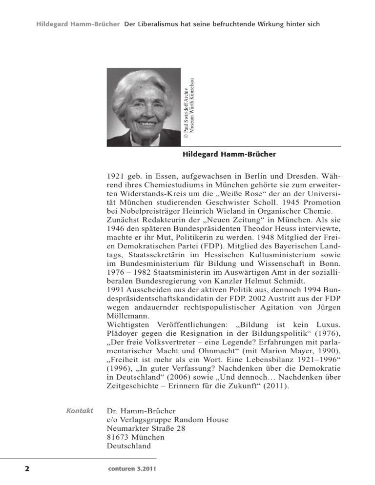 © Paul Swiridoff Archiv Museum Wü rth Kü nzelsau Hildegard Hamm-Brücher Der Liberalismus hat seine befruchtende Wirkung hinter sich Hildegard Hamm-Brücher 1921 geb. in Essen, aufgewachsen in Berlin und Dresden. Während ihres Chemiestudiums in München gehörte sie zum erweiterten Widerstands-Kreis um die „Weiße Rose“ der an der Universität München studierenden Geschwister Scholl. 1945 Promotion bei Nobelpreisträger Heinrich Wieland in Organischer Chemie. Zunächst Redakteurin der „Neuen Zeitung“ in München. Als sie 1946 den späteren Bundespräsidenten Theodor Heuss interviewte, machte er ihr Mut, Politikerin zu werden. 1948 Mitglied der Freien Demokratischen Partei (FDP). Mitglied des Bayerischen Landtags, Staatssekretärin im Hessischen Kultusministerium sowie im Bundesministerium für Bildung und Wissenschaft in Bonn. 1976 – 1982 Staatsministerin im Auswärtigen Amt in der sozialliberalen Bundesregierung von Kanzler Helmut Schmidt. 1991 Ausscheiden aus der aktiven Politik aus, dennoch 1994 Bundespräsidentschaftskandidatin der FDP. 2002 Austritt aus der FDP wegen andauernder rechtspopulistischer Agitation von Jürgen Möllemann. Wichtigsten Veröffentlichungen: „Bildung ist kein Luxus. Plädoyer gegen die Resignation in der Bildungspolitik“ (1976), „Der freie Volksvertreter – eine Legende? Erfahrungen mit parlamentarischer Macht und Ohnmacht“ (mit Marion Mayer, 1990), „Freiheit ist mehr als ein Wort. Eine Lebensbilanz 1921–1996“ (1996), „In guter Verfassung? Nachdenken über die Demokratie in Deutschland“ (2006) sowie „Und dennoch… Nachdenken über Zeitgeschichte – Erinnern für die Zukunft“ (2011). Kontakt 2 Dr. Hamm-Brücher c/o Verlagsgruppe Random House Neumarkter Straße 28 81673 München Deutschland conturen 3.2011 Hildegard Hamm-Brücher Der Liberalismus hat seine befruchtende Wirkung hinter sich Der Liberalismus hat seine befruchtende Wirkung hinter sich Adelbert Reif im Gespräch mit Hildegard Hamm-Brücher Otto Graf Lambsdorff nannte sie die „Grande Dame der FDP“. Für andere war sie eine „streitbare Liberale“, eine „loyale Dissidentin“ und eine unbequeme Kommentatorin. Sie selbst bezeichnet sich als „freischaffende Liberale“. Hildegard Hamm-Brücher scheute sich nie, für Liberalität sowie Respekt und Toleranz einzutreten. So gehörte sie zu den wenigen politischen Persönlichkeiten in der Geschichte der Bundesrepublik, die sich auch während der Zeit der nationalsozialistischen Terrorherrschaft stets humanen, demokratischen Werten verpflichtet fühlten. Das Lernen aus den Fehlern der Geschichte, die Stärkung der Demokratie, das Eintreten für die Rechte der Frauen und Bildung als Bürgerrecht waren einige der Themen ihres poltischen Lebens. In ihrem Buch „Und dennoch… Nachdenken über Zeitgeschichte – Erinnern für die Zukunft“ (Siedler, München 2011) blickt sie am Ende ihres neunten Lebensjahrzehnts zurück, um politisches Zeugnis abzulegen über die Zeit seit dem Ende des Zweiten Weltkriegs. Sie setzt sich mit den Erblasten der Nazi-Diktatur auseinander, propagiert Demokratie als Staats- und Lebensform und räsoniert über Glanz und Elend des politischen Liberalismus. conturen: Frau Dr. Hamm-Brücher, wenn Sie in Ihrem Buch mit dem kämpferisch-trotzigen Titel „Und dennoch…“ auf Ihre nunmehr neunzig Lebensjahre zurückblicken, dann lassen sich Ihre Erinnerungen auch als Besichtigung und kritische Reflexion des von Ihnen durchlebten Zeitalters lesen. Was waren in der Rückschau die Höhepunkte Ihres Politikerinnenlebens? Ein trotziges „Und dennoch“ Hamm-Brücher: Das war zunächst einmal 1945 die Befreiung vom Joch der Nazi-Diktatur, die wir aus eigener Kraft nicht geschafft haben. Für mich als junge Frau – 24 Jahre alt – war das eines der entscheidenden Ereignisse meines Lebens, weil ich hoffte, nun ohne Angst weiterleben zu können. Angstfreiheit bedeutete nach dieser Zeit, in der wir uns 1945: Befreiung und Freiheit von Angst conturen 3.2011 3 Hildegard Hamm-Brücher Der Liberalismus hat seine befruchtende Wirkung hinter sich hatten fürchten müssen, jederzeit verhaftet zu werden, eine ungeheure Erleichterung. 1949: Harvard USA: Demokratie als Lebensform Als Liberale in einer SPD-Regierung Der zweite große Höhepunkt war, dass ich 1949/50 ein Stipendium an die Harvard Universität bekam. Dadurch hatte ich die Chance, ein Jahr lang zu erleben, wie Demokratie funktioniert. Die amerikanische Demokratie stand damals noch in Blüte. Es war eine wirkliche Graswurzeldemokratie. So wenig es gab, mit dem man ansonsten übereinstimmte, auch unter den Menschen, auf ihre Demokratie ließen die Amerikaner nie etwas kommen. Diese Erfahrung führte mich dazu, dass ich dachte, was die Amerikaner an ihrer Demokratie für wichtig hielten, müssten wir auch haben: Demokratie als Lebensform. Das prägte mich sehr in meiner parlamentarischen Arbeit. Dann kam ein Höhepunkt, der einschneidend für mich war. Ich erhielt in einer sozialdemokratischen Regierung in Hessen einen Staatssekretärsposten. Nie hätte ich mir vorgestellt, dass eine Frau eine solche Tätigkeit ausüben kann. Ich hatte in einer bildungspolitischen Schrift über die Pädagogische Provinz der Bundesrepublik und Berlin geschrieben und das hatte dem Ministerpräsidenten so imponiert, dass er mich 1967 in seine Regierung holte. Und wie ich da inauguriert wurde als Liberale, deren Partei gar nicht in der Regierung war, das war ein großartiges Erlebnis. Den nächsten Höhepunkt erlebte ich in der sozialliberalen Regierung unter Willy Brandt und Walter Scheel, der 1974 zum Bundespräsidenten gewählt wurde. Die Bedingungen waren damals ganz schwierig. Aber als sich im Auswärtigen Amt endlich die Idee der Entspannung, der Versöhnungspolitik mit unseren osteuropäischen Nachbarn durchsetzte, bedeutete das für mich eine große Freude und Erleichterung. Ministerin bei Genscher „Dissidentin“ in Sachen Helmut Schmidt 4 Darauf folgte 