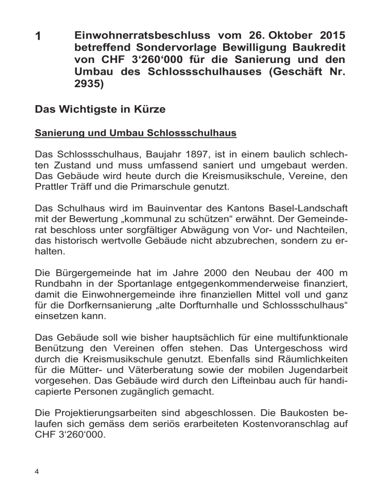 1 Einwohnerratsbeschluss vom 26. Oktober 2015 betreffend Sondervorlage Bewilligung Baukredit von CHF 3‘260‘000 für die Sanierung und den Umbau des Schlossschulhauses (Geschäft Nr. 2935) Das Wichtigste in Kürze Sanierung und Umbau Schlossschulhaus Das Schlossschulhaus, Baujahr 1897, ist in einem baulich schlechten Zustand und muss umfassend saniert und umgebaut werden. Das Gebäude wird heute durch die Kreismusikschule, Vereine, den Prattler Träff und die Primarschule genutzt. Das Schulhaus wird im Bauinventar des Kantons Basel-Landschaft mit der Bewertung „kommunal zu schützen“ erwähnt. Der Gemeinderat beschloss unter sorgfältiger Abwägung von Vor- und Nachteilen, das historisch wertvolle Gebäude nicht abzubrechen, sondern zu erhalten. Die Bürgergemeinde hat im Jahre 2000 den Neubau der 400 m Rundbahn in der Sportanlage entgegenkommenderweise finanziert, damit die Einwohnergemeinde ihre finanziellen Mittel voll und ganz für die Dorfkernsanierung „alte Dorfturnhalle und Schlossschulhaus“ einsetzen kann. Das Gebäude soll wie bisher hauptsächlich für eine multifunktionale Benützung den Vereinen offen stehen. Das Untergeschoss wird durch die Kreismusikschule genutzt. Ebenfalls sind Räumlichkeiten für die Mütter- und Väterberatung sowie der mobilen Jugendarbeit vorgesehen. Das Gebäude wird durch den Lifteinbau auch für handicapierte Personen zugänglich gemacht. Die Projektierungsarbeiten sind abgeschlossen. Die Baukosten belaufen sich gemäss dem seriös erarbeiteten Kostenvoranschlag auf CHF 3‘260‘000. 4 Der Einwohnerrat hat an seiner Sitzung vom 26. Oktober 2015 dem Baukredit von CHF 3‘260‘000 mit 33 Ja zu 0 Nein Stimmen bei 1 Enthaltung klar zugestimmt. Der Baukredit ist dem obligatorischen Referendum (Volksabstimmung) unterstellt worden. Die Vorlage im Detail Bisherige Planungsphasen Mit der Ausarbeitung des Bauprojektes wurden, analog zur Planung für das Burggartenschulhaus, ein Architekt sowie geeignete Fachingenieure beauftragt. Es sind verschiedene Projektvarianten geprüft worden, so dass heute ein optimiertes Bauprojekt mit Kostenvoranschlag vorliegt. Eine eingesetzte Planungskommission hat die Projektierung begleitet. Projektvorstellung Analog zur alten Dorfturnhalle sollen das Burggartenschulhaus und das Schlossschulhaus diesen zentralen historischen Platz in unmittelbarer Nähe zum Schloss prägen. Die Stellung der drei Altbauten lassen der zukünftigen Freiraumgestaltung Spielraum, so dass eine hohe Aufenthaltsqualität erreicht werden kann. Die Multifunktionalität des Schlossschulhauses wird mit der Sanierung und dem Umbau beibehalten. Die äusseren und inneren Strukturen des Gebäudes bleiben bestehen. Mit der Sanierung werden statische Verbesserungen realisiert, so dass Rissbildungen vermieden werden. Mit dem Einbau eines Liftes und einer äusseren Rampe soll das Gebäude auch für handicapierte Personen zugänglich gemacht werden. Kurzer Baubeschrieb Das Untergeschoss des Gebäudes wird abgegraben und unterfangen. Mit der neuen Fundation werden eine statische Verbesserung und zugleich eine besser nutzbare Raumhöhe erreicht. Der Lifteinbau im heutigen Treppenhaus führt über alle Geschosse (Untergeschoss bis Dachgeschoss). 5 Alle Gebäudeoberflächen innen und aussen werden saniert (Fensterbau, Gipser, Maler- und Schreinerarbeiten). Die wertvollen Bodenbeläge werden soweit wie möglich erhalten. Der Dachstuhl kann belassen werden. Die Bedachung erfolgt mit neuen Ziegeln. Das Dachgeschoss bleibt Kaltraum. Die oberste Decke des Hauses wird zusätzlich isoliert. Die Spenglerarbeiten werden ersetzt. Die Elektroinstallationen werden umfassend erneuert. Ebenfalls werden die Sanitärinstallationen inkl. der Apparate erneuert. Die Heizungsinstallationen werden, soweit notwendig, angepasst. Grundsätzlich wird darauf geachtet, dass mit der historischen Bausubstanz verantwortungsvoll umgegangen wird, so dass die alten verwendeten Baustoffe den Charakter des Gebäudes weiterhin prägen. Raumprogramm Untergeschoss - Nutzung für Musikschule, Schlagzeugunterricht, Raum für Band, elektronische Instrumente, Hauswart Erdgeschoss - 1 Saal, 2 Vereinsräume sowie 1 Küchenecke getrennt durch flexible Trennwand Obergeschoss - 3 Vereinsräume, teils auch mit mobiler Trennwand, Räume Mütter-und Väterberatung, Mobile Jugendarbeit, Büro Dachgeschoss - Lagerabteile für Vereine Planunterlagen Die Planunterlagen sind auf der Web-Seite www.pratteln.ch unter der Rubrik „Publikationen“ einsehbar. 6 Kostenvoranschlag (Kostengenauigkeit plus/minus 10 %, Baukostenindex Stand April 2014, inkl. MwSt.) BKP Hauptgruppe Kosten 1 Vorbereitungsarbeiten CHF 299‘000 2 Gebäude CHF 2‘779‘000 4 Umgebung CHF 10‘000 5 Baunebenkosten CHF 72‘000 9 Ausstattung CHF 100‘000 Total Anlagekosten CHF 3‘260‘000 In der Vorfinanzierung Sanierung Schulbauten im Dorfkern sind per 31.12.2015 CHF 3‘295‘389.30 vorhanden. Im Finanzplan 2015 bis 2019 sind für den Umbau und die Sanierung des Schlossschulhauses CHF 3‘400‘000 eingerechnet. Folgekosten Betrieb des Gebäudes Wie bis anhin wird das Gebäude durch den zuständigen Hauswart gepflegt. Die Bewirtschaftung der Räumlichkeiten erfolgt durch die Abteilung Bildung/Freizeit/Kultur der Gemeinde gemäss der gültigen Gebührenverordnung. Die jährlichen Betriebskosten belaufen sich auf insgesamt rund CHF 65‘000 (Hauswart, Reinigung, Heizung, Energie). Terminprogramm Realisierung Nach der Genehmigung des Baukredites durch das Volk ist der weitere Planungs- bzw. Realisierungsablauf wie folgt vorgesehen: Ausführungsplanung Baubeginn Bauvollendung Sommer 2016 1. Quartal 2017 Sommer 2018 7 Die Beratung im Einwohnerrat Mit Beschluss des Einwohnerrates vom 29. Juni 2015 ist dieses Geschäft an die Bau- und Planungskommission (BPK) zur Prüfung überwiesen worden. Die BPK hat die Kreditvorlage geprüft und an der Sitzung vom 26. Oktober 2015 einen umfassenden Bericht abgeliefert. Die Prüfung ergab, dass das vorge