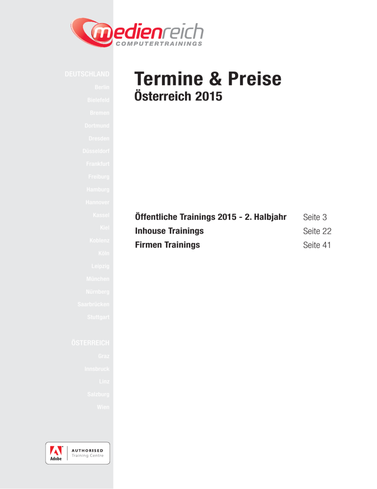 DEUTSCHLAND Berlin Bielefeld Termine & Preise Österreich 2015 Bremen Dortmund Dresden Düsseldorf Frankfurt Freiburg Hamburg Hannover Kassel Kiel Koblenz Köln Leipzig München Nürnberg Saarbrücken Stuttgart ÖSTERREICH Graz Innsbruck Linz Salzburg Wien Öffentliche Trainings 2015 - 2. Halbjahr Seite 3 Inhouse Trainings Seite 22 Firmen Trainings Seite 41 Öffentliche Trainings / Individuelle Trainings Öffentliche Trainings ❯ Offener Teilnehmerkreis ❯ Schulungen werden zeitgleich an allen unseren Schulungsorten angeboten ❯ Schulung in unseren modernen Schulungsräumen ❯ Termine aus unserer Termin- und Preisliste ❯ Schulungsinhalte aus unserem Trainingsprogramm ❯ Trainings werden auf Windows PCs durchgeführt Alle Computerkurse und Schulungen aus unserem Trainingsangebot sowie viele weitere Themen bieten wir Ihnen auch als individuelle Trainings an. Individuelle Trainings Inhouse Trainings ❯ Wir kommen zu Ihnen. ❯ Sie bestimmen den Schulungstermin. ❯ Schulungsschwerpunkte können individuell aus unserem Trainingsprogramm gewählt werden. Nutzen Sie die Vort eines individuel eile len Trainings: ✔ Freie Termin wahl der Schulung ✔ Individuelle Betreuung durch den Traine r ✔ Wir kommen zu Ihnen oder Sie zu uns Firmen Trainings ❯ Sie kommen zu uns. ❯ Individuelle Schulungstermine sind möglich. ❯ Schulungsschwerpunkte können individuell aus unserem Trainingsprogramm gewählt werden. Projekt Trainings ❯ Sie finden Ihren Wunschkurs nicht in unserem Schulungsprogramm? Als Projekt Training können wir Ihnen fast jedes beliebige Kursthema anbieten. ❯ Sie bestimmen den Schulungstermin. ❯ Wir kommen zu Ihnen oder Sie zu uns. Gerne erstellen wir Ihnen ein persönliches Angebot. ✆ 0800 555 0 116 kostenfreie Serviceline medienreich Computertrainings, Frank Schmittat e.K. • Kreuzstraße 34 • 33602 Bielefeld Fon: +49 (0) 521-968774-0 • Fax: +49 (0) 521-968774-90 • [email protected] • www.medienreich.de Öffentliche Trainings 2. Halbjahr 2015 Die Trainings werden zeitgleich an allen Schulungsorten und mit den aktuellen Software-Versionen angeboten. ÖSTERREICH: Düsseldorf Graz • • Innsbruck Frankfurt • • Freiburg Linz • • Salzburg Hamburg • Trainings • Wien Hannover • DEUTSCHLAND: Kassel • Tage Juli Kiel • Koblenz August • Köln • September Berlin Leipzig Oktober • • Bielefeld München November • Dezember • Bremen Nürnberg • • Dortmund • Dresden Saarbrücken • Stuttgart Preis € (ohne MwSt.) pro Tag Komplett Preis € (inkl. 20% MwSt.) pro Tag Komplett 545 654 3D-Visualisierung - CAD 3D in Adobe Photoshop Extended 1 3D Visualisierungen mit Maxon Cinema 4D und Adobe After Effects 5 23.07. 27.08. 24.09. 22.10. 26.11. 17.12. Autodesk 3ds Max 3 20.-22.07. 17.-19.08. 21.-23.09. 19.-21.10. 16.-18.11. 07.-09.12. 1.315 1.578 Autodesk AutoCAD - 3D-Konstruktionen 2 27.-28.07. 24.-25.08. 28.-29.09. 26.-27.10. 23.-24.11. 14.-15.12. 1.315 1.578 Autodesk AutoCAD - Blöcke und externe Referenzen 1 09.07. 13.08. 10.09. 08.10. 12.11. 10.12. 655 786 Autodesk AutoCAD - Dynamische Blöcke und Parameterbemaßung 2 01.-02.07. 05.-06.08. 02.-03.09. 07.-08.10. 04.-05.11. 02.-03.12. 1.095 1.314 Autodesk AutoCAD - Effizient einsetzen 1 Autodesk AutoCAD - Fortschritt 2 09.-10.07. 13.-14.08. 10.-11.09. 08.-09.10. 12.-13.11. 10.-11.12. 1.205 1.446 Autodesk AutoCAD - Für Architekten 4 06.-09.07. 03.-06.08. 07.-10.09. 05.-08.10. 02.-05.11. 07.-10.12. 1.975 2.370 Autodesk AutoCAD - Grundlagen - Aufbau 3 13.-15.07. 10.-12.08. 14.-16.09. 12.-14.10. 09.-11.11. 14.-16.12. 1.425 1.710 Dieses Thema bieten wir nicht als öffentliches Training an, sondern nur als Inhouse und / oder Firmen Training. 535 642 Dieses Thema bieten wir nicht als öffentliches Training an, sondern nur als Inhouse und / oder Firmen Training. Autodesk AutoCAD - Layout und Plotmanagement 1 22.07. 26.08. 23.09. 28.10. 25.11. 16.12. 655 786 Autodesk AutoCAD - Programmierung mit AutoLISP - Grundlagen 3 20.-22.07. 17.-19.08. 21.-23.09. 19.-21.10. 16.-18.11. 07.-09.12. 1.645 1.974 Autodesk AutoCAD - Update auf die neueste Version 1 23.07. 27.08. 24.09. 22.10. 26.11. 17.12. 545 654 Autodesk AutoCAD Architecture 3 01.-03.07. 05.-07.08. 02.-04.09. 07.-09.10. 04.-06.11. 02.-04.12. 1.755 2.106 Autodesk AutoCAD Architecture - Für Projektadministratoren 1 Autodesk AutoCAD Civil 3D Grundlagen 4 13.-16.07. 10.-13.08. 14.-17.09. 12.-15.10. 09.-12.11. 14.-17.12. 2.195 2.634 Autodesk AutoCAD LT 3 22.-24.07. 26.-28.08. 23.-25.09. 28.-30.10. 25.-27.11. 16.-18.12. 1.425 1.710 Dieses Thema bieten wir nicht als öffentliches Training an, sondern nur als Inhouse und / oder Firmen Training. Autodesk AutoCAD Map 3D - Grundlagen 1 02.07. 06.08. 03.09. 01.10. 05.11. 03.12. 1.095 1.314 Autodesk AutoCAD Mechanical 4 20.-23.07. 17.-20.08. 21.-24.09. 19.-22.10. 16.-19.11. 07.-10.12. 1.975 2.370 Autodesk Inventor - Blechbearbeitung 1 23.07. 27.08. 24.09. 22.10. 26.11. 17.12. 775 930 Autodesk Inventor - Fortschritt 2 13.-14.07. 10.-11.08. 14.-15.09. 12.-13.10. 09.-10.11. 14.-15.12. 1.315 1.578 Autodesk Inventor - Für Key User 2 13.-14.07. 10.-11.08. 14.-15.09. 12.-13.10. 09.-10.11. 14.-15.12. 1.315 1.578 Autodesk Inventor - Grundlagen - Aufbau 4 06.-09.07. 03.-06.08. 07.-10.09. 05.-08.10. 02.-05.11. 07.-10.12. 1.975 2.370 Autodesk Inventor - Studio Rendering 1 01.07. 05.08. 02.09. 07.10. 04.11. 02.12. 875 1.050 Autodesk Inventor Professional - Belastungsanalyse 2 27.-28.07. 24.-25.08. 28.-29.09. 26.-27.10. 23.-24.11. 14.-15.12. 1.315 1.578 Autodesk Inventor Professional - Dynamische Simulation 2 20.-21.07. 17.-18.08. 21.-22.09. 19.-20.10. 16.-17.11. 07.-08.12. 1.315 1.578 Autodesk Maya - Grundlagen 5 Dieses Thema bieten wir nicht als öffentliches Training an, sondern nur als Inhouse und / oder Firmen Training. Autodesk Revit Architecture - Bauteilfamilien 1 Dieses Thema bieten wir nicht als öffentliches Training an, sondern nur als Inhouse und / oder Firmen Training. Autodesk Revit Architecture - Fortsch