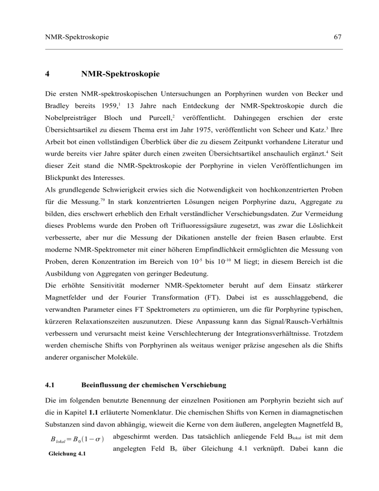 NMR-Spektroskopie 4 67 NMR-Spektroskopie Die ersten NMR-spektroskopischen Untersuchungen an Porphyrinen wurden von Becker und Bradley bereits 1959,1 13 Jahre nach Entdeckung der NMR-Spektroskopie durch die Nobelpreisträger Bloch und Purcell,2 veröffentlicht. Dahingegen erschien der erste Übersichtsartikel zu diesem Thema erst im Jahr 1975, veröffentlicht von Scheer und Katz.3 Ihre Arbeit bot einen vollständigen Überblick über die zu diesem Zeitpunkt vorhandene Literatur und wurde bereits vier Jahre später durch einen zweiten Übersichtsartikel anschaulich ergänzt.4 Seit dieser Zeit stand die NMR-Spektroskopie der Porphyrine in vielen Veröffentlichungen im Blickpunkt des Interesses. Als grundlegende Schwierigkeit erwies sich die Notwendigkeit von hochkonzentrierten Proben für die Messung.79 In stark konzentrierten Lösungen neigen Porphyrine dazu, Aggregate zu bilden, dies erschwert erheblich den Erhalt verständlicher Verschiebungsdaten. Zur Vermeidung dieses Problems wurde den Proben oft Trifluoressigsäure zugesetzt, was zwar die Löslichkeit verbesserte, aber nur die Messung der Dikationen anstelle der freien Basen erlaubte. Erst moderne NMR-Spektrometer mit einer höheren Empfindlichkeit ermöglichten die Messung von Proben, deren Konzentration im Bereich von 10-5 bis 10-10 M liegt; in diesem Bereich ist die Ausbildung von Aggregaten von geringer Bedeutung. Die erhöhte Sensitivität moderner NMR-Spektometer beruht auf dem Einsatz stärkerer Magnetfelder und der Fourier Transformation (FT). Dabei ist es ausschlaggebend, die verwandten Parameter eines FT Spektrometers zu optimieren, um die für Porphyrine typischen, kürzeren Relaxationszeiten auszunutzen. Diese Anpassung kann das Signal/Rausch-Verhältnis verbessern und verursacht meist keine Verschlechterung der Integrationsverhältnisse. Trotzdem werden chemische Shifts von Porphyrinen als weitaus weniger präzise angesehen als die Shifts anderer organischer Moleküle. 4.1 Beeinflussung der chemischen Verschiebung Die im folgenden benutzte Benennung der einzelnen Positionen am Porphyrin bezieht sich auf die in Kapitel 1.1 erläuterte Nomenklatur. Die chemischen Shifts von Kernen in diamagnetischen Substanzen sind davon abhängig, wieweit die Kerne von dem äußeren, angelegten Magnetfeld Bo B lokal = B 0 1− Gleichung 4.1 abgeschirmt werden. Das tatsächlich anliegende Feld Blokal ist mit dem angelegten Feld Bo über Gleichung 4.1 verknüpft. Dabei kann die NMR-Spektroskopie 68 Abschirmungskonstante σ noch in mehrere Komponenten zerlegt = dia para ' werden (Gleichung 4.2). Die wichtigsten dieser Komponenten sind σdia, Gleichung 4.2 σpara und σ’. Der diamagnetische Anteil σdia bezieht sich auf das in der Elektronenhülle des betreffenden Kerns durch das äußere Magnetfeld induzierte Feld. (Elektronen in kugelsymmetrischen s-Orbitalen schirmen stärker ab als kernferne Elektronen). Der paramagnetische Term σpara bezieht sich auf die Anregung von p-Elektronen im Magnetfeld und wirkt der diamagnetischen Abschirmung entgegen (in der 1 H-NMR- Spektroskopie ist daher nur σdia wichtig). Der Faktor σ’ ist die Abschirmungskomponente, die von Nachbargruppen verursacht wird. Diese Komponente ist ebenfalls diamagnetisch wie σdia, hat ihren Ursprung aber in magnetischen Feldern, die von Nachbargruppen erzeugt werden. Dabei spielen delokalisierte π-Systeme (Ringstromeffekte) und Carbonylgruppen (Anisotropieeffekte) eine wichtige Rolle. Diese Nachbargruppeneffekte können eine schwächere oder stärkere Abschirmung des beobachteten Kerns in Abhängigkeit von der Orientierung der lokalen Gruppen verursachen.5 Die chemischen Verschiebungen von Porphyrinprotonen hängen sehr stark von der Entfernung und der Orientierung des Protons in Bezug auf die π-Elektronen des Ringes ab. Protonen oberhalb oder innerhalb des Porpyhrinringes erfahren einen abschirmenden Effekt, wohingegen Protonen, die sich in der Ringebene, aber außerhalb des Ringes befinden, stark entschirmt werden. Aufgrund dieser Abhängigkeit von Entfernung und Orientierung sind die einzelnen Shifts gut geeignet, um inter- und intramolekulare Wechselwirkungen zu erkennen. 4.2 Zweidimensionale NMR-Spektroskopie Unsymmetrische Porphyrine sind für viele Zwecke von zentraler Bedeutung (siehe Kapitel 1), ihre NMR-Spektren sind aber weitaus komplizierter als die von symmetrischen Porphyrinen. Die Struktursicherung solcher Verbindungen wurde durch die Entwicklung der zweidimensionalen NMR-Spektroskopie entscheidend erleichtert.6,7 Diese Technik ermöglicht es, in einer zweidimensionalen Darstellung Kreuzpeaks für in Beziehung stehende Kerne zu erhalten. Dazu werden auf beiden Frequenzachsen chemische Verschiebungen aufgetragen. NMR-Spektroskopie 4.2.1 69 COSY Ein COSY-Experiment (correlated spectroscopy) liefert anhand von homonuklearen 1 H- Verschiebungskorrelationen Aussagen über die 1H,1H-Kopplungen in einem Molekül.8 Ein solches Experiment ersetzt eine Reihe von Messungen mit selektiver Spin-Spin-Entkopplung und hat besondere Vorzüge bei der Erkennung von Fernkopplungen. Eine COSY-Messung ermöglicht es auch, einzelnen Protonen, deren Signale im 1H-NMR Spektrum in einer Anhäufung von Multipletts nicht klar erkennbar sind, ihre korrekte chemische Verschiebung zuzuordnen. Gemessen wird der Abfall der transversalen Magnetisierung (FID). Der erste Puls verursacht ein Kippen aller Magnetisierungsvektoren in die xy-Ebene. Während der Evolutionszeit t1 bilden sich aufgrund der skalaren Kopplung Spinzustände aus, die zu beiden Kopplungspartnern gehören. Der zweite Puls erzwingt eine Vertauschung der entsprechenden Spinzustände. Während der Detektionszeit t2 ergibt sich aus diesen Spinzuständen wieder eine messbare Magnetisierung. 105 Abbildung 4.1: COSY-Spektrum des 5-Hexylporphyrins 105. NMR-Spektroskopie 70 Das Empfängersignal ist eine Funktion der Detektionszeit t2. Wird die zwischen dem ersten Puls der gewählten Impulssequenz und der Datenaufnahme liegende 