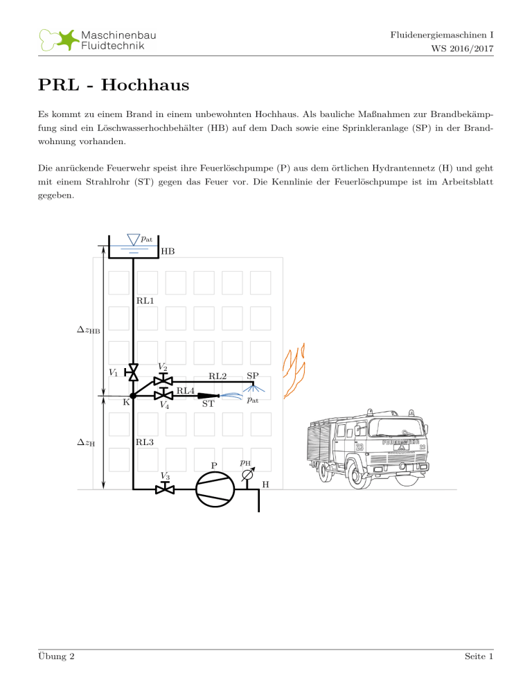 Fluidenergiemaschinen I WS 2016/2017 PRL - Hochhaus Es kommt zu einem Brand in einem unbewohnten Hochhaus. Als bauliche Maßnahmen zur Brandbekämpfung sind ein Löschwasserhochbehälter (HB) auf dem Dach sowie eine Sprinkleranlage (SP) in der Brandwohnung vorhanden. Die anrückende Feuerwehr speist ihre Feuerlöschpumpe (P) aus dem örtlichen Hydrantennetz (H) und geht mit einem Strahlrohr (ST) gegen das Feuer vor. Die Kennlinie der Feuerlöschpumpe ist im Arbeitsblatt gegeben. pat HB RL1 ∆zHB V2 V1 RL2 RL4 K ∆zH V4 ST SP pat RL3 P pH V3 H Übung 2 Seite 1 Fluidenergiemaschinen I WS 2016/2017 Folgende Daten sind Ihnen bekannt: Allgemeine Daten Dichte des Wassers ρw = 1000 kg·m-3 Erdbeschleunigung g = 10 m·s-2 Höhendifferenz zwischen Hydranten \ Knoten K ∆zH = 20 m Höhendifferenz zwischen Hochbehälter \ Knoten K ∆zHB = 30 m Atmosphärendruck pat = 1 bar Absolutdruck des Hydrantennetzes pH = 5 bar Geodätische Höhendifferenzen Drücke Spezifische Dissipationsenergie in den Rohrleitungen RL1 ϕ = 100 m2 ·s-2 bei V̇ = 0,1 m3 ·s-1 RL2 ϕ = 75 m2 ·s-2 bei V̇ = 0,05 m3 ·s-1 RL3 ϕ = 40,5 m2 ·s-2 bei V̇ = 0,045 m3 ·s-1 RL4 ϕ = 140,625 m2 ·s-2 bei V̇ = 0,075 m3 ·s-1 Hinweise: Die Höhendifferenz zwischen Sprinkler/Strahlrohr und Knoten K kann vernachlässigt werden. Änderungen der Höhendifferenzen in Folgen von Füllstandsänderungen können vernachlässigt wer- den. Dissipation durch Geschwindigkeitsänderungen beim Ein- und Ausströmen des Wassers in bzw. aus den Rohrleitungen kann vernachlässigt werden. Die spezifische kinetische Energie im Hydrantennetz und im Hochbehälter können als vernachläs- sigbar angesehen werden. Die spezifische kinetische Energie beim Austritt aus der Sprinkleranlage und dem Strahlrohr können als vernachlässigbar angesehen werden. Die Ventile können als verlustfrei betrachtet werden. Übung 2 Seite 2 Fluidenergiemaschinen I WS 2016/2017 Aufgaben: Vor Eintreffen der Feuerwehr sind die Ventile V3 und V4 geschlossen. Die Sprinkleranlage wird aus dem Hochbehälter gespeist. 1. Zeichnen Sie die auf den Knotenpunkt K reduzierten Kennlinien des Hochbehälters und der Sprinkleranlage in das Arbeitsblatt ein. Kennzeichnen Sie den Zusammenarbeitspunkt. V̇ [l·s-1 ] (eK )HB [m2 ·s-2 ] (eK )SP [m2 ·s-2 ] 0 50 100 150 200 (V̇ = 87 l·s-1 , eK = 327 m2 ·s-2 ) Die Feuerwehr trifft ein, schließt ihre Pumpe an die Löschwasserversorgung an und öffnet das Ventil V3. Nur V4 ist noch geschlossen. 2. Zeichnen Sie die auf den Knotenpunkt K reduzierte Kennlinie der Feuerlöschpumpe in das Arbeitsblatt ein. V̇ [l·s-1 ] (wf,P )red [m2 ·s-2 ] 0 50 100 150 200 3. Entscheiden Sie, ob der Hochbehälter zum Versorger oder Verbraucher wird. 4. Kennzeichnen Sie den neuen Zusammenarbeitspunkt der Sprinkleranlage. (V̇ = 99 l·s-1 ; eK = 394 m2 ·s-2 ) Nun beginnen die Löscharbeiten mit dem Strahlrohr. Auch die Sprinkleranlage ist weiterhin im Betrieb. Alle Ventile sind geöffnet. 5. Zeichnen Sie die auf den Knotenpunkt K reduzierte Kennlinie des Strahlrohres in das Arbeitsblatt ein. V̇ [l·s-1 ] (eK )ST [m2 ·s-2 ] 0 50 100 150 200 6. Welcher Zusammenarbeitspunkt ergibt sich im System? Wie groß sind die Volumenströme im Strahlrohr und in der Sprinkleranlage? (V̇ = 182 l·s-1 ; eK = 328 m2 ·s-2 ; V̇ST = 96 l·s-1 ; V̇SP = 86 l·s-1 ) Mit fortschreitender Branddauer hat sich der Hochbehälter entleert. Es sind weiterhin alle Ventile geöffnet. 7. Kennzeichnen Sie den neuen Zusammenarbeitspunkt des Systems. (V̇ = 118 l·s-1 ; eK = 195 m2 ·s-2 ) Übung 2 Seite 3 Fluidenergiemaschinen I WS 2016/2017 800 700 spezifische Förderarbeit / spezifische Knotenenergie [m²/s²] 600 500 400 300 200 100 0 0 50 100 150 200 Volumenstrom [l/s] Übung 2 Seite 4