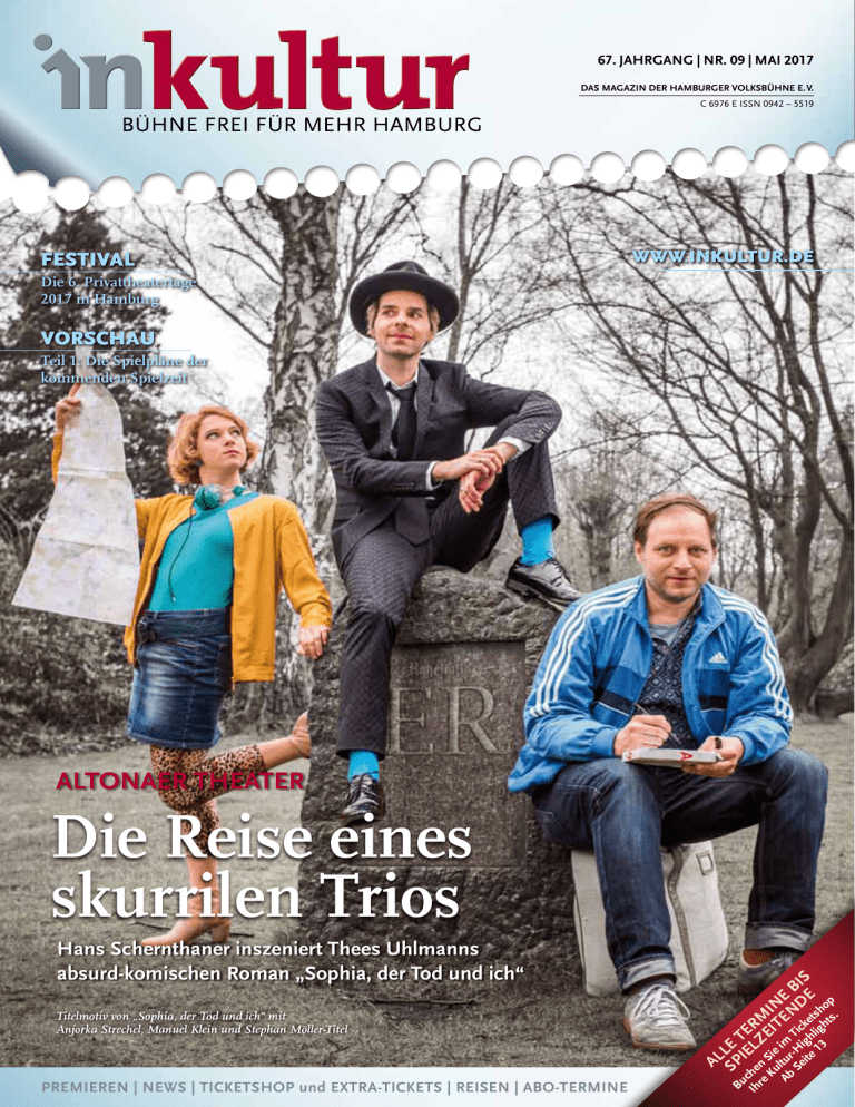 67. Jahrgang | Nr. 09 | Mai 2017 Das Magazin der Hamburger Volksbühne e. V. C 6976 E ISSN 0942 – 5519 Festival www.inkultur.de Die 6. Privattheatertage 2017 in Hamburg Vorschau Teil 1: Die Spielpläne der kommenden Spielzeit Altonaer Theater Titelmotiv von „Sophia, der Tod und ich“ mit Anjorka Strechel, Manuel Klein und Stephan Möller-Titel Premieren | News | Ticketshop und EXTRA-TICKETS | Reisen | ABO-Termine 13 gh h ts op . Hans Schernthaner inszeniert Thees Uhlmanns absurd-komischen Roman „Sophia, der Tod und ich“ Al le Sp Bu T i Ih che el er z m re n Ku Sie ei in t Ab ltur im en e b Se -Hi Tic ite gh ke de is t li s Die Reise eines skurrilen Trios 1 Editorial Neu bei inkultur? So funktioniert es bei uns: Voller Vorfreude stressfrei ins Theater gehen, die Eintrittskarten bereits in der Tasche haben – mit Freunden und Familie nebeneinander sitzen – so können auch Sie Kulturangebote genießen! Mit unseren Abos haben Sie alle Möglichkeiten, sich Ihre kulturellen Wünsche zu erfüllen. Sie sind nicht nur gut informiert, sondern immer direkt dabei: Flexibilität ohne Grenzen, Kulturgenuss pur quer durch Hamburgs Theaterlandschaft. Kurz: Wir haben für jeden Kultur-Typ bestimmt das Passende. Liebe Leserinnen, liebe Leser, Wahl-Abo inkultur-Pass Sie planen Ihr Kulturprogramm. Flexibilität ohne Grenzen: Sie können sich Ihre Stücke und Termine quer durch die Hamburger Spielstätten selbst zusammenstellen. Für jedermann zu jeder Zeit. Sie planen unabhängig Ihr Kulturprogramm: Sie erhalten Coupons und buchen flexibel direkt vor Ort in den teilnehmenden Theatern. Aufruf-Abonnements Wir planen für Sie – Theater, Stücke und Termine sind zu Beginn der Spielzeit bekannt. So können Sie Ihren ganz persönlichen „KulturKalender“ für eine Spielzeit im Voraus planen. Wir planen für Sie – Theater, Stücke und Termine werden Ihnen im Laufe einer Spielzeit mitgeteilt. Vertrauen Sie unserer Kulturkompetenz – lassen Sie sich überraschen! Eine Übersicht aller Abonnements für die neue Spielzeit 2017/2018 finden Sie auf Seite 46. Service-Nummern wir sind für sie da Anfahrt mit Bus + Bahn Für Kartenbestellungen und Fragen rund ums Abo erreichen Sie uns per Telefon unter 040 – 22 700 666. Bequemer ist es, wenn Sie Ihre Bestellungen per E-Mail: [email protected] oder per Fax: 040 – 22 700 688 aufgeben. Montag bis Mittwoch 9 bis 16 Uhr Donnerstag 9 bis 18 Uhr Freitag 9 bis 14 Uhr inkultur – eine Marke der Hamburger Volksbühne e.V. Graumannsweg 31, 22087 Hamburg OnlIne rund um die uhr Bankverbindung Der Weg zu unserer Geschäftsstelle: Nehmen Sie die U-Bahn-Line 3 bis zur Haltestelle Uhlandstraße. Von dort sind es ca. 5 Minuten Fußweg. Mit dem Bus fahren Sie mit der Linie 6 bis zur Haltestelle Graumannsweg oder mit den Linien 37, 172 und 173 bis zur Haltestelle Mundsburger Brücke. An dieser Stelle möchte ich mich nun in eigener Sache an Sie wenden: Die oben schon kurz erwähnten finanziellen Aspekte des Theaterschaffens führen auch in diesem Jahr wieder zu Steigerungen bei den Ticketpreisen – die die Theater an uns weitergeben müssen. Daher wird es bei unseren Abo-Tarifen zur neuen Spielzeit zu leichten Erhöhungen kommen, die aber zum Glück sehr, sehr moderat ausfallen. Und wir freuen uns, liebe Mitglieder, dass wir die Höhe des Mitgliedbeitrages weiterhin stabil bei € 42 halten können – und das bereits im achten Jahr! Die neue Preisübersicht finden Sie auf Seite 47. (Einen Bericht zur Mitglieder- und Vertretrversammlung vom 25. April 2017 erscheint in der Juniausgabe). Bleiben Sie uns also weiterhin treu und erleben mit uns die Vielfalt des Hamburger Theater- und Musikgeschehens. Herzlichst Ihr Titelthema 4 Fünf Fragen an 5 Uraufführung von Thees Uhlmanns absurdkomischem Roman „Sophia, der Tod und ich“ Hans Schernthaner – Regisseur Premieren Die aktuellen Neuproduktionen der Privat- und Staatstheater Spielzeitvorschau 6 Festival 9 inkultur wirft einen ersten Blick auf die Spielpläne der kommenden Saison Die 6. Privattheatertage 2017 in Hamburg Nachlese Lars-Luis Linek und Gerd Spiekermann auf „Hamborg Tuur“ und inkultur-DoKo-Turnier Ausstellung 10 inkultur-Dankeschön 11 Hamburg neu erlebt 12 Ticketshop 13 Extra-Tickets 43 Kultours 41 Aufruf-Abos 43 „WARTEN. Zwischen Macht und Möglichkeit“ in der Galerie der Gegenwart Einladung zum Abschlusskonzert des 5. Jugendmusikfestivals Hamburg-Shanghai Die beliebten City-Touren, die Ihnen neue Blickwinkel und Erkenntnisse bescheren Mehrtägige Kulturreisen und Tagesfahrten Frühlings-Schnupper-Abo 46 2 inkultur, herausgegeben von der Hamburger Volksbühne e.V., Graumannsweg 31, 22087 Hamburg Telefon: (040) 227 006 66, Fax: (040) 229 64 94, E-Mail: [email protected] Geschäftsführung: Bertram Scholz, Redaktion: Patrick Giese (Ltg.), Beate Deimel, Brigitte Ehrich, Isabelle Hofmann, Janine Thierfelder, Susanne Peemöller, Carolin Lola-Schmidt, Monika Seifert, Bertram Scholz, Mitarbeit: Anneke Bensel, Karsten Bensel, Gerda Jammer, Ullrich Voigt Art Direction und Gestaltung: Patrick Giese, HKS+B Werbeagentur Vertrieb: AWU GmbH, Kleine Bahnstraße 10, 22525 Hamburg Druck: PerCom Vertriebsgesellschaft mbH, Am Busbahnhof 1, 24784 Westerrönfeld Titelmotiv: Ensemble von „Sophia, der Tod und ich“; Altonaer Theater, Foto: G2 Baraniak Änderungen vorbehalten. Haftung für fehlerhafte Daten ausgeschlossen. Impressum Erfreulicherweise finden auch in diesem Jahr wieder die „Privattheatertage“ statt, vom 13. bis zum 25.Juni an verschiedenen Spielstätten. Zu diesem Festival werden zwölf herausragende Produktionen von Privatbühnen aus ganz Deutschland eingeladen. Eine neunköpfige Jury wählt die Aufführungen aus, unabhängig von Größe und Finanzkraft der Bühnen. Entstanden ist dieses Festival 2012 aus einer Initiative des Hamburger Intendanten Axel Schneider. Und jedes Jahr wieder stellt sich die drängende Frage, ob auch im nächsten Jahr dieses besondere Projekt aus Bundesmitteln gefördert w