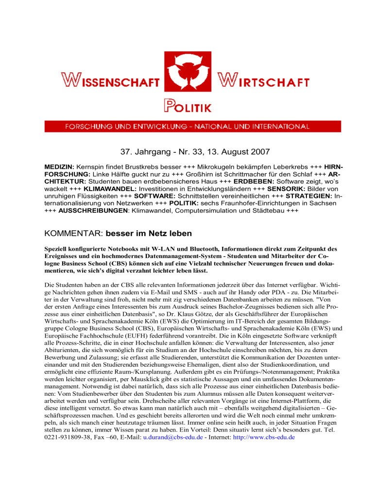 37. Jahrgang - Nr. 33, 13. August 2007 MEDIZIN: Kernspin findet Brustkrebs besser +++ Mikrokugeln bekämpfen Leberkrebs +++ HIRNFORSCHUNG: Linke Hälfte guckt nur zu +++ Großhirn ist Schrittmacher für den Schlaf +++ ARCHITEKTUR: Studenten bauen erdbebensicheres Haus +++ ERDBEBEN: Software zeigt, wo’ s wackelt +++ KLIMAWANDEL: Investitionen in Entwicklungsländern +++ SENSORIK: Bilder von unruhigen Flüssigkeiten +++ SOFTWARE: Schnittstellen vereinheitlichen +++ STRATEGIEN: Internationalisierung von Netzwerken +++ POLITIK: sechs Fraunhofer-Einrichtungen in Sachsen +++ AUSSCHREIBUNGEN: Klimawandel, Computersimulation und Städtebau +++ KOMMENTAR: besser im Netz leben Speziell konfigurierte Notebooks mit W-LAN und Bluetooth, Informationen direkt zum Zeitpunkt des Ereignisses und ein hochmodernes Datenmanagement-System - Studenten und Mitarbeiter der Cologne Business School (CBS) können sich auf eine Vielzahl technischer Neuerungen freuen und dokumentieren, wie sich’s digital verzahnt leichter leben lässt. Die Studenten haben an der CBS alle relevanten Informationen jederzeit über das Internet verfügbar. Wichtige Nachrichten gehen ihnen zudem via E-Mail und SMS - auch auf ihr Handy oder PDA - zu. Die Mitarbeiter in der Verwaltung sind froh, nicht mehr mit zig verschiedenen Datenbanken arbeiten zu müssen. "Von der ersten Anfrage eines Interessenten bis zum Ausdruck seines Bachelor-Zeugnisses bedienen sich alle Prozesse aus einer einheitlichen Datenbasis", so Dr. Klaus Götze, der als Geschäftsführer der Europäischen Wirtschafts- und Sprachenakademie Köln (EWS) die Optimierung im IT-Bereich der gesamten Bildungsgruppe Cologne Business School (CBS), Europäischen Wirtschafts- und Sprachenakademie Köln (EWS) und Europäische Fachhochschule (EUFH) federführend vorantreibt. Die in Köln eingesetzte Software verknüpft alle Prozess-Schritte, die in einer Hochschule anfallen können: die Verwaltung der Interessenten, also jener Abiturienten, die sich womöglich für ein Studium an der Hochschule einschreiben möchten, bis zu deren Bewerbung und Zulassung; sie erfasst alle Studierenden, unterstützt die Kommunikation der Dozenten untereinander und mit den Studierenden beziehungsweise Ehemaligen, dient also der Studienkoordination, und ermöglicht eine effiziente Raum-/Kursplanung. Außerdem gibt es ein Prüfungs-/Notenmanagement; Praktika werden leichter organisiert, per Mausklick gibt es statistische Aussagen und ein umfassendes Dokumentenmanagement. Notwendig ist dabei natürlich, dass sich alle Prozesse aus einer einheitlichen Datenbasis bedienen: Vom Studienbewerber über den Studenten bis zum Alumnus müssen alle Daten konsequent weiterverarbeitet werden und verfügbar sein. Drehscheibe aller relevanten Vorgänge ist eine Internet-Plattform, die diese intelligent vernetzt. So etwas kann man natürlich auch mit –ebenfalls weitgehend digitalisierten –Geschäftsprozessen machen. Und es geschieht bereits allerorten und wird die Welt noch einmal mehr umkrempeln, als sich manch einer heutzutage träumen lässt. Immer online sein heißt auch, in jeder Situation Fragen stellen zu können, immer Wissen parat zu haben. Ein Vorteil: Denn situativ lernt sich’s besonders gut. Tel. 0221-931809-38, Fax –60, E-Mail: [email protected] - Internet: http://www.cbs-edu.de 33/2007 WISSENSCHAFT – WIRTSCHAFT - POLITIK MEDIZIN: Kernspin findet Brustkrebs besser Eine aktuelle Studie könnte einen Paradigmenwechsel in der Früherkennung von Brustkrebs einleiten: Demnach ist die Magnetresonanztomographie (MRT) bei der Diagnostik von BrustkrebsVorstufen deutlich treffsicherer als die röntgengestützte Mammographie. Bislang galt die MRT als wenig geeignet, solche "intra-duktalen Mammakarzinome" aufzuspüren. Forscher der Universität Bonn kommen nun zu einem ganz anderen Ergebnis: In den vergangenen fünf Jahren haben sie mehr als 7.000 Frauen mit beiden Methoden untersucht. Bei insgesamt 167 Frauen fanden die Mediziner Brustkrebs-Frühformen 152 (92%) davon mittels MRT, 93 (56%) mittels Mammographie. Vor allem die Suche nach DCIS galt bislang als Domäne der Mammographie. Brustkrebs entsteht aus den Zellen, die die Milchgangswände von innen auskleiden. Zunächst verbleibt der Tumor noch im Milchgang. Mediziner sprechen von einem intraduktalen Karzinom oder eben DCIS (ductales carcinoma in-situ). In diesem Stadium nennt man es zwar schon Karzinom - tatsächlich handelt es sich aber noch um eine gutartige Erkrankung, die durch eine Operation immer heilbar ist. Erst wenn der Tumor aus den Milchgängen in das Drüsengewebe der Brust einwächst, kann er sich über Blut- oder Lymphgefäße im Körper verteilen. "Wenn wir DCIS finden und operativ entfernen, können wir die Entstehung von 'richtigem' Brustkrebs verhindern", erklärt die Bonner Radiologin Prof. Dr. Christiane Kuhl. "Wir vermeiden so die Entstehung einer oftmals lebensgefährlichen Erkrankung." Bislang galt die MRT –oder Kernspintomografie –als ungeeignet, um intra-duktale Karzinome aufzuspüren was einer der wesentlichen Gründe dafür war, allein die Mammographie zur Früherkennung einzusetzen. Einen Wermutstropfen gibt es freilich: "Um die Aufnahmen auszuwerten, braucht man einen geschulten Blick. Denn nicht der Magnet stellt die Diagnosen, sondern der Radiologe. Um Brustkrebsvorstufen in der MRT zu finden, müssen die Aufnahmen nach speziellen Gesichtspunkten beurteilt werden - das ist leider immer noch viel zu wenig bekannt", sagt Kuhl. Tel. 0228-287-19875, E-Mail: [email protected] Mikrokugeln bekämpfen Leberkrebs Ein Magdeburger Ärzteteam bestrahlt mit einem neuen Verfahren jetzt Tumore direkt in der Leber. Das Team der Klinik für Radiologie und Nuklearmedizin der Otto-von-Guericke-Universität Magdeburg behandelt Patienten, die an inoperablen Lebertumoren und Lebermetastasen leiden, mit der Selektiven Internen Radiotherapie (SIRT); dabei werden Krebsherde mithilfe winziger radioaktiver Kugeln direkt in der Leber beschossen.