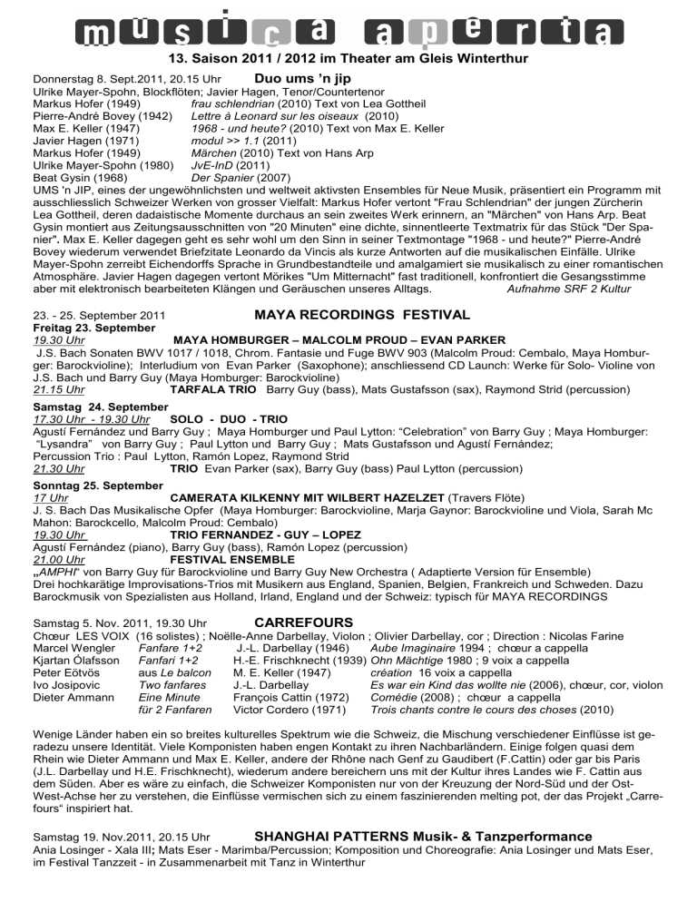 13. Saison 2011 / 2012 im Theater am Gleis Winterthur Donnerstag 8. Sept.2011, 20.15 Uhr Duo ums ’n jip Ulrike Mayer-Spohn, Blockflöten; Javier Hagen, Tenor/Countertenor Markus Hofer (1949) frau schlendrian (2010) Text von Lea Gottheil Pierre-André Bovey (1942) Lettre à Leonard sur les oiseaux (2010) Max E. Keller (1947) 1968 - und heute? (2010) Text von Max E. Keller Javier Hagen (1971) modul >> 1.1 (2011) Markus Hofer (1949) Märchen (2010) Text von Hans Arp Ulrike Mayer-Spohn (1980) JvE-InD (2011) Beat Gysin (1968) Der Spanier (2007) UMS 'n JIP, eines der ungewöhnlichsten und weltweit aktivsten Ensembles für Neue Musik, präsentiert ein Programm mit ausschliesslich Schweizer Werken von grosser Vielfalt: Markus Hofer vertont "Frau Schlendrian" der jungen Zürcherin Lea Gottheil, deren dadaistische Momente durchaus an sein zweites Werk erinnern, an "Märchen" von Hans Arp. Beat Gysin montiert aus Zeitungsausschnitten von "20 Minuten" eine dichte, sinnentleerte Textmatrix für das Stück "Der Spanier". Max E. Keller dagegen geht es sehr wohl um den Sinn in seiner Textmontage "1968 - und heute?" Pierre-André Bovey wiederum verwendet Briefzitate Leonardo da Vincis als kurze Antworten auf die musikalischen Einfälle. Ulrike Mayer-Spohn zerreibt Eichendorffs Sprache in Grundbestandteile und amalgamiert sie musikalisch zu einer romantischen Atmosphäre. Javier Hagen dagegen vertont Mörikes "Um Mitternacht" fast traditionell, konfrontiert die Gesangsstimme aber mit elektronisch bearbeiteten Klängen und Geräuschen unseres Alltags. Aufnahme SRF 2 Kultur 23. - 25. September 2011 MAYA RECORDINGS FESTIVAL Freitag 23. September 19.30 Uhr MAYA HOMBURGER – MALCOLM PROUD – EVAN PARKER J.S. Bach Sonaten BWV 1017 / 1018, Chrom. Fantasie und Fuge BWV 903 (Malcolm Proud: Cembalo, Maya Homburger: Barockvioline); Interludium von Evan Parker (Saxophone); anschliessend CD Launch: Werke für Solo- Violine von J.S. Bach und Barry Guy (Maya Homburger: Barockvioline) 21.15 Uhr TARFALA TRIO Barry Guy (bass), Mats Gustafsson (sax), Raymond Strid (percussion) Samstag 24. September 17.30 Uhr - 19.30 Uhr SOLO - DUO - TRIO Agustí Fernández und Barry Guy ; Maya Homburger und Paul Lytton: “Celebration” von Barry Guy ; Maya Homburger: “Lysandra” von Barry Guy ; Paul Lytton und Barry Guy ; Mats Gustafsson und Agustí Fernández; Percussion Trio : Paul Lytton, Ramón Lopez, Raymond Strid 21.30 Uhr TRIO Evan Parker (sax), Barry Guy (bass) Paul Lytton (percussion) Sonntag 25. September 17 Uhr CAMERATA KILKENNY MIT WILBERT HAZELZET (Travers Flöte) J. S. Bach Das Musikalische Opfer (Maya Homburger: Barockvioline, Marja Gaynor: Barockvioline und Viola, Sarah Mc Mahon: Barockcello, Malcolm Proud: Cembalo) TRIO FERNANDEZ - GUY – LOPEZ 19.30 Uhr Agustí Fernández (piano), Barry Guy (bass), Ramón Lopez (percussion) 21.00 Uhr FESTIVAL ENSEMBLE „AMPHI“ von Barry Guy für Barockvioline und Barry Guy New Orchestra ( Adaptierte Version für Ensemble) Drei hochkarätige Improvisations-Trios mit Musikern aus England, Spanien, Belgien, Frankreich und Schweden. Dazu Barockmusik von Spezialisten aus Holland, Irland, England und der Schweiz: typisch für MAYA RECORDINGS Samstag 5. Nov. 2011, 19.30 Uhr CARREFOURS Chœur LES VOIX (16 solistes) ; Noëlle-Anne Darbellay, Violon ; Olivier Darbellay, cor ; Direction : Nicolas Farine Marcel Wengler Fanfare 1+2 J.-L. Darbellay (1946) Aube Imaginaire 1994 ; chœur a cappella Kjartan Ólafsson Fanfari 1+2 H.-E. Frischknecht (1939) Ohn Mächtige 1980 ; 9 voix a cappella Peter Eötvös aus Le balcon M. E. Keller (1947) création 16 voix a cappella Ivo Josipovic Two fanfares J.-L. Darbellay Es war ein Kind das wollte nie (2006), chœur, cor, violon Dieter Ammann Eine Minute François Cattin (1972) Comédie (2008) ; chœur a cappella für 2 Fanfaren Victor Cordero (1971) Trois chants contre le cours des choses (2010) Wenige Länder haben ein so breites kulturelles Spektrum wie die Schweiz, die Mischung verschiedener Einflüsse ist geradezu unsere Identität. Viele Komponisten haben engen Kontakt zu ihren Nachbarländern. Einige folgen quasi dem Rhein wie Dieter Ammann und Max E. Keller, andere der Rhône nach Genf zu Gaudibert (F.Cattin) oder gar bis Paris (J.L. Darbellay und H.E. Frischknecht), wiederum andere bereichern uns mit der Kultur ihres Landes wie F. Cattin aus dem Süden. Aber es wäre zu einfach, die Schweizer Komponisten nur von der Kreuzung der Nord-Süd und der OstWest-Achse her zu verstehen, die Einflüsse vermischen sich zu einem faszinierenden melting pot, der das Projekt „Carrefours“ inspiriert hat. Samstag 19. Nov.2011, 20.15 Uhr SHANGHAI PATTERNS Musik- & Tanzperformance Ania Losinger - Xala III; Mats Eser - Marimba/Percussion; Komposition und Choreografie: Ania Losinger und Mats Eser, im Festival Tanzzeit - in Zusammenarbeit mit Tanz in Winterthur Ania Losinger und Mats Eser sind anlässlich der Shanghai-Weltausstellung 2010 drei Wochen im Spanischen Pavillon aufgetreten und haben Shanghai zu jeder Tages- und Nachtzeit kennengelernt. Diese unvergleichliche Stadt beherbergt traditionelle und hochmoderne Lebensweisen. Mit hoher Geschwindigkeit verändert sich ihr Gesicht laufend. Ein Gang durch ihre Strassen versetzt den Besucher in unaufhörlichen Taumel. Kontraste, grösser kaum vorstellbar, prägen die Atmosphäre. Die Menschen dieser 'Stadt des Drachens' bewegen sich zwischen Arbeitswahn, Gigantismus, Unsicherheit, Hoffnung, Sehnsucht, Armut, Würde, Schmutz und Glanz, ohne ihr Lächeln zu verlieren. Einzige Konstante bildet der riesige Fluss, der durch die schwindelerregend hohen Gebäude zieht und sich jede Nacht in ein Lichtermeer verwandelt. Die zwei Künstler haben sich durch diese Bilder und Eindrücke zu ihrer neuen Musik- & Tanzperformance SHANGHAI PATTERNS inspirieren lassen. In verschiedenen Musikläden Shanghais haben sie zudem alte chinesische Perkussionsinstrumente gefunden, die sie nun in ihr modernes Klangbild aus Xala III, Marimba 