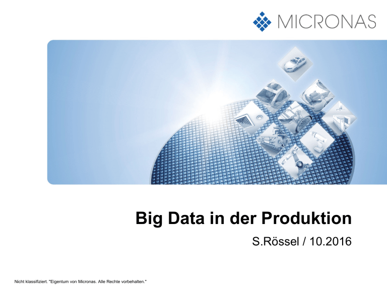 Big Data in der Produktion S.Rössel / 10.2016 Nicht klassifiziert. "Eigentum von Micronas. Alle Rechte vorbehalten." Big Data in der Produktion Micronas @ TDK Big Data - hilft es denn? Beispiele aus der Produktion Datenbeschaffung Datenspeicherung Organisation Nicht klassifiziert. "Eigentum von Micronas. Alle Rechte vorbehalten." 2 Micronas @ TDK Micronas Most Preferred Partner for Sensing and Control PPM Trend Seit 2016 Teil der TDK Gruppe BU Sensors Schätzwert; Weitere Feldrückläufer möglich Schwerpunkt Hall-Sensoren für Automotive Halbleiter-Fertigung ~400 Mio. Bauteile / Jahr Hoher Automatisierungsgrad Hohe Qualitätsanforderungen (Automotive) Nicht klassifiziert. "Eigentum von Micronas. Alle Rechte vorbehalten." 3 Micronas within TDK – TDK Product Portfolio TDK is one of the largest electronic components makers with broad and diversified products Film Application Products: ¥222B 19% Energy devices Passive Components: ¥576B 50% Capacitors: ¥150B 13% Applied films Film Application Products Ceramic capacitors Capacitors Aluminum Film electrolytic capacitors capacitors 13% 19% Magnetic Application Products: ¥315B 27% Recording Devices ¥220B 19% Recording heads & suspensions for HDD Recording Devices 19% Other Magnetic Application Products ¥96B 8% Power supplies Magnets Nicht klassifiziert. "Eigentum von Micronas. Alle Rechte vorbehalten." Inductive Devices Consolidated Sales: JPY1,083bn/ EUR7.8bn (FY2016) Other Magnetic Application Products 8% Inductive Devices: ¥149B 13% 13% Other Passive Components 24% Other Passive Components: ¥ 276B 24% High-frequency Piezoelectric material devices products, Circuit protection components Other Other ¥39B 3% Magnetic Sheet Sensors Big Data in der Produktion Micronas @ TDK Big Data - hilft es denn? Beispiele aus der Produktion Datenbeschaffung Datenspeicherung Organisation Nicht klassifiziert. "Eigentum von Micronas. Alle Rechte vorbehalten." 5 Big Data in der Produktion Hilft es denn? Beispiel: Predictive Maintenance Überwachung der Stromaufnahme über FDC System Erhöhte Stromaufnahme ist Hinweis auf beginnendes Motor-Problem Motorwartung nach Bedarf Nicht klassifiziert. "Eigentum von Micronas. Alle Rechte vorbehalten." 6 Big Data in der Produktion Hilft es denn? Beispiel: Prozess- Überwachung Kontinuierliches Monitoring von Prozessdaten Beispiel 1: Prozesstemperaturverlauf rot = zu hohe Abweichung nach fehlerhafter Wartung SPC nur über Mittelwert, Hüllkurve überwachen? Nicht klassifiziert. "Eigentum von Micronas. Alle Rechte vorbehalten." 7 Big Data in der Produktion Hilft es denn? Beispiel: Part Average Test Ziel: Fehlerrate << 1ppm Mehrfach-Messung der ICs (Wafer/Final) - Statische Limits auf Messparameter PAT berechnet dynamische Limits - Analyse der Verteilung und Verteilungstyp - auf einzelne Messparameter - auf Kombinationen von Parametern Nicht klassifiziert. "Eigentum von Micronas. Alle Rechte vorbehalten." 8 Big Data in der Produktion Hilft es denn? Beispiel: R2R exposure dose glass mask with structured chrome layer photoresist substrate small lines substrate substrate CD (critical dimension) measurement: smallest representable structure Nicht klassifiziert. "Eigentum von Micronas. Alle Rechte vorbehalten." wide lines 9 Big Data in der Produktion Hilft es denn? cd target, control limits, specification limits Beispiel: R2R CD-R2Rcontroller lot stepper & cluster: coat, exposure, develop opt. inspection overlay measurement calculation model parameter after track out CD step CD measurement lot data overlay-R2Rcontroller Nicht klassifiziert. "Eigentum von Micronas. Alle Rechte vorbehalten." control limits, specification limits calculation of model parameter after overlay measurement 10 Big Data in der Produktion Hilft es denn? Beispiel: Virtual Metrology Ersetzen von einzelnen Messungen durch virtuelle Messungen Reduktion von Mess-Schritten Prozess-Modell: Abdeckung von Sonderfällen (Wartung, Produkt-Mix, Maschinen-Mix) Nicht klassifiziert. "Eigentum von Micronas. Alle Rechte vorbehalten." 11 Big Data in der Produktion Micronas @ TDK Big Data - hilft es denn? Beispiele aus der Produktion Datenbeschaffung Datenspeicherung Organisation Nicht klassifiziert. "Eigentum von Micronas. Alle Rechte vorbehalten." 12 Big Data in der Produktion Datenbeschaffung Anbindung der Maschinen Halbleiter- Standard SECS/HSMS (XML ähnliches Protokoll) Steuerungs-PC mit eigenem Interface (Files etc.) Automatisierungstechnik (A/D to http, Wago, Moxa etc.) Externe Sensorik Status ca. 400 integrierte Maschinen unterschiedliche Qualität der Integration Nicht klassifiziert. "Eigentum von Micronas. Alle Rechte vorbehalten." 13 Big Data in der Produktion Datenbeschaffung Probleme bei der Maschinen Integration Zuverlässigkeit der Anbindung Qualitätsrelevant keine Auslieferung ohne vollständige Daten Aktuelle IT Technik oft ignoriert (Redundanz, Transaktionssicherheit, Resilience…) Security ist ein Problem! Aufwand sehr hoch Autoradio „redet“ sofort mit jedem Smartphone Bei Fertigungsmaschinen und MES benötigt das Tage bis Wochen WARUM? Nicht klassifiziert. "Eigentum von Micronas. Alle Rechte vorbehalten." 14 Big Data in der Produktion Micronas @ TDK Big Data - hilft es denn? Beispiele aus der Produktion Datenbeschaffung Datenspeicherung Organisation Nicht klassifiziert. "Eigentum von Micronas. Alle Rechte vorbehalten." 15 Big Data in der Produktion Datenspeicherung Das Datenvolumen explodiert - Ja, wirklich! Micronas Data Volumina SAP / MES Engineering Database (CATO) Engineering Wünsche: ~ 1 TByte ~ 10 TByte (no problem) (teuer, aber OK) Messdaten nicht mehr sampeln (aktuell 1:10, 6 Monate online in DB) Fertigungsdaten korrelieren (FAB- FDC mit Test-Yield etc.) von Prozess-Monitoring zur Qualitätsanalyse Von lokalen Überwachungsroutinen zu Qualitätsdaten Immer mehr Bilder… ~ 100 TByte (relationale DB?) Nicht klassifiziert. "Eigentum von Micronas. Alle Rechte vorbehalten." 16 Entwicklungen im DB Markt Idee: Trennung von operativen und 