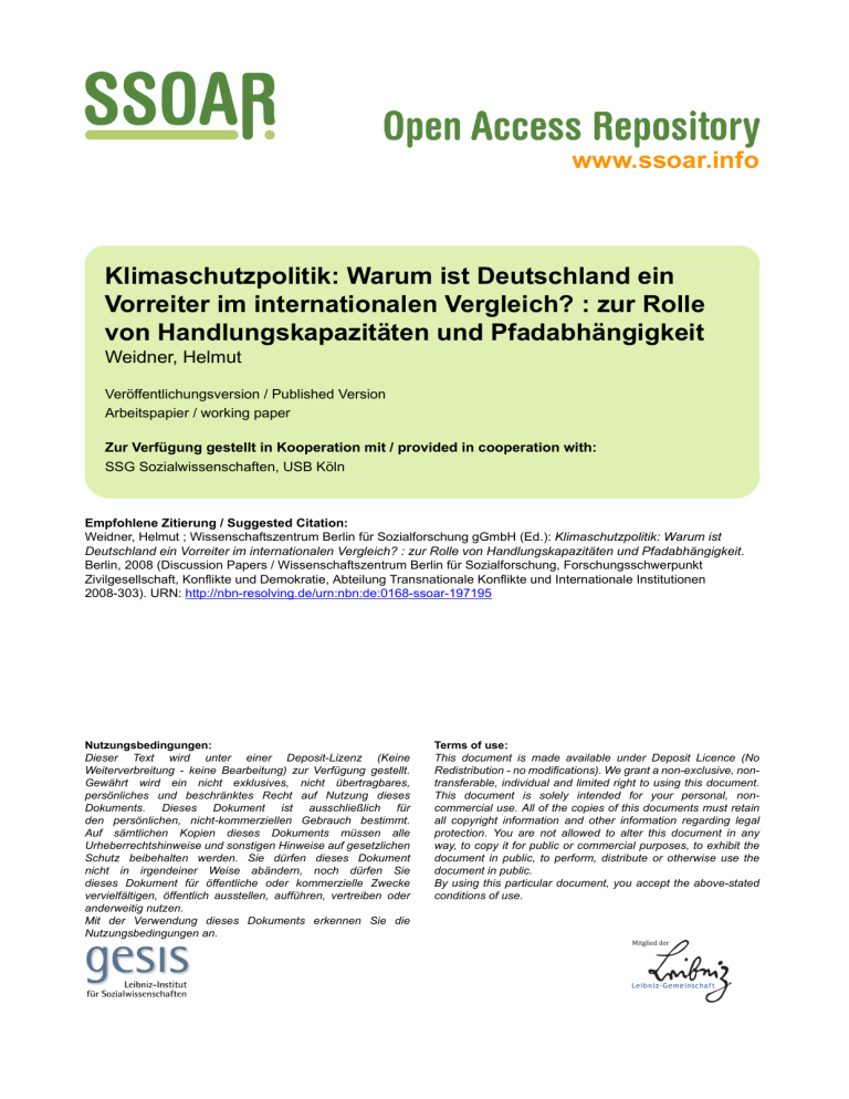 www.ssoar.info Klimaschutzpolitik: Warum ist Deutschland ein Vorreiter im internationalen Vergleich? : zur Rolle von Handlungskapazitäten und Pfadabhängigkeit Weidner, Helmut Veröffentlichungsversion / Published Version Arbeitspapier / working paper Zur Verfügung gestellt in Kooperation mit / provided in cooperation with: SSG Sozialwissenschaften, USB Köln Empfohlene Zitierung / Suggested Citation: Weidner, Helmut ; Wissenschaftszentrum Berlin für Sozialforschung gGmbH (Ed.): Klimaschutzpolitik: Warum ist Deutschland ein Vorreiter im internationalen Vergleich? : zur Rolle von Handlungskapazitäten und Pfadabhängigkeit. Berlin, 2008 (Discussion Papers / Wissenschaftszentrum Berlin für Sozialforschung, Forschungsschwerpunkt Zivilgesellschaft, Konflikte und Demokratie, Abteilung Transnationale Konflikte und Internationale Institutionen 2008-303). URN: http://nbn-resolving.de/urn:nbn:de:0168-ssoar-197195 Nutzungsbedingungen: Dieser Text wird unter einer Deposit-Lizenz (Keine Weiterverbreitung - keine Bearbeitung) zur Verfügung gestellt. Gewährt wird ein nicht exklusives, nicht übertragbares, persönliches und beschränktes Recht auf Nutzung dieses Dokuments. Dieses Dokument ist ausschließlich für den persönlichen, nicht-kommerziellen Gebrauch bestimmt. Auf sämtlichen Kopien dieses Dokuments müssen alle Urheberrechtshinweise und sonstigen Hinweise auf gesetzlichen Schutz beibehalten werden. Sie dürfen dieses Dokument nicht in irgendeiner Weise abändern, noch dürfen Sie dieses Dokument für öffentliche oder kommerzielle Zwecke vervielfältigen, öffentlich ausstellen, aufführen, vertreiben oder anderweitig nutzen. Mit der Verwendung dieses Dokuments erkennen Sie die Nutzungsbedingungen an. Terms of use: This document is made available under Deposit Licence (No Redistribution - no modifications). We grant a non-exclusive, nontransferable, individual and limited right to using this document. This document is solely intended for your personal, noncommercial use. All of the copies of this documents must retain all copyright information and other information regarding legal protection. You are not allowed to alter this document in any way, to copy it for public or commercial purposes, to exhibit the document in public, to perform, distribute or otherwise use the document in public. By using this particular document, you accept the above-stated conditions of use. DISCUSSION PAPER WISSENSCHAFTSZENTRUM BERLIN FÜR SOZIALFORSCHUNG SOCIAL SCIENCE RESEARCH CENTER BERLIN SP IV 2008-303 Klimaschutzpolitik: Warum ist Deutschland ein Vorreiter im internationalen Vergleich? Zur Rolle von Handlungskapazitäten und Pfadabhängigkeit1 Helmut Weidner2 1 Es handelt sich hier um den modifizierten und ergänzten Beitrag für das PVS-Sonderheft Nr. 39/2007, „Politik und Umwelt“, hg. von Klaus Jacob, Frank Biermann, Per-Olof Busch und Peter Henning Feindt. Für kritische Kommentare und Anregungen danke ich Klaus Jacob und Lutz Mez. Außerdem danke ich der Tamaki Foundation (Seattle und San Francisco), von deren Förderung des Projekts „Climate Change Policy and Equity“ die vorliegende Arbeit profitierte. 2 E-mail: Helmut Weidner<[email protected]> ZITIERWEISE z CITATION Helmut Weidner Klimaschutzpolitik: Warum ist Deutschland ein Vorreiter im internationalen Vergleich? Zur Rolle von Handlungskapazitäten und Pfadabhängigkeit Discussion Paper SP IV 2008-303, Wissenschaftszentrum Berlin für Sozialforschung 2008 Wissenschaftszentrum Berlin für Sozialforschung Reichpietschufer 50, 10785 Berlin, Federal Republic of Germany Tel.: +49/30/25491-0 z Fax: +49/30/25491-684 E-mail: [email protected] z Internet: http://www.wzb.eu Klimaschutzpolitik: Warum ist Deutschland ein Vorreiter im internationalen Vergleich? Zur Rolle von Handlungskapazitäten und Pfadabhängigkeit Zusammenfassung Die deutsche Klimapolitik gehört zu den anspruchvollsten und effektivsten im internationalen Vergleich. Während die Treibhausgas-Emissionen in etlichen Industrieländern auch nach Abschluss der UN-Klimarahmenkonvention (1992) gestiegen sind, sanken sie in Deutschland um rund 18 Prozent. Die Veränderungen im ostdeutschen Energieund Industriesektor haben dazu wesentlich, aber nicht alles, beigetragen. Auch um den Stand der internationalen Klimaverhandlungen wäre es ohne das deutsche Engagement weit schlechter bestellt. Was treibt Deutschland zu dieser Vorreiter- und Durchhaltepolitik im globalen Klimaschutz, eine Politik, die über einen langen Zeitraum nur selten schwächelte, trotz zwischenzeitlich wechselnder Regierungen, stark veränderter sozioökonomischer Rahmenbedingungen, erschwerter Bedingungen für weitergehende Senkung der Treibhausgas-Emissionen, erheblicher Konflikte mit machtvollen Wirtschaftslobbyisten etwa der Energie- und Automobilbranchen und einer bis heute andauernden mehrheitlichen Ablehnung der sogenannten Öko-Steuer durch die Bevölkerung? In diesem Beitrag werden verschiedene Erklärungsmöglichkeiten diskutiert, insbesondere der Einfluss eines „weitsichtigen Eigeninteresses“ an globalem Klimaschutz in Politik und Gesellschaft, die Eigendynamik institutioneller und anderer Kapazitäten für Klimaschutz und die politikprägende Kraft globaler Gerechtigkeitsnormen. Im Ergebnis lässt sich die deutsche Klimapolitik deuten als Summe der Kombinationseffekte von (a) begünstigenden Strukturen, Institutionen und Akteurskonfigurationen, die sich seit den 1970er Jahren im Verlauf der konfliktreichen Entwicklungen in der Luftreinhaltepolitik herausgebildet und im Sinne einer „positiven Pfadabhängigkeit“ gewirkt haben, und (b) einer weitverbreiteten (gleichwohl politisch fragilen) Sensibilisierung für globale Verantwortlichkeit und Verantwortung gegenüber „dem Rest der Welt“ im Sinne der hohen Akzeptanz von globaler Fairness als klimapolitische Handlungsnorm. Gleichwohl lässt die klare Dominanz des Konzepts der (national orientierten) „ökologischen Modernisierung“ über dem der (