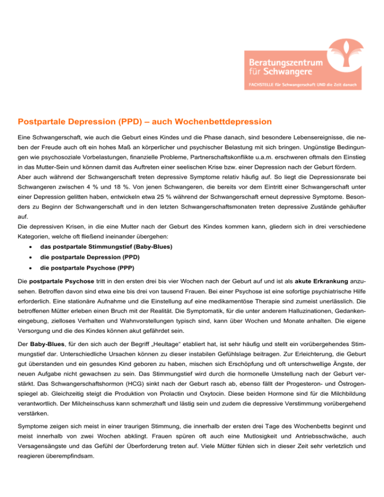 Postpartale Depression (PPD) – auch Wochenbettdepression Eine Schwangerschaft, wie auch die Geburt eines Kindes und die Phase danach, sind besondere Lebensereignisse, die neben der Freude auch oft ein hohes Maß an körperlicher und psychischer Belastung mit sich bringen. Ungünstige Bedingungen wie psychosoziale Vorbelastungen, finanzielle Probleme, Partnerschaftskonflikte u.a.m. erschweren oftmals den Einstieg in das Mutter-Sein und können damit das Auftreten einer seelischen Krise bzw. einer Depression nach der Geburt fördern. Aber auch während der Schwangerschaft treten depressive Symptome relativ häufig auf. So liegt die Depressionsrate bei Schwangeren zwischen 4 % und 18 %. Von jenen Schwangeren, die bereits vor dem Eintritt einer Schwangerschaft unter einer Depression gelitten haben, entwickeln etwa 25 % während der Schwangerschaft erneut depressive Symptome. Besonders zu Beginn der Schwangerschaft und in den letzten Schwangerschaftsmonaten treten depressive Zustände gehäufter auf. Die depressiven Krisen, in die eine Mutter nach der Geburt des Kindes kommen kann, gliedern sich in drei verschiedene Kategorien, welche oft fließend ineinander übergehen: • das postpartale Stimmungstief (Baby-Blues) • die postpartale Depression (PPD) • die postpartale Psychose (PPP) Die postpartale Psychose tritt in den ersten drei bis vier Wochen nach der Geburt auf und ist als akute Erkrankung anzusehen. Betroffen davon sind etwa eine bis drei von tausend Frauen. Bei einer Psychose ist eine sofortige psychiatrische Hilfe erforderlich. Eine stationäre Aufnahme und die Einstellung auf eine medikamentöse Therapie sind zumeist unerlässlich. Die betroffenen Mütter erleben einen Bruch mit der Realität. Die Symptomatik, für die unter anderem Halluzinationen, Gedankeneingebung, zielloses Verhalten und Wahnvorstellungen typisch sind, kann über Wochen und Monate anhalten. Die eigene Versorgung und die des Kindes können akut gefährdet sein. Der Baby-Blues, für den sich auch der Begriff „Heultage“ etabliert hat, ist sehr häufig und stellt ein vorübergehendes Stimmungstief dar. Unterschiedliche Ursachen können zu dieser instabilen Gefühlslage beitragen. Zur Erleichterung, die Geburt gut überstanden und ein gesundes Kind geboren zu haben, mischen sich Erschöpfung und oft unterschwellige Ängste, der neuen Aufgabe nicht gewachsen zu sein. Das Stimmungstief wird durch die hormonelle Umstellung nach der Geburt verstärkt. Das Schwangerschaftshormon (HCG) sinkt nach der Geburt rasch ab, ebenso fällt der Progesteron- und Östrogenspiegel ab. Gleichzeitig steigt die Produktion von Prolactin und Oxytocin. Diese beiden Hormone sind für die Milchbildung verantwortlich. Der Milcheinschuss kann schmerzhaft und lästig sein und zudem die depressive Verstimmung vorübergehend verstärken. Symptome zeigen sich meist in einer traurigen Stimmung, die innerhalb der ersten drei Tage des Wochenbetts beginnt und meist innerhalb von zwei Wochen abklingt. Frauen spüren oft auch eine Mutlosigkeit und Antriebsschwäche, auch Versagensängste und das Gefühl der Überforderung treten auf. Viele Mütter fühlen sich in dieser Zeit sehr verletzlich und reagieren überempfindsam. Beim Baby-Blues bedarf es keiner speziellen Therapie (keine Krankheit), wohl aber einer Aufklärung. Ein verständnisvoller Umgang, Geduld und Zuspruch, vor allem die Aufmunterung, sich erst einmal richtig auszuruhen und auszuweinen, reichen in den meisten Fällen aus. Meist bildet sich das Stimmungstief innerhalb weniger Tage, höchstens nach zwei Wochen, ohne Behandlung zurück. Wenn dieser Zustand länger als zwei Wochen anhält, kann sich daraus auch eine länger dauernde Depression entwickeln. Laut internationaler Studien leiden ca. 10 – 15 % der Mütter daran, bei jugendlichen Müttern ist diese Zahl sogar noch höher. Postpartale Depression Was versteht man unter einer postpartalen Depression? Unter den Begriff postpartale Depression (PPD) fallen alle nach der Geburt (bis zu einem Jahr) auftretenden schweren und länger andauernden depressiven Erkrankungen. Je nach Symptome wird zwischen der Gruppe der Anpassungsstörungen und den schweren depressiven Erkrankungen unterschieden. Anpassungsstörung: Im Fall der verbreiteten Anpassungsstörung treten gehäuft Symptome einer depressiven Verstimmung und emotionaler Instabilität, Gereiztheit, Weinerlichkeit, Angst- und Schlafstörungen auf. Die Ursachen der Anpassungsstörung liegen sehr häufig in einer Überforderung mit der neuen Lebenssituation: Viele Mütter sind relativ bald nach der Geburt mit ihrem Babys alleine zu Hause und erfahren wenig soziale Unterstützung. Depression ist keine persönliche Schwäche sondern eine Erkrankung! Postpartale Depression: Die Anfänge dieser Erkrankung bemerkt man oftmals nicht gleich, da sich bestimmte Symptome sozusagen langsam „einschleichen“ können. Eine leichte Niedergeschlagenheit oder auch Lustlosigkeit stehen oft am Krankheitsbeginn, bis dann verschiedene Aufgaben immer schwerer fallen und weniger Freude bereiten. Häufig führt die Depression zu Gefühlen der Unentschlossenheit, der inneren Leere, Wertlosigkeit und Apathie. Man verliert die Lust an täglichen Aktivitäten und ist leicht reizbar. Von einer Depression ist sozusagen der „ganze Mensch“ betroffen, da sich sowohl die Gefühle, das körperliche Wohlbefinden, die Gedanken, als auch das Verhalten verändern. Das “tückische” an der postpartalen Depression ist, dass sie bis zu einem Jahr nach der Geburt auftreten kann. Dies kann den Zugang zu einer entsprechenden Behandlung erschweren, weil der Zusammenhang zwischen Krankheit und Auslöser meist nicht mehr erkannt wird. Betroffene Frauen und deren Angehörige fragen sich natürlich, was die Ursachen für eine postpartale Depression sein können. Depressionen (wie auch alle anderen seelischen Erkrankungen) können grundsätzlich jederzeit und in jedem Lebensabschnitt auftreten. Häufig entsteht eine Depr