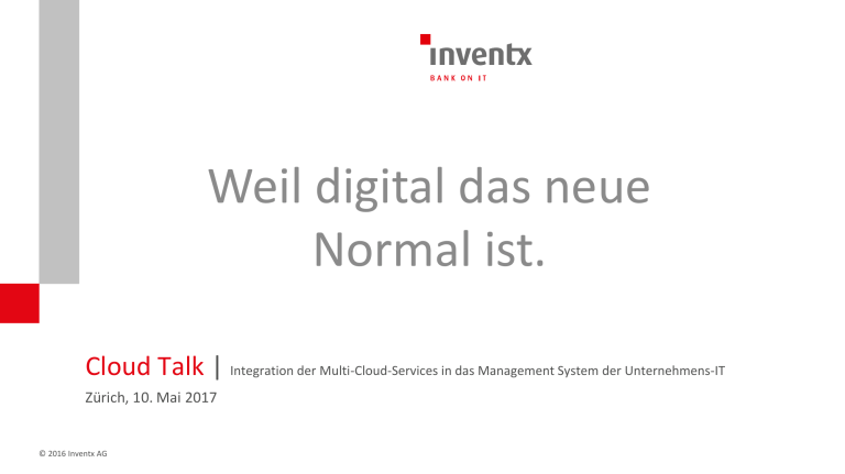 Weil digital das neue Normal ist. Cloud Talk | Integration der Multi-Cloud-Services in das Management System der Unternehmens-IT Zürich, 10. Mai 2017 © 2016 Inventx AG | Innovation für Schweizer Finanzdienstleister Mit Zuversicht in die Cloud dank unserer sicheren, skalierbaren, Enterprise-Infrastruktur sowie einer Auswahl an qualitativ hochwertigen und automatisierten Managed Services für Ihre kritischen Workloads und Applikationsbedürfnisse. Hochverfügbarkeitsund Continuity Services inklusive Disaster Recovery aus dem entfernten Data Center Chur · Brüttisellen Managed “plus” Services inklusive OS SystemAdministration integriert in allen VMs Quality Onboarding mittels Assess, Design, Integrate Methodik & API’s für Integration in best. Infra. Echte Swissness und geprüfte Sicherstellung der CompliancyAnforderungen von Banken und Versicherungen IaaS und Plattform Services für SAP, SQL and Oracle Workloads Hybrider CloudAnsatz mit wählbaren Optionen für OnPremise, Cloud Engage, Cloud Ready und Public Cloud Talk, 10. Mai 2017 | Ganzheitlicher Ansatz unserer Cloud Strategie Internet Internet B-DDoS Protection Internet Dezizierte Cloud Engage Zone (CH) Internet B-DDoS Protection B-DDoS Protection On Premise oder bestehende Data Center bei Sourcing Partnern Office 365 / SaaS Customers / Partners Mobile Workers Cloud Ready Zone (CH) Microsoft Protection Public Cloud Zone (Azure) DarkFiber Encrypted Azure Sicherheitselemente > < Cloud Sicherheitselemente z.B. 5nine Cloud Security (DMZ-Micro-Segmentation etc.) sowie Self-Service Portal Cloud Sicherheitselemente + 5nine Cloud Security Infrastruktursicherheit … 3rd Party Cloud Security Services WAF / Proxy Service, CDN etc. Vulnerability Scaning … OnPrem Network Chur · Brüttisellen VLAN Network SDN Network SDN Network Cloud Talk, 10. Mai 2017 | Erfolgsfaktoren Wahl eines Partners welcher die Kompetenzen für einen sicheren und stabilen Betrieb für Schweizer Finanzdienstleister sicherstellen kann Effiziente und effektive Governance zwischen allen beteiligten Partnern Zukunftsgerichtete IT-Plattform, sprich nahtlos integrierbar in OnPrem und Unternehmensübergreifende Prozess- und Toollandschaften, rasches Deploymenet von neuen Services etc. Rasche Bereitstellung der neuen IT-Plattform Faires Preis-/Leistungsverhältnis (Pay as you use) Chur · Brüttisellen Cloud Talk, 10. Mai 2017 | High-Level Service Katalog Subscriptions & Pläne Billing & Reporting Admin Portal Deploy & Use Configure Operational Services PaaS+ PaaS Operations SaaS Development Integrate Design Assess Quality Onboarding Tenant Portal IaaS+ IaaS Chur · Brüttisellen Cloud Talk, 10. Mai 2017 | Umfassendes Service-Angebot Services Service Quality Rack-Services Service Levels Service Management Run-Services+ Platinum Infrastructure-as-a-Service Gold Virtual Machines Silver Operating Systems Storage Platform-as-a-Service Quality Onboarding Backup ITIL-based Processes Desaster Recovery SLA/Consumption Reports Security & Compliance Custom Governance SQL Services SharePoint Services Weblogic Services Website Services Chur · Brüttisellen Cloud Talk, 10. Mai 2017 3rd Level 2nd Level 1st Level | Betriebsmodell Chur · Brüttisellen Leistungserbringer Leistungserbringer Workplace Service Application Operation Services Leistungserbringer Data Center Services Cloud Talk, 10. Mai 2017 | In der Übersicht Systems Monitoring / DB- und Middleware Monitoring / Application Monitoring ApplikationsInstanz DB-, MiddlewareInstanz OS Instanz / Server Virtual Machine Cloud Infrastruktur Chur · Brüttisellen Applikations-Monitoring (SaaS): out of Scope - Überwachung der Applikations-Prozesse und Log-Files - Auswertungen Log-File Inhalte, etc. Forward an OMS, PaaS Monitoring Middleware-Monitoring, Database-Monitoring (PaaS): - Überwachung der DB-/Middleware Prozesse - Überwachung der Database spez. Werte (z.B. Oracle mit Cloud Control - Überwachung von Queues / Werte aus Verarbeitungen - etc. Systems Monitoring (IaaS) - System-Prozess-, Disk-, Netzwerk-Fehler-Überwachung (Log-Files) - vCPU Utilization - vMemory Utilization - Filesystem oder vDisk Utilization - vNetwork Utilization - etc. Platform Monitoring: - Kapazitätsmanagement CPU/Cores pro Hyper-V Host - Kapazitätsmanagement Memory pro Hyper-V Host - Kapazitätsmanagement Storage pro Hyper-V Host - Kapazitätsmanagement Netzwerk pro Hyper-V Host - Überwachung von SAN/Netapp/Object Storage Systemen - Überwachung von Service Request (Bestellprozessen) - Überwachung von WAP Komponenten, VMM DB, Consumption DB, etc. Event Correlation: - Erkennen von Abhängigkeiten - Korrelation der einzelnen Events - Serielle und parallele Abhängigkeiten Analyse / Behebung : - Event Management - Incident Management - Incident Escalation Management - Informationen an den Kunden Cloud Talk, 10. Mai 2017 | Anforderungen Kunden Die Anforderungen der Kunden sind aus der Sicht der verschiedenen Anspruchsgruppen wie Controlling, Entwicklung und Service Management gemäss nebenstehender Abbildung zusammengefasst. § Dabei wird nach inhaltlichen Anforderungen und der Art des Zugriffs (API, WAP) unterschieden. Chur · Brüttisellen Cloud Talk, 10. Mai 2017 | Client Delivery Manager Das Client Delivery stellt sicher, dass verbindliche Rahmenbedingungen für die operativen Prozesse bestehen. Es regelt die planerischen, vertraglichen und finanziellen Themen. SPOC Service Erbringung Chur · Brüttisellen Service Level Management Financial Management für IT Services Service Board / Change Advisory Board IT Service Continuity Management Account Team mit Business Manager Cloud Talk, 10. Mai 2017 Business Value | Warum ix.cloud? ISO 27001 ISAE 3402 Type 2 Chur · Brüttisellen Cloud Talk, 10. Mai 2017 Inventx AG | Ansprechpartner Besten Dank für Ihr Interesse. Bei Fragen stehen wir Ihnen jederzeit gerne zur Verfügung. Roman Flütsch Leiter Operations [email protected] +41 81 287 18 42 Inventx AG · Bank on IT Grabenstrasse 19 · CH-7000 Chur · T +