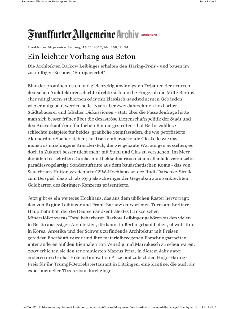 Speichern: Ein leichter Vorhang aus Beton Seite 1 von 4 speichern Frankfurter Allgemeine Zeitung, 16.11.2012, Nr. 268, S. 34 Ein leichter Vorhang aus Beton Die Architekten Barkow Leibinger erhalten den Häring-Preis - und bauen im zukünftigen Berliner "Europaviertel". Eine der prominentesten und gleichzeitig unsinnigsten Debatten der neueren deutschen Architekturgeschichte drehte sich um die Frage, ob die Mitte Berlins eher mit gläsern-stählernen oder mit klassisch-sandsteinernen Gebäuden wieder aufgebaut werden solle. Nach über zwei Jahrzehnten hektischer Städtebauerei und falscher Diskussionen - statt über die Fassadenfrage hätte man sich besser früher über die desaströse Liegenschaftspolitik der Stadt und den Ausverkauf der öffentlichen Räume gestritten - hat Berlin zahllose schlechte Beispiele für beides: gräuliche Steinfassaden, die wie petrifizierte Aktenordner Spalier stehen; hektisch einherzackende Glaskeile wie das monströs misslungene Kranzler-Eck, die wie gebaute Warnungen aussehen, es doch in Zukunft besser nicht mehr mit Stahl und Glas zu versuchen. Im Meer der öden bis schrillen Durchschnittlichkeiten rissen einen allenfalls vereinzelte, paradiesvogelartige Sonderauftritte aus dem bauästhetischen Koma - das von Sauerbruch Hutton gezeichnete GSW-Hochhaus an der Rudi-Dutschke-Straße zum Beispiel, das sich ab 1999 als schwingender Gegenbau zum senkrechten Goldbarren des Springer-Konzerns präsentierte. Jetzt gibt es ein weiteres Hochhaus, das aus dem üblichen Raster hervorragt: den von Regine Leibinger und Frank Barkow entworfenen Turm am Berliner Hauptbahnhof, der die Deutschlandzentrale des französischen Mineralölkonzerns Total beherbergt. Barkow Leibinger gehören zu den vielen in Berlin ansässigen Architekten, die kaum in Berlin gebaut haben, obwohl ihre in Korea, Amerika und der Schweiz zu findende Architektur mit Preisen geradezu überhäuft wurde und ihre materialbezogenen Forschungsarbeiten unter anderen auf den Biennalen von Venedig und Marrakesch zu sehen waren. 2007 erhielten sie den renommierten Marcus Prize, in diesem Jahr unter anderen den Global Holcim Innovation Prize und zuletzt den Hugo-HäringPreis für ihr Trumpf-Betriebsrestaurant in Ditzingen, eine Kantine, die auch als experimenteller Theaterbau durchginge. file://W:\25 - Bildersammlung, Internet-Gestaltung, Patentrechte\Entwicklung neuer Werbeauftritt\Rossmeissl\Homepage\Unterlagen fü... 15.01.2013 Speichern: Ein leichter Vorhang aus Beton Seite 2 von 4 Wo in anderen Betriebsrestaurants funzeliges Neonlicht aufs verkochte Essen fällt, herrscht hier eine andere Stimmung. Das Dach des Kantinenbaus ruht auf feinen, durch den Raum tänzelnden Stahlträgern, ins stählerne Trägerwerk des Dachs ist eine zweite Konstruktion aus fünfeckigen Holzwaben eingelassen. So fällt viel Tageslicht neben dem Kunstlicht in die Kantine, man sieht hinter den Waben die Wolken ziehen, das Lichtspiel verändert die Wirkung des Baus von Minute zu Minute, nachts leuchtet Kunstlicht durch die dünnen Ständer wie durch einen abstrahierten Pinienwald; die Kantine, eingebettet in einen grünen Trichter, und zum Himmel geöffnet, wird selbst zur offenen Landschaft und zu einem Gemeinschaftsraum, der die Lebensqualität in einem Bereich verbessert, den viele Architekten bereits ästhetisch und formal aufgegeben hatten. Die formale Herangehensweise, die Auflösung starrer Fassaden durch eine Verräumlichung der Oberflächen, die in Ditzingen ausgezeichnet wurde, kann man auch an der "Tour Total" beobachten. Wie es der städtebauliche Masterplan verlangte, richtet das Gebäude seine Stirn frontal auf einen künftigen öffentlichen Platz an der Heidestraße. Der Sockel aber dreht sich und folgt dem Verlauf der Minna-Cauer-Straße; dadurch entsteht eine Spannung, die das Volumen des Baus prägt. Die Längsseiten falten sich, der Turm scheint wie ein Transformer unter dem Einfluss ungeheurer Dynamiken zu stehen. Schon diese Spannung unterscheidet den Turm von den üblichen Berliner Zweckbauten, die in der Regel wie schlaff grasende Quadratkühe nebeneinanderhocken. Das augenfälligste Detail des 68 Meter hohen Turms, der der erste Bau eines geplanten, vierzig Hektar großen Stadtquartiers am Hauptbahnhofs ist, sind aber seine vorfabrizierten. blendenartigen Fassadenelemente. An der Fassade sind modulare Betonfertigteile in Form eines schlanken K mit variablem Knickpunkt angebracht, die über zwei Geschosse ragen. Diese Module tauchen, verkleinert und als Kacheln, in der Lobby wie eine thematische Ouvertüre als Wandrelief wieder auf. Der Fassadeneffekt ist erstaunlich: Es wirkt mit jeder Veränderung des Standpunkts, mit jedem Wechsel des Lichts, als bewege sich die Fassade über einem pulsierenden Kern, der Beton gerät in Bewegung, als handle es sich um eine Vorhangfassade im Wortsinn - oft wirkt es, als bewege sie sich im Wind wie eine textile Hülle. Der Turm hat etwas Chamäleoneskes, Trompe-l'oeilhaftes. Nicht einmal über seine Materialität lässt er einen im Klaren: Nachts, im LED-Licht, wirkt seine Außenhaut wie gigantisch vergrößertes Streckmetall, im Abendlicht sieht der Beton plötzlich auch einmal wie Stein aus. Vertreter beider formaler Lager in Berlin sah man verwirrt aus der S-Bahn schauen: der file://W:\25 - Bildersammlung, Internet-Gestaltung, Patentrechte\Entwicklung neuer Werbeauftritt\Rossmeissl\Homepage\Unterlagen fü... 15.01.2013 Speichern: Ein leichter Vorhang aus Beton Seite 3 von 4 Turm entzog sich ihren Bewertungsrastern. Allein schon damit kann man ihn auch als Kommentar auf die bauästhetische Situation Berlins und als ästhetische Programmatik lesen - er greift die neue Berliner Ästhetik, etwa das Fassadenöffnungsverhältnis 60:40 und die Kubaturen auf und wendet sie in etwas Neues. Eine derart kluges Spiel mit den örtlichen Bauvorschriften ist selten. Formal anders, aber strukturell ähnlich ist es unter anderen Frank Gehry gelungen, nicht in wütender Umgehung der bauästh