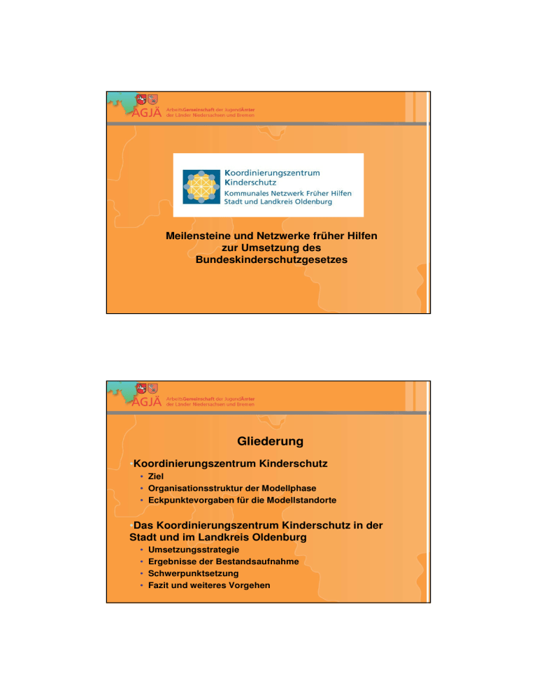 Meilensteine und Netzwerke früher Hilfen zur Umsetzung des Bundeskinderschutzgesetzes Gliederung •Koordinierungszentrum Kinderschutz • Ziel • Organisationsstruktur der Modellphase • Eckpunktevorgaben für die Modellstandorte •Das Koordinierungszentrum Kinderschutz in der Stadt und im Landkreis Oldenburg • • • • Umsetzungsstrategie Ergebnisse der Bestandsaufnahme Schwerpunktsetzung Fazit und weiteres Vorgehen ein verbindliches Netzwerk mit unterschiedlichen Professionen gute Kooperationen im und über den Einzelfall hinaus unter Einbeziehung bestehender Netzwerke zum Kinderschutz strukturierte und berechenbare Kooperation der unterschiedlichen Akteure untereinander den Abschluss von Handlungsvereinbarungen und Reaktionsketten Organisationsstruktur der Modellphase 2007 bis 2011 Verstetigung seit 2012 Eckpunktevorgaben des Sozialministeriums •Projektleitungsstelle • Anbindung an den Träger der öffentlichen Jugendhilfe •Bestandserhebung und Bestandsanalyse •Beratung • durch externes Institut/Hochschule •Beirat •regelmäßiger Austausch der Netzwerkstandorte • jährlicher Fachtag der Modellstandorte Profile der Standorte • Braunschweig • • • Konzeption systemübergreifender Netzwerke Alter bis 10 Jahre Einbindung früher Hilfen und Grundschulen • Hannover • • • Hauptträger: zwei Jugendämter und weitere 5 Jugendämter, die beteiligt sind Hauptkooperationspartner: Kinderklinik Aufbau des Netzwerkes • Lüneburg • • • Hilfen für junge Mütter Zugang zu/ Gesprächsführung mit „schwierigen Eltern“ Aufbau und Pflege von Netzwerken auch ohne schriftliche Vereinbarungen • Oldenburg • • • • Ausbau früher Hilfen Kooperation Jugendhilfe und Gesundheitshilfe Stadt und Landkreis Oldenburg Netzwerkpflege und Treffen verbindlicher Absprachen Umsetzungsstrategie •Nutzung des Oldenburger Systems frühe Hilfen •Einbindung des Landkreises Oldenburg •Besetzung der Projektstelle mit einer Mitarbeiterin des Allgemeinen Sozialdienstes •Gründung eines Beirates (Gesundheitshilfe, Jugendhilfe, Justiz, Polizei, Schule, wissenschaftliche Begleitung) •Durchführung einer Bestandsanalyse •Einbindung der Kooperationspartner •Festlegung von Schwerpunktsetzungen im Modellzeitraum •Rückkoppelung der Ergebnisse Beteiligte am Netzwerk in Oldenburg etc. Bestandanalyse und Bestandserhebung der damaligen FH OOW •Untersuchung der Institutionen und Einrichtungen, die im Rahmen des Kinderschutzes für Kinder von 0 – 6 Jahren tätig sind sowie die Institutionen, in denen Kindeswohlgefährdungen deutlich werden. •Erhoben und analysiert werden sollten: • • • • Verfahrensweisen zur Wahrnehmung des Kinderschutzes Vernetzungs- und Kooperationsstrukturen verwendete Fachverfahren interne Verfahrensabläufe •Einsatz qualitativer Methoden der Sozialforschung (narrative Interviews, leitfadengestützte Interviews, etc.) Wesentliche Ergebnisse der Bestandanalyse • Einrichtungen der Jugendhilfe • • • Bedarf an klaren und einheitlichen Strukturen und Verfahren zur Diagnostik, Dokumentation und Erfassung Fortbildung und Supervision Wunsch nach stadtteilbezogener Netzwerkarbeit unter Federführung des Jugendamtes • Geburtskliniken • • • Wunsch nach verbindlichen Handlungsvorgaben bei Verdacht auf Kindeswohlgefährdung Bisher überwiegende mündliche Weitergabe von Informationen Weiterleitung an andere Stellen ohne Verbindlichkeit und Kontrolle • Allgemeiner Sozialdienst • • • Weiterentwicklung der Diagnostik und der EDV Unterstützung Ausbau der Fortbildung und Supervision Durchführung einer Organisationsuntersuchung • Niedergelassene Ärzte und Hebammen • • • Unkenntnis über Schweigepflicht im Rahmen einer Kindeswohlgefährdung Wunsch nach Beratung und anonymer Fachberatung Sprache der Jugendhilfe und der Medizin transferieren Schwerpunktsetzung durch den Beirat •Verbesserung des Kenntnisstandes zur Arbeit des Jugendamtes •Intensivere Verbindung zwischen der Jugendhilfe und der Gesundheitshilfe herstellen •Aufbau von verbindlichen Netzwerkstrukturen •Aufbau und Verwendung von standardisierten Verfahren •Ausbau der Frühen Hilfen und Familienhebammen •Entwicklung von Material für Eltern, Fachkräfte und andere Netzwerkbeteiligte Schwerpunktsetzung erfolgte wegen Brückenbauerfunktion Angebote der Frühe Hilfen Präventionskette: Schwangerschaft und Entbindung Begleitung durch Oldenburg System Frühe Hilfen (OSFH) Einleger in Mutterpass geplant Familienhebammen vor der Geburt Schwangerenberatung Gemeinsame Informationen mit einem Flyer Multiprofessionelle Unterstützung von psychisch belasteten Frauen Geburt und Wochenbett • Sozialapgar •Multiplikatoren in den Geburtskliniken •Konzeptionelle Arbeit mit „Drogenmüttern“ Einleger in Vorsorgeheft geplant Präventionskette: Säuglingsalter und Kleinkindalter Hausbesuch 8.- 12. Frühförderung Woche (Familienhebammen) im Netzwerk „Guter Start ins Leben“ Einbeziehung der Tagespflegepersonen ins Netzwerk Informationsflyer „Rund ums Baby“ Kinderklinik •Multiplikatoren zu Kinderschutzfragen •Kinderschutzgruppe •AG chronisch kranke Kinder Informationsbroschüre „Junge Familien in Oldenburg“ Begleitung durch Familienhebammen und Kinderkrankenschwestern im ersten Lebensjahr Niedrigschwellige Angebote für Familien (Frühe Hilfen) Abschluss einer Kooperationsvereinbarung mit dem Klinikum (Schwerpunkt Kinderklinik) •Gründung einer internen AG Kinderschutz •Gründung einer externen AG Kinderschutz in der Klinik (unter Beteiligung der Polizei, SPZ, Jugendamt und Gesundheitsamt 4x im Jahr) •Fallbesprechungen der AG Kinderschutz in der Kinderklinik •Treffen mit dem GA, dem Jugendamt und der Klinik 1x im Jahr •Entwicklung einer Leitlinie zum Vorgehen bei Kindesmisshandlung in der Kinderklinik Oldenburg Eingeleitete Maßnahmen mit der Gynäkologie •Gründung einer AG Kinderschutz (Hebammen, Gynäkologen, Psychiatrie, Kinder