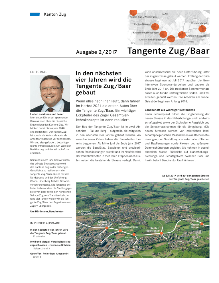 BAAR Knoten Süd-/Weststrasse Knoten Margel Knoten Neufeld Knoten Industriestrasse Knoten Rigistrasse Knoten Inwilerriedstrasse ZUG Ausgabe 2/2017 E D I TO R I A L Liebe Leserinnen und Leser Momentan führen wir spannende Diskussionen über die räumliche Entwicklung des Kantons Zug. Wir blicken dabei bis ins Jahr 2040 und stellen fest: Der Kanton Zug ist sowohl als Wohn- als auch als Arbeitsort nach wie vor sehr beliebt. Wir sind also gefordert, bedarfsgerechte Infrastrukturen zum Wohl der Bevölkerung und der Wirtschaft zu erstellen. Seit rund einem Jahr sind wir daran, das grösste Strassenbauprojekt des Kantons Zug in der bisherigen Geschichte zu realisieren – die Tangente Zug/Baar. Sie ist mit der Nordstrasse und der Umfahrung Cham-Hünenberg Teil des Gesamtverkehrskonzepts. Die Tangente entlastet insbesondere die Siedlungsgebiete von Baar sowie den nördlichen Teil von Zug vom Transitverkehr. In rund vier Jahren wollen wir die Tangente Zug/Baar den Zugerinnen und Zugern übergeben. Urs Hürlimann, Baudirektor IN DIESER AUSGABE In den nächsten vier Jahren wird die Tangente Zug/Baar gebaut. Frontseite Inwil und Margel: Vorarbeiten sind abgeschlossen – zwei neue Brücken. Seiten 2 und 3 Getroffen: Polier Beni Alessandri Seite 4 INWIL Tangente Zug/Baar In den nächsten vier Jahren wird die Tangente Zug/Baar gebaut Wenn alles nach Plan läuft, dann fahren im Herbst 2021 die ersten Autos über die Tangente Zug/Baar. Ein wichtiger Eckpfeiler des Zuger Gesamtverkehrskonzepts ist dann realisiert. Der Bau der Tangente Zug/Baar ist in zwei Abschnitte – Tal und Berg – aufgeteilt, die zeitgleich in den nächsten vier Jahren gebaut werden. An verschiedenen Orten haben die Bauarbeiten bereits begonnen. Ab Mitte Juni bis Ende Jahr 2017 werden die Bauplätze, Baupisten und provisorischen Erschliessungen erstellt und im Neufeld wird der Verkehrsknoten in mehreren Etappen nach Osten neben die bestehende Strasse verlegt. Damit kann anschliessend die neue Unterführung unter der Zugerstrasse gebaut werden. Entlang der Südstrasse beginnen ab Juli 2017 tagsüber die lärm­ intensiven Spundwandarbeiten und dauern bis Ende Jahr 2017 an. Die trockenen Sommermonate sollen auch für die umfangreichen Boden- und Erd­ arbeiten genutzt werden. Die Arbeiten am Tunnel Geissbüel beginnen Anfang 2018. Landschaft als wichtiger Bestandteil Einen Schwerpunkt bilden die Eingliederung der neuen Strasse in das Naherholungs- und Landwirtschaftsgebiet sowie der ökologische Ausgleich und die Schutzmassnahmen für die Umgebung. «Die neuen Strassen werden von zahlreichen landschaftspflegerischen Massnahmen wie Bachrenaturierungen, der Gestaltung von naturnahen Flächen und Bepflanzungen sowie kleinen und grösseren Dammschüttungen begleitet. Sie nehmen in ausreichendem Masse Rücksicht auf Naherholungs-, Siedlungs- und Schutzgebiete zwischen Baar und Inwil», betont Baudirektor Urs Hürlimann. Ab Juli 2017 wird auf der ganzen Strecke der Tangente Zug/Baar gearbeitet. Knoten Süd-/Weststrasse Knoten Neufeld Knoten Industriestrasse Knoten Inwilerriedstrasse Knoten Rigistrasse Knoten Margel Tangente Zug/Baar Ausgabe 2 S. 2 Vorarbeiten sind abgeschlossen – zwei neue Brücken im Margel und in Inwil Die Vorarbeiten für den Bau der Tangente Zug/ Baar, dem grössten Zuger Strassenbauprojekt der Geschichte, sind im Margel und in Inwil bald abgeschlossen. Jetzt kann mit dem eigentlichen Bau der Tangente begonnen werden. Im Margel wird das Bachtobel ausgebaut und der Margelbach renaturiert. Margel: Der Verkehr rollt über die neue Brücke Die Bauarbeiten im Margel waren anspruchsvoll, konnten aber ohne Verzögerungen ausgeführt wer- den. Zuerst wurde im letzten Jahr die Böschung abgetragen und die Strasse zum Berg hin verschoben. Danach begann man mit dem Bau der neuen Brücke. Die Arbeiten verliefen nach Zeitplan. Selbst der Schneefall im Januar – die Arbeiten ruhten während einer Woche – wirkte sich nicht negativ auf den zeitlichen Ablauf aus. Seit Mitte Mai 2017 rollt der Verkehr über die neue Brücke. Jetzt wird das Bachtobel ausgebaut und der Margelbach renaturiert. Der Fussweg zur Oberalmig wird ab Herbst 2017 neu unter der Brücke durchgeführt. Inwil: Neue Stahlbrücke Im Herbst 2016 wurde in Inwil die Fussgängerunterführung abgebrochen und der Baustellenplatz eingerichtet. Dazu musste die Strasse mehrmals verlegt werden. In der Zwischenzeit ist die neue Fussgängerüberführung soweit erstellt, dass die Stahlbrücke montiert werden kann. Im Oktober 2017 können Fussgänger und Velofahrer über die neue Brücke fahren – unabhängig von den Strassenbauarbeiten. Damit vermeidet man Konflikte mit dem Baustellenverkehr der Tangente Zug/ Baar, und die Schülerinnen und Schüler können die Strasse sicher queren. Die Bagger sind im Margel weiter im Einsatz. Das Projekt Die Tangente Zug/Baar wird vom Knoten Süd-/ Weststrasse, direkt beim Autobahnanschluss Baar, auf der bestehenden Südstrasse zum Knoten Zugerstrasse verlaufen. Dort beginnt die eigentliche Neubaustrecke. Sie führt über die Knoten Industriestrasse und Inwilerriedstrasse zum Knoten Rigistrasse. Die folgende Steigung überwindet die Tangente über den 370 Meter langen Tunnel Geissbüel. Dieses Bauwerk dient auch als Sicht- und Lärmschutz. Im Gebiet Margel schliesst die Tangente an die Ägeristrasse an. Die Neubaustrecke wird als zweispurige Kantonsstrasse ausgestaltet – die bestehende Südstrasse zwischen dem Autobahnanschluss Baar und dem Knoten Zugerstrasse wird auf drei Spuren ausgebaut. Die Strasse ist drei Kilometer lang. Phasenplan Stand Juni 2017 ng r mu mbe m i s t ve Ab . No 29 2009 , en ng u l d an ben il e r h e r ga nw V , ,V nI u i n e lba en en l c h e k te ne eit erg eit arge a n r b j b r u r B M sp ro ra ua nT Ein tailp Vo d im Ba l und gin Be De un Ta 2015 2016 2017 Aktuell 2018 ff E rö 2019 2020 nu 2021 ng S. 3 Ausgabe 2 Tangente Zug/Baar In Inwil wird jetzt die neue Stahlbrücke für Fussgänger und Velofahrer montie