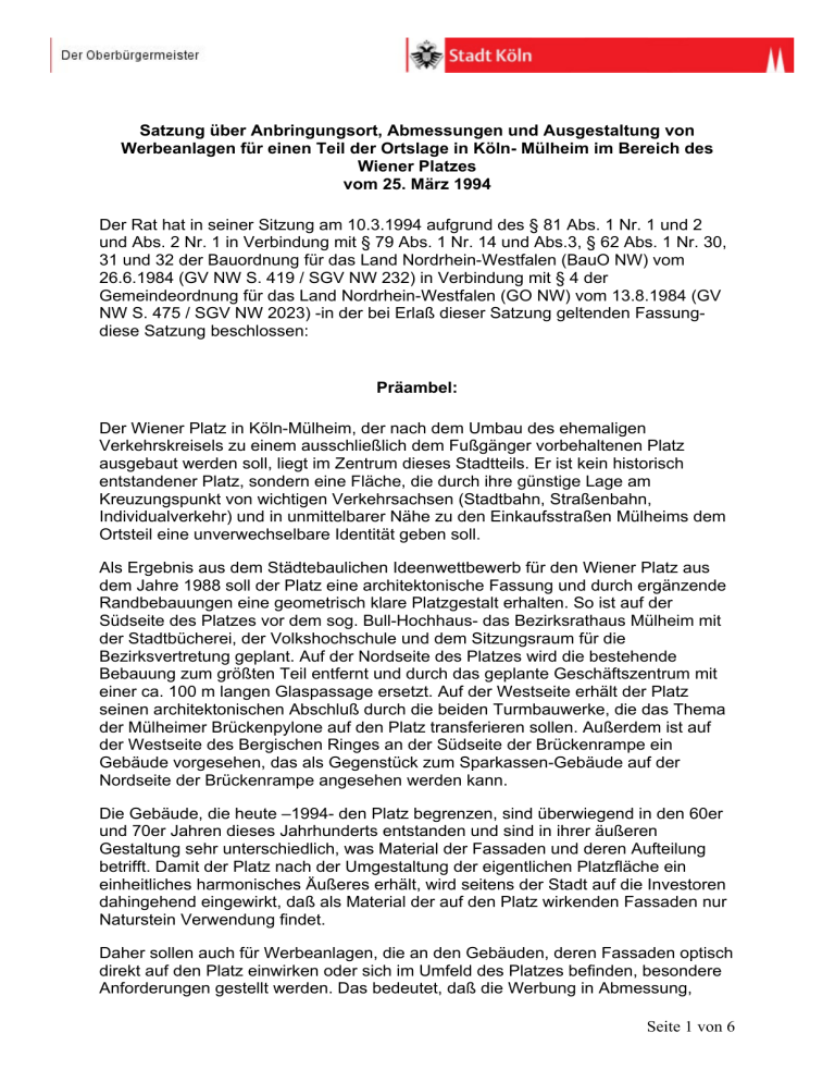 Satzung über Anbringungsort, Abmessungen und Ausgestaltung von Werbeanlagen für einen Teil der Ortslage in Köln- Mülheim im Bereich des Wiener Platzes vom 25. März 1994 Der Rat hat in seiner Sitzung am 10.3.1994 aufgrund des § 81 Abs. 1 Nr. 1 und 2 und Abs. 2 Nr. 1 in Verbindung mit § 79 Abs. 1 Nr. 14 und Abs.3, § 62 Abs. 1 Nr. 30, 31 und 32 der Bauordnung für das Land Nordrhein-Westfalen (BauO NW) vom 26.6.1984 (GV NW S. 419 / SGV NW 232) in Verbindung mit § 4 der Gemeindeordnung für das Land Nordrhein-Westfalen (GO NW) vom 13.8.1984 (GV NW S. 475 / SGV NW 2023) -in der bei Erlaß dieser Satzung geltenden Fassungdiese Satzung beschlossen: Präambel: Der Wiener Platz in Köln-Mülheim, der nach dem Umbau des ehemaligen Verkehrskreisels zu einem ausschließlich dem Fußgänger vorbehaltenen Platz ausgebaut werden soll, liegt im Zentrum dieses Stadtteils. Er ist kein historisch entstandener Platz, sondern eine Fläche, die durch ihre günstige Lage am Kreuzungspunkt von wichtigen Verkehrsachsen (Stadtbahn, Straßenbahn, Individualverkehr) und in unmittelbarer Nähe zu den Einkaufsstraßen Mülheims dem Ortsteil eine unverwechselbare Identität geben soll. Als Ergebnis aus dem Städtebaulichen Ideenwettbewerb für den Wiener Platz aus dem Jahre 1988 soll der Platz eine architektonische Fassung und durch ergänzende Randbebauungen eine geometrisch klare Platzgestalt erhalten. So ist auf der Südseite des Platzes vor dem sog. Bull-Hochhaus- das Bezirksrathaus Mülheim mit der Stadtbücherei, der Volkshochschule und dem Sitzungsraum für die Bezirksvertretung geplant. Auf der Nordseite des Platzes wird die bestehende Bebauung zum größten Teil entfernt und durch das geplante Geschäftszentrum mit einer ca. 100 m langen Glaspassage ersetzt. Auf der Westseite erhält der Platz seinen architektonischen Abschluß durch die beiden Turmbauwerke, die das Thema der Mülheimer Brückenpylone auf den Platz transferieren sollen. Außerdem ist auf der Westseite des Bergischen Ringes an der Südseite der Brückenrampe ein Gebäude vorgesehen, das als Gegenstück zum Sparkassen-Gebäude auf der Nordseite der Brückenrampe angesehen werden kann. Die Gebäude, die heute –1994- den Platz begrenzen, sind überwiegend in den 60er und 70er Jahren dieses Jahrhunderts entstanden und sind in ihrer äußeren Gestaltung sehr unterschiedlich, was Material der Fassaden und deren Aufteilung betrifft. Damit der Platz nach der Umgestaltung der eigentlichen Platzfläche ein einheitliches harmonisches Äußeres erhält, wird seitens der Stadt auf die Investoren dahingehend eingewirkt, daß als Material der auf den Platz wirkenden Fassaden nur Naturstein Verwendung findet. Daher sollen auch für Werbeanlagen, die an den Gebäuden, deren Fassaden optisch direkt auf den Platz einwirken oder sich im Umfeld des Platzes befinden, besondere Anforderungen gestellt werden. Das bedeutet, daß die Werbung in Abmessung, Seite 1 von 6 Ausgestaltung und Anbringungsort auf die besondere Situation am Gebäude und auch im Straßen- oder Platzraum Rücksicht nehmen muß, so daß eine Beeinträchtigung bzw. Verunstaltung des Gebietes, der Straßen und ihrer Gebäude durch zu große, zu schrille und falsch plazierte Werbeanlagen sowie eine zu große Häufung dieser Anlagen verhindert wird. Daher wurde bei der Abwägung der öffentlichen und privaten Belange dem öffentlichen Interesse an der Schutzwürdigkeit dieses Stadtgebietes vor den uneingeschränkten Interessen der Geschäftswelt und der Werbewirtschaft der Vorrang eingeräumt. Die Geschäftsleute profitieren ihrerseits von der Attraktivität der Straßen und des Platzes, so daß ihnen gewisse Einschränkungen bei den Werbeanlagen zugemutet werden können. Den Belangen der Werbewirtschaft wird dadurch Rechnung getragen, daß bestimmte Werbeanlagen nur an dafür ausgewiesenen Standorten, die sowohl den stadtgestalterischen als auch den wirtschaftlichen Gesichtspunkten genügen, zulässig sind. Eine zu große Häufung dieser Werbeanlagen ist somit ausgeschlossen. Grundsätzlich kann zu der Größe von Werbeanlagen gesagt werden, daß Werbeanlagen an Gebäudefassaden eine gewisse Abmessung nicht überschreiten sollten, die kleiner ist als die Größe von Werbeanlagen im öffentlichen Straßenland und sich an den Gebäudeproportionen orientieren muß. Würden an Fassaden die gleichen Größen von Werbeanlagen zugelassen wie im öffentlichen Straßenland, so würde die Architektur verunklart und die Proportion der Gebäude wäre nicht mehr ablesbar. Gebäudefassaden sind durch Architekturelemente, wie Wandflächen, Stützen, Erker, Balkone, vor allem aber durch Türen, Fenster und Brüstungen, stark gegliedert. Für den Passanten sind diese Elemente vor allem die letztgenannten-unverzichtbarer Bestandteil der Orientierung in der gebauten Umwelt. Durch sie nimmt er den Maßstab des Gebäudes, die Geschoßhöhen, die Geschoßzahl und bis zu einem gewissen Grad auch die Funktion und den Inhalt der Gebäude wahr. Dies gilt auch für ungegliederte und scheinbar leere Fassadenteile, die im Zusammenhang mit der Gesamtfassade einen wesentlichen Teil der architektonischen Aussage des Gebäudes ausmachen. Deshalb sollen Reklamen an Gebäudefassaden nur eine Dimension und Ausgestaltung haben, die die Dominanz dieser Architekturelemente nicht beeinträchtigt. Aus diesen Gründen können Reklamen, die in den wesentlich ungegliederten Straßenflächen stehen, meist größere Dimensionen haben. Von daher können an Reklameflächen im Straßenland und an Gebäuden verschiedene Maßstäbe gelegt werden. Aus Gründen der Erkennbarkeit der o.g. Maßstäblichkeit der Gebäude, vor allem der Ablesbarkeit von Geschoßhöhen und Fenstergrößen, wird eine Einzelreklamefläche an Gebäuden von max. 1 m² als noch vertretbar angesehen. Wie im beiliegenden Plan M. 1:2000 dargestellt, umfaßt der räumliche Geltungsbereich eine Fläche, die nicht nur den Wiener Platz betrifft, sondern auch die angrenzenden