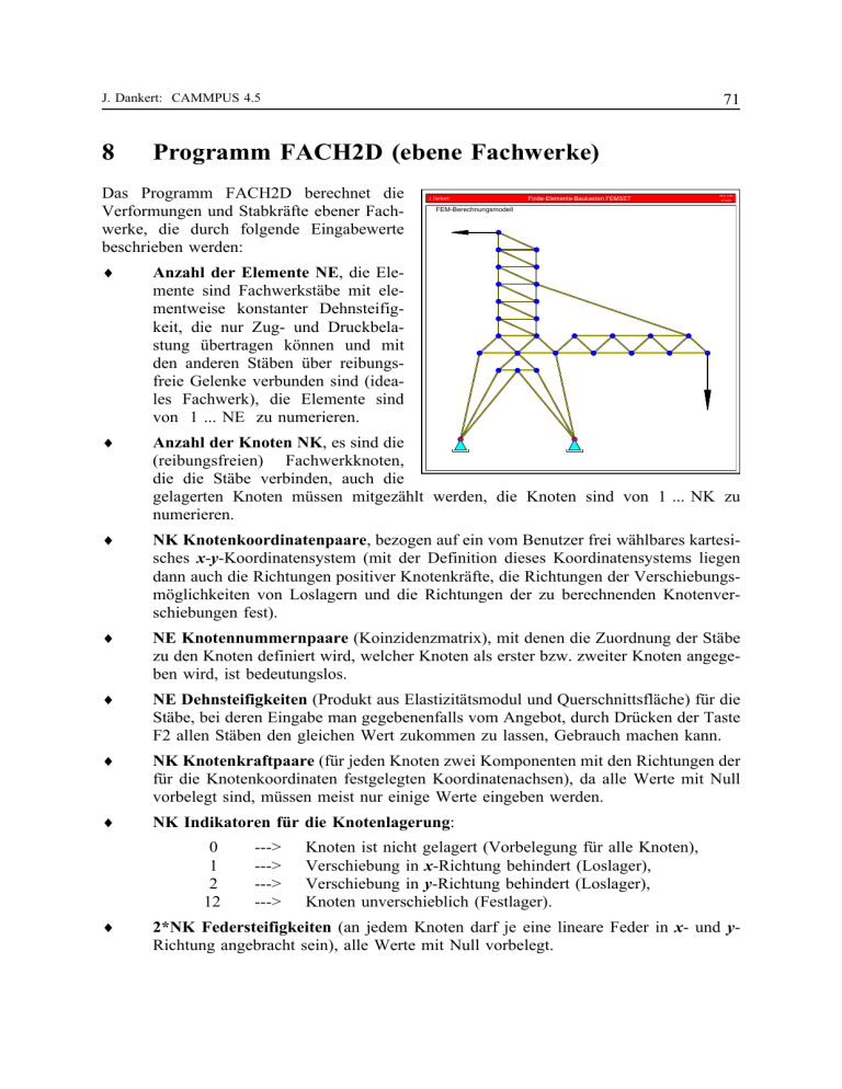 J. Dankert: CAMMPUS 4.5 8 71 Programm FACH2D (ebene Fachwerke) Das Programm FACH2D berechnet die Verformungen und Stabkräfte ebener Fachwerke, die durch folgende Eingabewerte beschrieben werden: J. Dankert Finite-Elemente-Baukasten FEMSET 09.07.1995 STAB2D FEM-Berechnungsmodell ♦ Anzahl der Elemente NE, die Elemente sind Fachwerkstäbe mit elementweise konstanter Dehnsteifigkeit, die nur Zug- und Druckbelastung übertragen können und mit den anderen Stäben über reibungsfreie Gelenke verbunden sind (ideales Fachwerk), die Elemente sind von 1 ... NE zu numerieren. ♦ Anzahl der Knoten NK, es sind die (reibungsfreien) Fachwerkknoten, die die Stäbe verbinden, auch die gelagerten Knoten müssen mitgezählt werden, die Knoten sind von 1 ... NK zu numerieren. ♦ NK Knotenkoordinatenpaare, bezogen auf ein vom Benutzer frei wählbares kartesisches x-y-Koordinatensystem (mit der Definition dieses Koordinatensystems liegen dann auch die Richtungen positiver Knotenkräfte, die Richtungen der Verschiebungsmöglichkeiten von Loslagern und die Richtungen der zu berechnenden Knotenverschiebungen fest). ♦ NE Knotennummernpaare (Koinzidenzmatrix), mit denen die Zuordnung der Stäbe zu den Knoten definiert wird, welcher Knoten als erster bzw. zweiter Knoten angegeben wird, ist bedeutungslos. ♦ NE Dehnsteifigkeiten (Produkt aus Elastizitätsmodul und Querschnittsfläche) für die Stäbe, bei deren Eingabe man gegebenenfalls vom Angebot, durch Drücken der Taste F2 allen Stäben den gleichen Wert zukommen zu lassen, Gebrauch machen kann. ♦ NK Knotenkraftpaare (für jeden Knoten zwei Komponenten mit den Richtungen der für die Knotenkoordinaten festgelegten Koordinatenachsen), da alle Werte mit Null vorbelegt sind, müssen meist nur einige Werte eingeben werden. ♦ NK Indikatoren für die Knotenlagerung: 0 1 2 12 ♦ ---> ---> ---> ---> Knoten ist nicht gelagert (Vorbelegung für alle Knoten), Verschiebung in x-Richtung behindert (Loslager), Verschiebung in y-Richtung behindert (Loslager), Knoten unverschieblich (Festlager). 2*NK Federsteifigkeiten (an jedem Knoten darf je eine lineare Feder in x- und yRichtung angebracht sein), alle Werte mit Null vorbelegt. J. Dankert: CAMMPUS 4.5 72 Das Programm arbeitet mit den Annahmen der klassischen Fachwerktheorie (reibungsfreie Gelenke, kleine Verformungen). Es liefert für statisch bestimmte und statisch unbestimmte Systeme im Rahmen dieser Theorie exakte Ergebnisse. Im Abschnitt 7.3 wurde für ein einfaches Fachwerk die komplette Eingabesequenz angegeben, im Abschnitt 7.2 findet sich die Datei FEMMOD.DAT, die vom Programm automatisch nach der Eingabe erzeugt wird (und in späteren Programmläufen eingelesen werden kann). Diese Datei befindet sich auch auf den CAMMPUS-Installationsdisketten, sie steht nach der CAMMPUS-Installation als FACHS195.DAT im CAMMPUS-Installationsverzeichnis. Nachfolgend ist das Ergebnis der Berechnung (als "Encapsulated PostScript"-File erzeugt und von der Textverarbeitung integriert) angegeben: Knkoordinaten Kn Y 2.000000000 0.000000000 2.000000000 1.000000000 0.000000000 2.000000000 1.000000000 Elmnt. 6 7 Kraft FY 0.000000000 1.000000000 -1.000000000 0.000000000 Dehn-Stf. EA Alle 6 3 3 5 3 6 7 8 9 10 7 6 7 7 4 Kn 4 1 1 2 2 5 3 4 4 5 Knlagerung Kraft FX Element-Parameter Elemt. Elmnt. Kn 1 2 3 4 5 Knlasten Kn STAB2D Elemente-Kn X 0.000000000 0.000000000 2.000000000 2.000000000 2.000000000 4.000000000 4.000000000 1 2 3 4 5 6 7 08.07.1995 Finite-Elemente-Baukasten FEMSET J. Dankert 210000.0000 Verschiebung Kn u Verschiebung v Verhindert Verhindert Verhindert Verhindert 1 2 Beispiel-Fachwerk auf Seite 195: Kontroll-Ausgabe aller Eingabedaten Verformtes System Knverformungen Kn 1 3 6 4 2 1 2 3 4 5 6 7 Verschiebung u 0.000000000 0.000000000 0.000014286 0.000000000 -0.000004762 0.000014286 0.000012012 1 2 3 4 5 6 7 Verschiebung v 0.000000000 0.000000000 -0.000030191 -0.000026620 -0.000027810 -0.000079430 -0.000074668 Kn 7 5 Verschiebungen 3631-fach vergroessert Stabkraefte Stab 7 8 5 3 9 6 4 10 Zugstab Druckstab 2 Nullstab 1 1 2 3 4 5 6 7 8 9 10 Stabkraft -1.000000000 0.000000000 1.677050983 -0.559016994 -0.750000000 0.250000000 1.500000000 1.118033989 -1.118033989 -0.500000000 Ausgabe aller berechneten Ergebnisse J. Dankert: CAMMPUS 4.5 73 Tip für Studenten, die Aufgaben lösen müssen, bei denen Kräfte, Abmessungen und Dehnsteifigkeiten nicht als Zahlenwerte gegeben sind: Wenn sich alle Kräfte durch eine Kraft (z. B.: F) und alle Abmessungen durch eine Länge (z. B.: a) und alle Dehnsteifigkeiten durch einen Wert EA ausdrücken lassen, dann sollte man für diese Größen die dimensionslosen Werte F = 1, a = 1 und EA = 1 eingeben. Das Programm FACH2D errechnet dann dimensionslose Verschiebungen und dimensionslose Stabkräfte. Die tatsächlichen Stabkräfte erhält man durch Multiplikation mit F, die tatsächlichen Knotenverschiebungen durch Multiplikation mit Wenn mehrere (nicht durch eine Kraft auszudrückende) Kräfte vorgeschrieben sind, kann zusätzlich das "Einheitslast-Verfahren" mit anschließender Superposition verwendet werden (vgl. nachfolgendes Beispiel). Für das skizzierte Fachwerk ("Dankert/Dankert: TM, computerunterstützt", Seite 74) sind folgende Werte gegeben: Beispiel: F, a, EA. Die Stäbe 1, 2, 12 und 13 haben die Dehnsteifigkeit 3EA, alle übrigen Stäbe die Dehnsteifigkeit EA. Wie oben beschrieben, werden für die Rechnung die Werte F = 1, a = 1 und EA = 1 verwendet (für die Stäbe 1, 2, 12 und 13 wird dementsprechend jeweils eine 3 eingegeben). Die nach der Berechnung erstellte PostScript-Ausgabe (siehe folgende Seite) zeigt dies für die Knotenkoordinaten, die Knotenbelastungen und die Element-Parameter. Die vom Programm ausgegebenen Ergebnisse sind wie folgt zu interpretieren: ♦ Die Stabkräfte sind mit F zu multiplizieren, z. B. erhält man für Stab 8: ♦ Die Knotenverschiebungen sind alle mit dem oben angegebenen Faktor zu multiplizieren, z. B. erhält man für die Horizontalverschiebung des re
