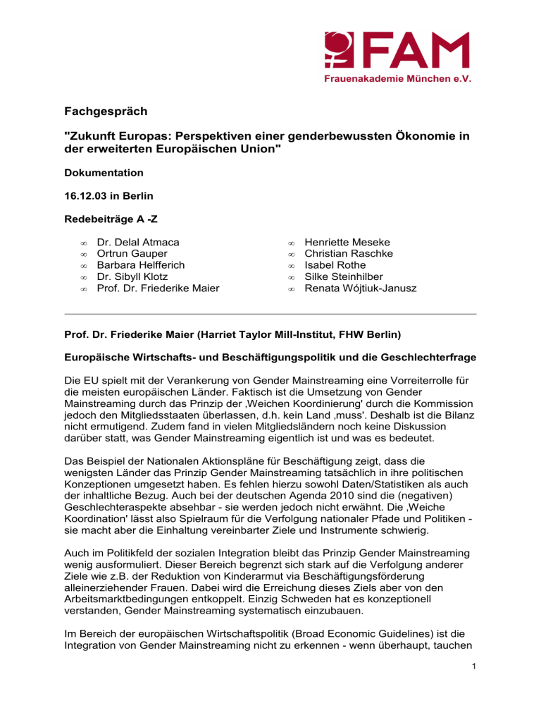 Fachgespräch "Zukunft Europas: Perspektiven einer genderbewussten Ökonomie in der erweiterten Europäischen Union" Dokumentation 16.12.03 in Berlin Redebeiträge A -Z • • • • • Dr. Delal Atmaca Ortrun Gauper Barbara Helfferich Dr. Sibyll Klotz Prof. Dr. Friederike Maier • • • • • Henriette Meseke Christian Raschke Isabel Rothe Silke Steinhilber Renata Wójtiuk-Janusz Prof. Dr. Friederike Maier (Harriet Taylor Mill-Institut, FHW Berlin) Europäische Wirtschafts- und Beschäftigungspolitik und die Geschlechterfrage Die EU spielt mit der Verankerung von Gender Mainstreaming eine Vorreiterrolle für die meisten europäischen Länder. Faktisch ist die Umsetzung von Gender Mainstreaming durch das Prinzip der ‚Weichen Koordinierung' durch die Kommission jedoch den Mitgliedsstaaten überlassen, d.h. kein Land ‚muss'. Deshalb ist die Bilanz nicht ermutigend. Zudem fand in vielen Mitgliedsländern noch keine Diskussion darüber statt, was Gender Mainstreaming eigentlich ist und was es bedeutet. Das Beispiel der Nationalen Aktionspläne für Beschäftigung zeigt, dass die wenigsten Länder das Prinzip Gender Mainstreaming tatsächlich in ihre politischen Konzeptionen umgesetzt haben. Es fehlen hierzu sowohl Daten/Statistiken als auch der inhaltliche Bezug. Auch bei der deutschen Agenda 2010 sind die (negativen) Geschlechteraspekte absehbar - sie werden jedoch nicht erwähnt. Die ‚Weiche Koordination' lässt also Spielraum für die Verfolgung nationaler Pfade und Politiken sie macht aber die Einhaltung vereinbarter Ziele und Instrumente schwierig. Auch im Politikfeld der sozialen Integration bleibt das Prinzip Gender Mainstreaming wenig ausformuliert. Dieser Bereich begrenzt sich stark auf die Verfolgung anderer Ziele wie z.B. der Reduktion von Kinderarmut via Beschäftigungsförderung alleinerziehender Frauen. Dabei wird die Erreichung dieses Ziels aber von den Arbeitsmarktbedingungen entkoppelt. Einzig Schweden hat es konzeptionell verstanden, Gender Mainstreaming systematisch einzubauen. Im Bereich der europäischen Wirtschaftspolitik (Broad Economic Guidelines) ist die Integration von Gender Mainstreaming nicht zu erkennen - wenn überhaupt, tauchen 1 Geschlechteraspekte nur im Zusammenhang mit dem Arbeitsmarkt (Frauen als mobilisierbare Arbeitsmarktreserve angesichts der demografischen Entwicklung) auf. Andere Aspekte wie z.B. Geschlechteraspekte der öffentlichen Steuer- und Haushaltspolitik, der Handelspolitik, der Geldpolitik etc. werden noch nicht einmal im Ansatz thematisiert. Ganz in der Tradition der VWLMakroökonomik sind Geschlechterverhältnisse weitgehend irrelevant und wenig erforscht. Gehandelt wird nach der Maxime: "Eine gute Wirtschaftspolitik ist für alle gut." Neben der fehlenden Gender Mainstreaming-Perspektive ist ein weiteres Problem zu konstatieren. Gender Mainstreaming kann auch Bestandteil einer problematischen wirtschafts- und beschäftigungspolitischen Orientierung sein. Die europäische Wirtschafts-, Beschäftigungs- und Sozialpolitik ist zwar nicht durchgängig einer neoliberalen Handschrift zuzuordnen, dennoch gibt es problematische Prämissen wie z.B. die generelle Orientierung auf Marktkräfte, Privatisierung, ein generelles Credo in Richtung Deregulierung und Flexibilisierung von Arbeitsmarktordnungen und den Abbau sozialer Leistungen. Alle diese Veränderungen des Sozialstaates haben Auswirkungen auf Frauen, die nicht immer zugunsten von Chancengleichheit ausfallen. Eine feministische Vision einer geschlechtergerechten Ökonomie muss deshalb fragen, ob die generelle wirtschaftspolitische Linie stimmt. Es müssen eine prinzipielle Kritik und eine grundsätzliche Politik aus feministischer Sicht formuliert werden. Es darf nicht einfach festgestellt werden: ‚Ihr habt Gender Mainstreaming vergessen!' Zudem müssen Definitionen für folgende Fragestellungen gefunden werden: Was bedeuten öffentliche Dienstleistungen und welche Rolle spielt der Staat? Wie stellen wir uns einen geschlechtergerechten Wohlfahrtsstaat vor? Was verstehen wir unter Gerechtigkeit, Chancengleichheit und Normen? Welche Auswirkungen der EU-Beitritt hinsichtlich Gender Mainstreaming auf die neuen Länder haben wird, ist schwer abzuschätzen, aber die Geschlechterverhältnisse sind zur Zeit vermutlich nicht im Zentrum der Überlegungen der Regierungen und anderer Akteure. Überall in den Beitrittsländern ist die Frauenerwerbstätigkeit zurückgegangen, sind die rechtlichen Regelungen gelockert und "dereguliert" worden, zeigen sich neue soziale Spannungen und Differenzierungen. Hinter dem Rücken der Beteiligten wird sich kein neues positives Geschlechterverhältnis einstellen. Ortrun Gauper (Referatsleiterin für Internationale und Europäische Wirtschaftspolitik, ver.di) Auswirkungen der europäischen Wirtschafts- und Beschäftigungspolitik auf Frauen Die Wirkung von makroökonomischen Prozessen unter genderspezifischen Gesichtspunkten wurde bislang kaum untersucht. Dennoch muss festgestellt werden, dass sich seit der Einführung von Gender Mainstreaming Mitte der 90er Jahre das Geschlechterverhältnis in den EU-Mitgliedstaaten nicht verbessert hat. Das rührt vor allem daher, dass die europäische Wirtschaftspolitik wachstums- und beschäftigungsfeindlich ist, was zu einer Verschärfung der Probleme von Frauen auf 2 den europäischen Arbeitsmärkten führte. Die Fixierung der Geldpolitik auf Preisstabilität gemeinsam mit den restriktiven Budgetpolitiken der Mitgliedstaaten verhinderten Impulse zur Schaffung von Arbeitsplätzen. Die EU hat den Mitgliedstaaten mit der ausgabenseitigen Haushaltskonsolidierung eine strikte Sparpolitik verordnet. Zu massiven Einsparungen bzw. zur Umgestaltung der Systeme kam es vor allem in den Bereichen Gesundheit und Rente. Gerade was staatliche Leistungen betrifft, sind Frauen aber in weit höherem Ausmaß als Männer von deren Bereitstellung abhängig. Verbunden mit dem Rückzug des Staates aus wesentlichen Versorgungsbereichen f