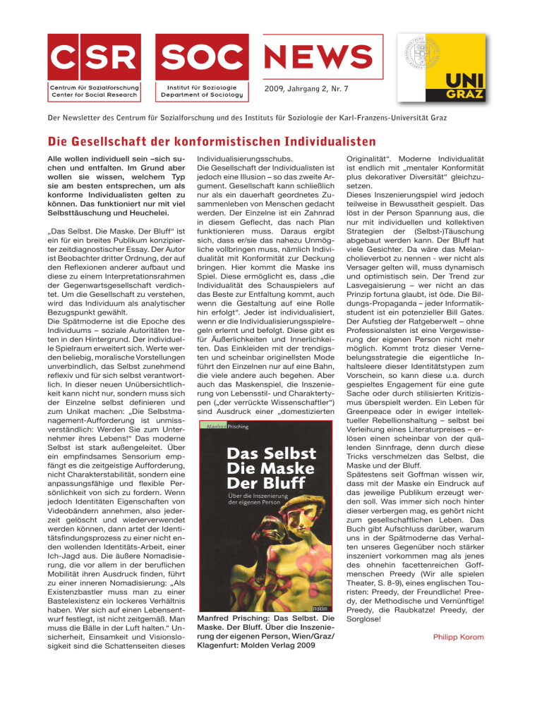 NEWS 2009, Jahrgang 2, Nr. 7 Der Newsletter des Centrum für Sozialforschung und des Instituts für Soziologie der Karl-Franzens-Universität Graz Die Gesellschaft der konformistischen Individualisten Alle wollen individuell sein –sich suchen und entfalten. Im Grund aber wollen sie wissen, welchem Typ sie am besten entsprechen, um als konforme Individualisten gelten zu können. Das funktioniert nur mit viel Selbsttäuschung und Heuchelei. „Das Selbst. Die Maske. Der Bluff“ ist ein für ein breites Publikum konzipierter zeitdiagnostischer Essay. Der Autor ist Beobachter dritter Ordnung, der auf den Reflexionen anderer aufbaut und diese zu einem Interpretationsrahmen der Gegenwartsgesellschaft verdichtet. Um die Gesellschaft zu verstehen, wird das Individuum als analytischer Bezugspunkt gewählt. Die Spätmoderne ist die Epoche des Individuums – soziale Autoritäten treten in den Hintergrund. Der individuelle Spielraum erweitert sich. Werte werden beliebig, moralische Vorstellungen unverbindlich, das Selbst zunehmend reflexiv und für sich selbst verantwortlich. In dieser neuen Unübersichtlichkeit kann nicht nur, sondern muss sich der Einzelne selbst definieren und zum Unikat machen: „Die Selbstmanagement-Aufforderung ist unmissverständlich: Werden Sie zum Unternehmer ihres Lebens!“ Das moderne Selbst ist stark außengeleitet. Über ein empfindsames Sensorium empfängt es die zeitgeistige Aufforderung, nicht Charakterstabilität, sondern eine anpassungsfähige und flexible Persönlichkeit von sich zu fordern. Wenn jedoch Identitäten Eigenschaften von Videobändern annehmen, also jederzeit gelöscht und wiederverwendet werden können, dann artet der Identitätsfindungsprozess zu einer nicht enden wollenden Identitäts-Arbeit, einer Ich-Jagd aus. Die äußere Nomadisierung, die vor allem in der beruflichen Mobilität ihren Ausdruck finden, führt zu einer inneren Nomadisierung: „Als Existenzbastler muss man zu einer Bastelexistenz ein lockeres Verhältnis haben. Wer sich auf einen Lebensentwurf festlegt, ist nicht zeitgemäß. Man muss die Bälle in der Luft halten.“ Unsicherheit, Einsamkeit und Visionslosigkeit sind die Schattenseiten dieses Individualisierungsschubs. Die Gesellschaft der Individualisten ist jedoch eine Illusion – so das zweite Argument. Gesellschaft kann schließlich nur als ein dauerhaft geordnetes Zusammenleben von Menschen gedacht werden. Der Einzelne ist ein Zahnrad in diesem Geflecht, das nach Plan funktionieren muss. Daraus ergibt sich, dass er/sie das nahezu Unmögliche vollbringen muss, nämlich Individualität mit Konformität zur Deckung bringen. Hier kommt die Maske ins Spiel. Diese ermöglicht es, dass „die Individualität des Schauspielers auf das Beste zur Entfaltung kommt, auch wenn die Gestaltung auf eine Rolle hin erfolgt“. Jeder ist individualisiert, wenn er die Individualisierungsspielregeln erlernt und befolgt. Diese gibt es für Äußerlichkeiten und Innerlichkeiten. Das Einkleiden mit der trendigsten und scheinbar originellsten Mode führt den Einzelnen nur auf eine Bahn, die viele andere auch begehen. Aber auch das Maskenspiel, die Inszenierung von Lebensstil- und Charaktertypen („der verrückte Wissenschaftler“) sind Ausdruck einer „domestizierten Manfred Prisching: Das Selbst. Die Maske. Der Bluff. Über die Inszenierung der eigenen Person, Wien/Graz/ Klagenfurt: Molden Verlag 2009 Originalität“. Moderne Individualität ist endlich mit „mentaler Konformität plus dekorativer Diversität“ gleichzusetzen. Dieses Inszenierungspiel wird jedoch teilweise in Bewusstheit gespielt. Das löst in der Person Spannung aus, die nur mit individuellen und kollektiven Strategien der (Selbst-)Täuschung abgebaut werden kann. Der Bluff hat viele Gesichter. Da wäre das Melancholieverbot zu nennen - wer nicht als Versager gelten will, muss dynamisch und optimistisch sein. Der Trend zur Lasvegaisierung – wer nicht an das Prinzip fortuna glaubt, ist öde. Die Bildungs-Propaganda – jeder Informatikstudent ist ein potenzieller Bill Gates. Der Aufstieg der Ratgeberwelt – ohne Professionalsten ist eine Vergewisserung der eigenen Person nicht mehr möglich. Kommt trotz dieser Vernebelungsstrategie die eigentliche Inhaltsleere dieser Identitätstypen zum Vorschein, so kann diese u.a. durch gespieltes Engagement für eine gute Sache oder durch stilisierten Kritizismus überspielt werden. Ein Leben für Greenpeace oder in ewiger intellektueller Rebellionshaltung – selbst bei Verleihung eines Literaturpreises – erlösen einen scheinbar von der quälenden Sinnfrage, denn durch diese Tricks verschmelzen das Selbst, die Maske und der Bluff. Spätestens seit Goffman wissen wir, dass mit der Maske ein Eindruck auf das jeweilige Publikum erzeugt werden soll. Was immer sich noch hinter dieser verbergen mag, es gehört nicht zum gesellschaftlichen Leben. Das Buch gibt Aufschluss darüber, warum uns in der Spätmoderne das Verhalten unseres Gegenüber noch stärker inszeniert vorkommen mag als jenes des ohnehin facettenreichen Goffmenschen Preedy (Wir alle spielen Theater, S. 8-9), eines englischen Touristen: Preedy, der Freundliche! Preedy, der Methodische und Vernünftige! Preedy, die Raubkatze! Preedy, der Sorglose! Philipp Korom Vortragsreihe „Indien – Land der Gegensätze“ Vergangenes Semester setzten das Centrum für Sozialforschung und das Institut für Soziologie einen thematischen Schwerpunkt in ihrer Vortragsreihe, die sich dem einwohnermäßig zweitgrößten Land der Welt widmete – Indien, dem Land der Gegensätze: zwischen Fortschritt und Tradition, Modernisierung und Brauchtum, Säkularisierung und Religion. Drei Vorträge, für die angesehene ProfessorInnen der Universität Mumbai (Bombay) und der Jawaharlal Nehru Universität (New Delhi) gewonnen werden konnten, standen im Zeichen des aufstrebenden Landes in Südasien aus soziologisch-gesellschaftspolitischer Sicht. Der Vortrag von Prof. Dr. Anil Bhatti über „Kult