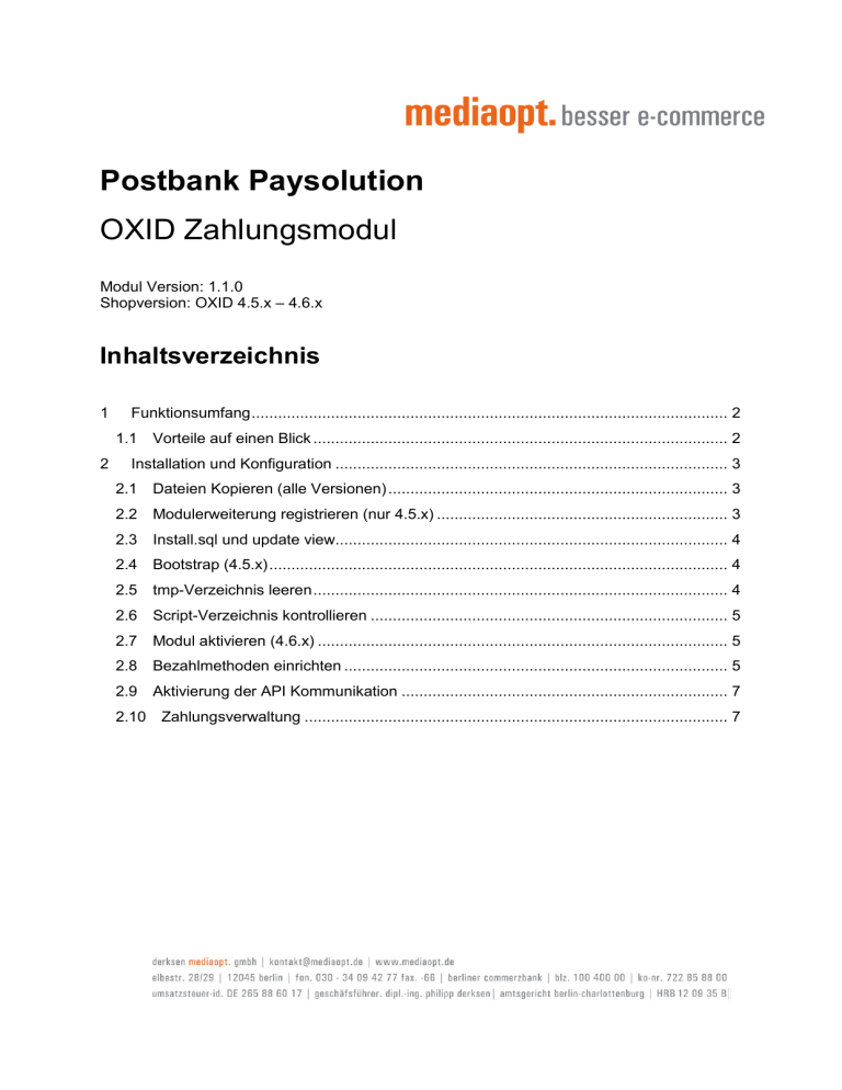 Postbank Paysolution OXID Zahlungsmodul Modul Version: 1.1.0 Shopversion: OXID 4.5.x – 4.6.x Inhaltsverzeichnis 1 Funktionsumfang ............................................................................................................ 2 1.1 Vorteile auf einen Blick .............................................................................................. 2 2 Installation und Konfiguration ......................................................................................... 3 2.1 Dateien Kopieren (alle Versionen) ............................................................................. 3 2.2 Modulerweiterung registrieren (nur 4.5.x) .................................................................. 3 2.3 Install.sql und update view......................................................................................... 4 2.4 Bootstrap (4.5.x) ........................................................................................................ 4 2.5 tmp-Verzeichnis leeren .............................................................................................. 4 2.6 Script-Verzeichnis kontrollieren ................................................................................. 5 2.7 Modul aktivieren (4.6.x) ............................................................................................. 5 2.8 Bezahlmethoden einrichten ....................................................................................... 5 2.9 Aktivierung der API Kommunikation .......................................................................... 7 2.10 Zahlungsverwaltung ................................................................................................ 7 1 Funktionsumfang Das Modul sorgt für die sichere und einfache Abwicklung von Zahlungen über die Postbank Paysolution API mit ihrem OXID eShop. Im bisherigen Leistungsumfang enthalten sind Zahlungen mit den gängigen Kreditkarten VISA und Mastercard. Die Besonderheit dieses Moduls ist das anonyme Kreditkartenhandling, welches es dem Kunden ermöglicht, Kreditkarteninformationen anonym und sicher zu hinterlegen und so den Checkout-Prozess schneller zu durchlaufen. Der Kunde hat dabei die Möglichkeit, die Kreditkartendaten sowohl im Checkout, als auch in seinem Kundenkonto zu bearbeiten. Darüberhinaus kann der Merchant die Kreditkarte des Kunden entweder direkt beim Einkauf belasten, oder aber die Zahlung reservieren und zu einem späteren Zeitpunkt abbuchen. Das wäre beispielsweise für turnusmäßige Abbuchungen von Abo-Produkten interessant, bzw. von nicht unmittelbar lieferbaren Artikeln. Sollte das anonyme Kreditkartenhandling nicht gewünscht sein und der Merchant möchte dem Kunden ausschließlich das herkömmliche Kreditkartenhandling anbieten, so kann dies im Backend, je nach Bedarf, ein und ausgeschalten werden. 1.1 Vorteile auf einen Blick Anbindung Ihrer Hausbank für optimalen Service und Konditionen Kunde kann Kreditkartendaten speichern und so Checkout beschleunigen Shop hat keinen Kontakt mit original Kreditkartendaten, sondern speichert anonmisierte Pseudokartendaten Optionale Einstellung ob Kreditkarten direkt oder z.B. erst nach Versand belastet werden Leichte Installation und Konfiguration durch Modul nach OXID Standard Postbank Paysolution | Modul Version: 1.1.0 | © derksen mediaopt GmbH 2012 Seite [ 2] 2 Installation und Konfiguration Sichern Sie Ihre Shopdaten. Sollte Sie Bedenken bezüglich der Installation des Moduls haben, lassen Sie diese von fachkundigem Personal vornehmen, gerne unterstützen wir Sie dabei. Dieses Modul wurde für die OXID Shop Editionen CE, PE, EE unter den o.g. Versionen entwickelt. Folgen Sie der Anleitung für einen problemlosen Betrieb. Sollte es Unklarheiten in den Installationsanweisungen geben, freuen wir uns über Ihr Feedback ([email protected]). 2.1 Dateien Kopieren (alle Versionen) Stellen Sie eine Verbindung z.B. via FTP zu Ihrem Webserver her Kopieren Sie den Inhalt des Verzeichnisses copy_this in Ihr Shop Stammverzeichnis Nutzen Sie ein anderes OXID Theme als Azure, kopieren Sie bitte den Inhalt des Themeverzeichnisses copy_this/out/azure in das Verzeichnis Ihres aktiven Themes. Migirieren Sie ggf. die erweiterten Blöcke unter /modules/mo_paysolution/out/blocks 2.2 Modulerweiterung registrieren (nur 4.5.x) Melden Sie sich im Administrationsbereich des Shops an und registrieren Sie folgende Erweiterungen (Stammdaten => Grundeinstellungen => System => Module): oxorder => mo_paysolution/core/mo_paysolution__oxorder oxpayment => mo_paysolution/core/mo_paysolution__oxpayment oxuser => mo_paysolution/core/mo_paysolution__oxuser order => mo_paysolution/views/mo_paysolution__order thankyou => mo_paysolution/views/mo_paysolution__thankyou Postbank Paysolution | Modul Version: 1.1.0 | © derksen mediaopt GmbH 2012 Seite [ 3] 2.3 Install.sql und update view Führen Sie nun das Datenbank-Update unter Service => Tools durch. Verwenden Sie dafür die install_4.5.sql, bzw. install.sql (für Shopversion 4.6.x). 2.4 Bootstrap (4.5.x) Fügen Sie folgende Zeile der Datei /modules/functions.php hinzu: include dirname( __FILE__ ) . "/mo_paysolution/bootstrap.php"; 2.5 tmp-Verzeichnis leeren Im OXID Hauptverzeichnis unter /tmp sämtliche *.php & *.txt Dateien löschen. Postbank Paysolution | Modul Version: 1.1.0 | © derksen mediaopt GmbH 2012 Seite [ 4] 2.6 Script-Verzeichnis kontrollieren Stellen Sie sicher, daß die Dateien im Ordner /modules/mo_paysolution/scripts von ausserhalb erreichbar sind (notwendig für API-Kommunikation). Ein erfolgreicher Aufruf der folgenden URL gibt Ihnen Gewissheit: <meine-shopURL>/modules/mo_paysolution/scripts/mo_paysolution__shopNotifica tion.php?mo_paysolution__checkScript=1 2.7 Modul aktivieren (4.6.x) Aktivieren Sie ihr Modul indem Sie es im neuen OXID Modulhandling anklicken. Sollten Sie es nicht mehr benötigen, oder wollen Sie Ihr Modul kurzfristig inaktiv setzen, dann können Sie das an selber stelle wieder inaktiv setzen. 2.8 B