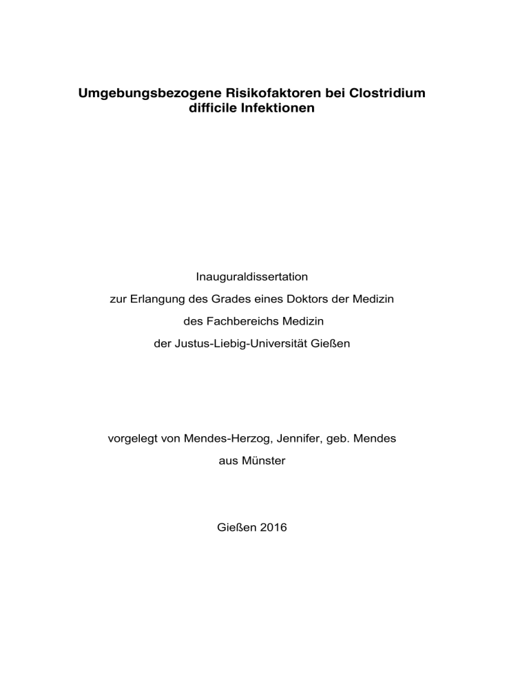 Umgebungsbezogene Risikofaktoren bei Clostridium difficile Infektionen Inauguraldissertation zur Erlangung des Grades eines Doktors der Medizin des Fachbereichs Medizin der Justus-Liebig-Universität Gießen vorgelegt von Mendes-Herzog, Jennifer, geb. Mendes aus Münster Gießen 2016 Aus dem Institut für Hygiene und Umweltmedizin des Fachbereichs Medizin Universitätsklinikum Gießen und Marburg GmbH Standort Gießen Direktor: Prof. Dr. med. Thomas Eikmann 1. Gutachter: Prof. Dr. Eikmann 2. Gutachter: Prof. Dr. Chakraborty Tag der Disputation: 25.01.2017 Inhaltsverzeichnis 1. Einleitung 1.1 Clostridium difficile (C. difficile) 1.1.1 Pathogenitätsfaktoren 1.1.2 Epidemiologie und Inzidenz von C. difficile 1.1.3 Übertragung von C. difficile 1.1.4 Anamnese und Diagnose von C. difficile 1.1.5 Nachweis von C. difficile 1.1.6 Therapie und hygienische Maßnahmen bei C. difficile positiven Patienten 1.1.7 Prävention 1.1.8 Umgebungsbezogene Risikofaktoren 1.2 Fragestellung und Zielsetzung 1 3 3 4 6 8 9 10 12 13 14 2. Material und Methoden 2.1 Kriterien für die Erhebung 2.2 Datenerhebung 2.2.1 Operativer Ablauf 2.2.2 Aufbau des Fragebogens 2.3 Datenauswertung 2.3.1 Erhebung der Daten und Erstellung des Fragebogens mit Hilfe des Dokumentationsprogramms Arxepi 2.3.2 Statistische Auswertung mittels SPSS 2.4 Nachweis von Clostridium difficile mittels X/pect® von Remel (Remel. Xpect®, 2007) 15 16 16 16 17 17 3. Ergebnisse 3.1 Beschreibung der Kontroll- und Patientengruppe 3.1.1 Altersstruktur und Geschlechterverteilung 3.1.2 Verteilung der C. difficile positiven Patienten in den verschiedenen Fachabteilungen 3.2 Prüfung definierter Faktoren zur Begünstigung der Übertragung von Clostridium difficile Infrastrukturelle Faktoren: 3.2.1 Bettenzahl der verschiedenen Stationen 3.2.2 Anteil der Einzelzimmer auf den untersuchten Stationen Anteil der Mehrbettzimmer auf den untersuchten Stationen 3.2.3 Bauliche Trennung der Stationen 3.3 Anteil der Pflegekräfte: 3.3.1 Im Frühdienst 3.3.2 Im Spätdienst 3.3.3 Im Nachtdienst 3.4. Bettwäschewechsel und Toilettenreinigung 3.4.1 Häufigkeit des Bettwäschewechsels 3.4.2 Häufigkeit des Stecklakenwechsels 3.4.3 Häufigkeit der Toilettenreinigung 3.5 Belegungsdichte der Patientenzimmer als Übertragungsfaktor 3.5.1 Nachweis von Diarrhöen in einem gemeinsamen Patientenzimmer 21 21 21 25 28 28 29 31 34 37 40 40 42 46 48 49 51 53 56 56 17 18 19 3.5.2 Nachweis von C. difficile in einem gemeinsamen Patientenzimmer 3.5.3 Anzahl der Zimmernachbarn 3.5.4 Anzahl der Patienten die eine gemeinsame Toilette benutzen 57 58 59 4. Diskussion 62 4.1 Stationsgröße, Belegungsdichte und bauliche Aspekte 62 4.1.1 Zusammenhang zwischen einer erhöhten Bettenzahl auf den Stationen sowie der Belegungsdichte der Patientenzimmer und dem Risiko für die Übertragung von Clostridium difficile 62 4.1.2 Vorkommen von Diarrhöen bzw. Clostridium difficile in einem gemeinsamen Patientenzimmer und deren Einfluss auf die Übertragung von Clostridium difficile 65 4.1.3 Im Falle einer baulich getrennten Station sinkt das Übertragungsrisiko von C. difficile 65 4.2 Personaldichte 66 4.2.1 Zusammenhang zwischen der Anzahl der Pflegekräfte und der Übertragung von C. difficile 66 4.3 Reinigung und Bettwäschewechsel 67 4.3.1 Zusammenhang zwischen der Frequenz von Toilettenreinigung und Bettwäschewechsel und der Übertragung von C. difficile 67 4.4 Methodik und Limitierung der Studie 69 5. Zusammenfassung Summary 70 71 6. Verzeichnisse 6.1 Abkürzungsverzeichnis 6.2 Tabellenverzeichnis 6.3 Abbildungsverzeichnis 6.4 Literaturverzeichnis 72 72 73 74 76 7. Anhang 7.1 Fragebogen 7.2 Logistische Regressionen Erklärung zur Dissertation Danksagung 85 85 89 97 98 1. Einleitung Clostridium difficile (C. difficile) ist die häufigste Ursache der nosokomialen Durchfallerkrankungen und in 15%-25% der Fälle hauptverantwortlich für die Antibiotikaassoziierte Diarrhö (AAD) (Bartlett, 2008). Die Symptome der Clostridium-difficile-assoziierten Erkrankungen (CDAD) variieren von einer milden Diarrhö bis hin zu einer Darmentzündung mit Fieber und abdominellen Schmerzen. Eine gefürchtete Komplikation ist die, mit über 95% durch C. difficile verursachten, pseudomembranösen Kolitis (Bartlett, 2002). Hierbei kann es aufgrund der massiven Diarrhöen zu einer Dehydration, Elektrolytverschiebung, Leukozytose, Hypalbuminämie, Nierenversagen, Sepsis bis hin zu einem toxischen Megakolon kommen und letztendlich zum Tode führen (Cohen, 2010). Als wesentliche Risikofaktoren gelten die Dauer des Krankenhausaufenthaltes, Aufenthalt auf der Intensivstation, lange Verweildauer in einer hämato-onkologischen Einrichtung, Pflege in Mehrbettzimmern, Schwere der Grunderkrankung und die Verordnung von Breitspektrum-BetalaktamAntibiotika, neueren Fluorchinolonen und Clindamycin sowie ein hohes Lebensalter (Lübbert C, 2013). Während 2-5% der gesunden Erwachsenen Träger sind, kommt es nach stationärer Aufnahme bei 10-25% der Patienten rasch zu einer Kolonisation von C. difficile (Lübbert, 2013). 15-71% dieser Patienten entwickeln eine symptomatische C.-difficile-assoziierte Diarrhö und bei über 90% der Patienten mit einer pseudomembranösen Kolitis lässt sich der Keim nachweisen. Die Sterblichkeit der CDAD liegt bei 1 bis 2%, im Falle einer pseudomembranösen Kolitis steigt sie jedoch auf 6 bis 30% (Schneider, 2007) Die Therapie der CDAD erfolgt antibiotisch und richtet sich nach dem Schweregrad der Erkrankung. Bevorzugt wird mit Metronidazol oder alternativ mit einem GlykopeptidAntibiotikum behandelt (Eckert, 2015). Ausgehend von den USA, breitet sich seit 2001 ein neuer hypervirulenter Stamm aus. Dieser Stamm wird als NAP1-Stamm (oder auch als R027) bezeichnet und ist verantwortlich für weltweite Ausbrüche mit ansteigender Mortalität und Schweregrad der Erkrankung (Eckert, 2015). Des Weiteren zeigen Untersuchungen der vergangenen Jahre, ein vermehrtes Auftreten multiresistenter C. difficile Stämme, welche gehä