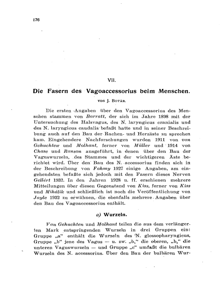 176. VII. Die Fasern des Vagoaccessorius beim Menschen. v o n J . BOTÁR. Die ersten -Angaben über den Vagoaccessorius des Menschen stammen von Barratt, der sich im Jahre 1898 mit der Untersuchung des Halsvagus, des N. laryngicus cranialis und des N. laryngious caudalis befaßt hatte und in seiner Beschreibung auch auf den Bau der Bachen- und Herzäste zu sprechen kam. Eingehendere Nachforschungen wurden 1911 von van Gebuchten1 und Mólhant, ferner von Mütter und 1914 von Chase und Ranson ausgeführt, in denen über den Bau der Vaguswurzeln, des Stammes und der wichtigeren Äste berichtet wird. Über den' Bau des N. accessorius finden sich in der Beschreibung von Fahmy 1927 einige Angaben, am eingehendsten befaßte sich jedoch mit den Fasern dieses Nerven Gellért 1932. In den Jahren 1928 u. ff. erschienen mehrere Mitteilungen über diesen Gegenstand von Kiss, ferner von Kiss und Mihälik und schließlich ist noch die Veröffentlichung von Jayle 1932 zu erwähnen, die ebenfalls mehrere < Angaben über den Bau des Vagoaccessorius enthält. a) Wurzeln. Van Gebuchten und Molhant teilen die aus dem verlängerten Mark entspringenden Wurzeln in drei Gruppen ein: Gruppe „a" enthält die Wurzeln des 'N. glossopharyngicus, Gruppe „b" jene des Vagus — u. zw: „ V die oberen, „b2" die unteren Vaguswurzeln — und Gruppe „c" umfaßt die bulbären Wurzeln des N. accessorius. Über den Bau der bulbären Wur- 177. zeln wird gesagt, daß sie drei Arten von markhaltigen Fasern enthalten: 1. dicke markhaltige Fasern sind in der größten Anzahl in Gruppe „b2" anzutreffen, kommen aber in geringerer Menge auch in den Wurzeln der Gruppe „c" vor; 2. mittlere markhaltige Fasern sind fast ausschließlich bei „bj" zu finden; 3. dünne markhaltige Fasern sind in jeder Gruppe enthalten, in größter Zahl finden sie sich in den Gruppen „b2" und „c". Abb. 75. Mensch. Radix spinalis nervi accessorii in der Höhe des Segments C. V. Abb. 76. Mensch. Radix spinalis nervi accessorii in der Höhe des Segments C. II. Radix spinalis nervi accessorii. Nach van Gehuckten und Molhant besteht der spinale Wurzelstamm des Accessorius zum größten Teil aus dicken markhaltigen Fasern. Mitunter ist in einem Randteil des Querschnittes ein kleines, aus dünnen markhaltigen Fasern zusammengesetztes Gebiet zu sehen. Ähnlich lautet auch die Beschreibung von Fahmy: die spinale Wurzel des N. accessorius enthält dicke und dünne markhaltige Fasern, mittlere markhaltige fehlen fast ganz. Nach den Ergebnissen von Kiss und Mihdlik sind für den Bau des XI. Hirnnerven Fasern mit sehr dicker Markscheide und großem Durchmesser bezeichnend. 178. Nach den sehr eingehenden Untersuchungen von Gellért besteht der spinale Wurzelstamm des N. accessorius bloß aus einem Nervenbündel, das hauptsächlich dicke markhaltige und auf einem kleinen Gebiet auch dünne markhaltige Fasern Abb. 77. Mensch. Radix spinalis nervi accessorii oberhalb des Segments C. 1. enthält. Unter den dünnen markhaltigen sind auch einige marklose Fasern zu sehen, deren Zahl im Vergleich zu jener der markhaltigen verschwindend klein ist. Im Laufe unserer Untersuchungen wurden nicht nur aus 179. dem Wurzelstamm in der jedem spinalen Segment entsprechenden Höhe sowie aus der Gegend des Eintritts in die Schädelhöhle, sondern auch aus jenen Meinen Wurzeln, die sich in den einzelnen Spinalsegmenten dem Wurzelstamm anschließen, Schnitte angefertigt. Der Stamm der Spinalwurzel des N. accessorius besteht in der Höhe des Segments C. V noch aus einem sehr dünnen Nervenbündel, das sich aus dicken und darunter verstreuten wenigen mittleren markhaltigen Pasern zusammensetzt (Abb. 75). In der Höhe des Segments C. III ist der Wurzelstamm bedeutend kräftiger, die Struktur aber noch unverändert. In der Höhe des Segments C. II wird der spinale Wurzelstamm des N. accessorius schon durch einen kräftigen Nervenstrang gebildet, dessen Bau noch dem früheren ähnlich ist, doch fallen hier am Rande der Wurzel schon 2—3 kleine Inseln auf, die aus Abb. 78. Mensch. Radix nervi accessorii spinalis im Segment C. III, Abb. 79. Mensch. Radices nervi accessorii spinalis im Segment C. I. dünnen markhaltigen sowie marklosen Fasern bestehen (Abb. 76). In der Höhe des Segments C. I zeigt der Bau im Vergleich zu dem letzterwähnten keine wesentliche Änderung, bloß haben sich die aus dünnen markhaltigen und marklosen Fasern zusammengesetzten, unregelmäßig geformten Inselohen vermehrt. Bei dem Eintritt in die Schädelhöhle schließlich läßt der Wurzelstamm schon deutlich zwei Gebiete von verschiedenem Bau erkennen: wie das Querschnittbild zeigt, wird der größte Teil des Wurzelstammes von dicken markhaltigen Fasern eingenommen, unter denen verstreute mittlere markhaltige Fasern zu sehen sind; in dem einen Pol des Querschnitts kann man aber Gebiete starker Ausbreitung und unregelmäßiger Form bemerken, die dünne markhaltige und marklose Fasern in ungefähr gleicher Menge und gleichmäßiger Ver- 180. teilüng enthalten. In diesen Gebieten finden sich auch vereinzelte dicke und mittlere markhaltige Fasern, so daß sie in bezug auf den Bau an die bulbären' Wurzeln des N. accessorius erinnern. In der Nachbarschaft dieser Gebiete gibt es unter den dicken und mittleren markhaltigen Fasern auch Inseln von ähnlichem Bau aber bedeutend geringerer Ausdehnung (Abb. 77). Die kleinen Wurzelchen, die sich dem spinalen Wurzelstamm des Accessorius anschließen, lassen sich mach ihrem Bau in drei Gruppen teilen: a) Die aus den Spinalsegmenten C. V—C. I i i hervortretenden Wurzeichen bestehen durchwegs aus dicken und mittleren markhaltigen Fasern; mitunter treten schon in der Höhe des Segments C.-III in dem einen öder anderen Wurzelchen wenige dünne markhaltige und .marklose Fasern auf (Abb. 78). b) Vom Segment C. I I langefangen enthalten sämtliche Wurzelchen mehrere, kleine, aus dünnen markhaltigen und marklosen Fasern zusammengesetzte Bündel (Abb. 79). Diese sind am "za