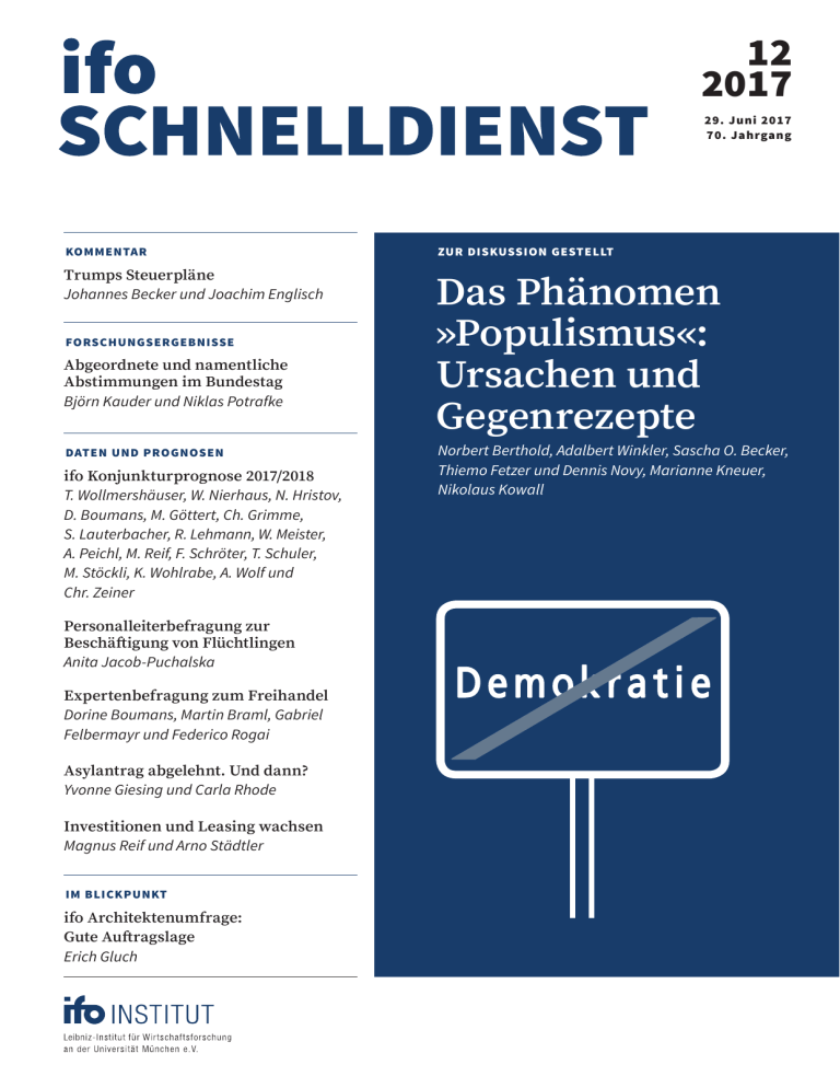 12 2017 29. Juni 2017 70. Jahrgang KOMMENTAR ZUR DISKUSSION GESTELLT Trumps Steuerpläne Johannes Becker und Joachim Englisch Das Phänomen »Populismus«: Ursachen und Gegenrezepte FORSCHUNGSERGEBNISSE Abgeordnete und namentliche Abstimmungen im Bundestag Björn Kauder und Niklas Potrafke DATEN UND PROGNOSEN ifo Konjunkturprognose 2017/2018 T. Wollmershäuser, W. Nierhaus, N. Hristov, D. Boumans, M. Göttert, Ch. Grimme, S. Lauterbacher, R. Lehmann, W. Meister, A. Peichl, M. Reif, F. Schröter, T. Schuler, M. Stöckli, K. Wohlrabe, A. Wolf und Chr. Zeiner Personalleiterbefragung zur Beschäftigung von Flüchtlingen Anita Jacob-Puchalska Expertenbefragung zum Freihandel Dorine Boumans, Martin Braml, Gabriel Felbermayr und Federico Rogai Asylantrag abgelehnt. Und dann? Yvonne Giesing und Carla Rhode Investitionen und Leasing wachsen Magnus Reif und Arno Städtler IM BLICKPUNKT ifo Architektenumfrage: Gute Auftragslage Erich Gluch Norbert Berthold, Adalbert Winkler, Sascha O. Becker, Thiemo Fetzer und Dennis Novy, Marianne Kneuer, Nikolaus Kowall ifo Schnelldienst ISSN 0018-974 X (Druckversion) ISSN 2199-4455 (elektronische Version) Herausgeber: ifo Institut, Poschingerstraße 5, 81679 München, Postfach 86 04 60, 81631 München, Telefon (089) 92 24-0, Telefax (089) 98 53 69, E-Mail: [email protected]. Redaktion: Dr. Marga Jennewein. Redaktionskomitee: Prof. Dr. Dr. h.c. Clemens Fuest, Annette Marquardt, Prof. Dr. Chang Woon Nam. Vertrieb: ifo Institut. Erscheinungsweise: zweimal monatlich. Bezugspreis jährlich: Institutionen EUR 225,– Einzelpersonen EUR 96,– Studenten EUR 48,– Preis des Einzelheftes: EUR 10,– jeweils zuzüglich Versandkosten. Layout: Kochan & Partner GmbH. Satz: ifo Institut. Druck: Majer & Finckh, Stockdorf. Nachdruck und sonstige Verbreitung (auch auszugsweise): nur mit Quellenangabe und gegen Einsendung eines Belegexemplars. im Internet: http://www.cesifo-group.de SCHNELLDIENST 12/2017 ZUR DISKUSSION GESTELLT Das Phänomen »Populismus«: Ursachen und Gegenrezepte 3 Der Brexit, die Wahl Donald Trumps, die Zugewinne des Front National in Frankreich, der AfD in Deutschland und Geert Wilders in den Niederlanden: Der Populismus erlebt derzeit einen Höhenflug. Was sind die Ursachen und die Effekte dieser Erfolgswellen? Nach Ansicht von Norbert Berthold, Universität Würzburg, spricht einiges dafür, dass die Globalisierung populistische Entwicklungen begünstigt. Wichtiger scheinen allerdings der technische Fortschritt, da er die einfache Arbeit benachteilige, und die Migrationsströme in reiche Länder zu sein. Zudem spielen auch kulturelle Elemente, Informationslücken, Vorurteile und Stereotypen eine wichtige Rolle. Adalbert Winkler, Frankfurt School of Finance & Management, sieht unter anderem die Ursachen für das Erstarken populistischer Strömungen darin, dass die Finanz-, Euro- und Flüchtlingskrise die Zahl der Menschen, die abgehängt sind oder sich abgehängt fühlen, erheblich haben steigen lassen und die etablierten Parteien überfordert sind, diese Krisen zu bekämpfen. Sascha O. Becker, Thiemo Fetzer und Dennis Novy, University of Warwick, kommen nach der Analyse von Daten aus 380 Landkreisen Großbritanniens zu dem Schluss, dass Faktoren, wie Demographie, Bildung und Wirtschaftsstruktur, einen deutlich größeren Einfluss auf die Brexit-Entscheidung der britischen Wähler hatten als Faktoren, die eine direkte Verbindung zur EU beinhalten. Für Marianne Kneuer, Universität Hildesheim, waren die Krisen sicher ein trigger, aber nicht die Ursache für das derzeitige Phänomen von Populismus. Hier seien tieferliegende strukturelle Gründe verantwortlich: zum einen die wirtschaftlichen Unsicherheiten, wie wachsende Ungleichheit, das Gefühl, ein Globalisierungsverlierer zu sein, Angst vor sozialem Abstieg, zum andern politische Gründe, da die repräsentative Demokratie in einer tiefen Vertrauenskrise stecke und Populisten von den funktionalen Defiziten, die in den Parteien und den Parteienlandschaften über die Jahre Eingang gefunden haben, profitieren. Nikolaus Kowall, Forschungsinstitut für gesellschaftliche Weiterentwicklung, Düsseldorf, ist der Meinung, dass die Reallokation von Ressourcen im Rahmen der Globalisierung staatliche Handlungsräume limitiere. Der Verlust staatlicher Souveränität habe mit dem Rechtspopulismus eine antimoderne politische Strömung auf den Plan gerufen, die das Primat der Politik explizit auf nationaler Ebene restaurieren möchte. Eine Antwort für Europa läge in einer verstärkten Integration Europas bei gleichzeitigem Stopp politischer Maßnahmen zur weiteren Integration der EU in den Weltmarkt. KOMMENTAR Trumps Steuerpläne 22 Johannes Becker und Joachim Englisch Johannes Becker und Joachim Englisch, Universität Münster, zeigen in ihrem Kommentar, dass die Steuerreformpläne von Donald Trump zu einer spürbaren Entlastung aller Steuerzahler, aber vor allem bei eigentümergeführten Unternehmen und Erben führen werden. Die Wachstumseffekte der Reform werden allerdings, gemessen an den eingesetzten Mitteln, voraussichtlich eher schwach ausfallen. Die starken Steuersatzsenkungen lassen eine Verschärfung des Steuerwettbewerbs befürchten. FORSCHUNGSERGEBNISSE Gibt es Schelte für Bundestagsabgeordnete, die nicht mit ihrer eigenen Partei stimmen? 26 Björn Kauder und Niklas Potrafke Werden Bundestagsabgeordnete von ihren Parteien abgestraft, wenn sie in namentlichen Abstimmungen im Bundestag nicht mit ihrer Partei stimmen? Betrachtet wurden alle 218 namentlichen Abstimmungen in der Legislaturperiode 2009–2013 für 257 über die Liste in den Bundestag eingezogene Abgeordnete. Die Ergebnisse der Untersuchung zeigen nicht, dass die Parteien Bundestagsabgeordnete für das Abweichen von der Parteilinie bei erneuten Nominierungen abgestraft haben. DATEN UND PROGNOSEN ifo Konjunkturprognose 2017/2018: Deutsche Wirtschaft stark und stabil 30 Timo Wollmershäuser, Wolfgang Nierhaus, Nikolay Hristov, Dorine Boumans, Marce
