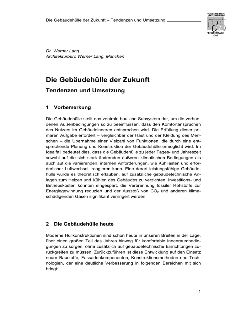 ROSENHEIMER Die Gebäudehülle der Zukunft – Tendenzen und Umsetzung FENSTERTAGE 2002 Dr. Werner Lang Architekturbüro Werner Lang, München Die Gebäudehülle der Zukunft Tendenzen und Umsetzung 1 Vorbemerkung Die Gebäudehülle stellt das zentrale bauliche Subsystem dar, um die vorhandenen Außenbedingungen so zu beeinflussen, dass den Komfortansprüchen des Nutzers im Gebäudeinneren entsprochen wird. Die Erfüllung dieser primären Aufgabe erfordert – vergleichbar der Haut und der Kleidung des Menschen – die Übernahme einer Vielzahl von Funktionen, die durch eine entsprechende Planung und Konstruktion der Gebäudehülle ermöglicht wird. Im Idealfall bedeutet dies, dass die Gebäudehülle zu jeder Tages- und Jahreszeit sowohl auf die sich stark ändernden äußeren klimatischen Bedingungen als auch auf die variierenden, internen Anforderungen, wie Kühllasten und erforderlicher Luftwechsel, reagieren kann. Eine derart leistungsfähige Gebäudehülle würde es theoretisch erlauben, auf zusätzliche gebäudetechnische Anlagen zum Heizen und Kühlen des Gebäudes zu verzichten. Investitions- und Betriebskosten könnten eingespart, die Verbrennung fossiler Rohstoffe zur Energiegewinnung reduziert und der Ausstoß von CO2 und anderen klimaschädigenden Gasen signifikant verringert werden. 2 Die Gebäudehülle heute Moderne Hüllkonstruktionen sind schon heute in unseren Breiten in der Lage, über einen großen Teil des Jahres hinweg für komfortable Innenraumbedingungen zu sorgen, ohne zusätzlich auf gebäudetechnische Einrichtungen zurückgreifen zu müssen. Zurückzuführen ist diese Entwicklung auf den Einsatz neuer Baustoffe, Fassadenkomponenten, Konstruktionsmethoden und Technologien, der eine deutliche Verbesserung in folgenden Bereichen mit sich bringt: 1 ROSENHEIMER Die Gebäudehülle der Zukunft – Tendenzen und Umsetzung FENSTERTAGE 2002 ¦ ¦ ¦ ¦ ¦ ¦ ¦ ¦ Wärmeschutz, Sonnenschutz, Blendschutz, Tageslichtnutzung, natürliche Lüftung, Feuchtigkeitsschutz, Windschutz, Energiegewinnung. So weisen beispielsweise Wand- und Dachkonstruktionen von Gebäuden aus 2 den 50er und 60er Jahren U-Werte für die Außenwand von ca. 1,3 W/(m K) 2 und für einfach verglaste Fenster von 5,2 W/(m K) auf, während für heutige 2 Außenwandkonstruktionen U-Werte von 0,3 W/(m K) und für Isoliervergla2 sungen von 1,1 W/(m K) durchaus üblich sind. Die Verkürzung der Heizperiode, eine deutliche Energieeinsparung und eine geringere Dimensionierung der wärmetechnischen Anlagen im Wohnungsbau sind die Folge dieser Entwicklung. Doch auch für das Erscheinungsbild der Gebäude hat die Entwicklung heutiger Isolierverglasungen, Beschichtungsarten und Fassadenkonstruktionen eine enorme Bedeutung, was vor allem an dem Erscheinungsbild moderner Verwaltungsgebäude deutlich abgelesen werden kann. Nahezu vollständig transparent erscheinende Fassaden bestimmen das Bild und erlauben einen uneingeschränkten Bezug von innen nach außen. Schon heute ist eine Vielzahl von innovativen Komponenten verfügbar, welche die Vision einer multifunktionalen, auf unterschiedliche Anforderungen rasch reagierenden Gebäudehülle greifbar nahe erscheinen lassen. 2.1 Zielgrößen einer variablen Gebäudehülle Um ganzjährig einen optimalen Komfort im Gebäudeinneren zu erreichen, muss die Gebäudehülle nicht nur flexibel reagieren, sondern gegebenenfalls entgegenstehende Forderungen erfüllen können. So sollte an einem warmen Sommertag zur Vermeidung von Überhitzung möglichst wenig Solarstrahlung in das Gebäude gelangen, gleichzeitig im gesamten Innenraum eine ausreichende Tageslichtverteilung erreicht werden. Im Winter hingegen sollte zur Nutzung passiver Wärmegewinne möglichst viel Solarstrahlung in den Raum dringen, ohne dass die Nutzer geblendet werden, gleichzeitig muss nachts eine starke Auskühlung des Gebäudes durch die transparente Hülle hindurch vermieden werden. 2 ROSENHEIMER Die Gebäudehülle der Zukunft – Tendenzen und Umsetzung FENSTERTAGE 2002 Tabelle 1 Übersicht zu den Anforderungen an die Kenngrößen der Gebäudehülle U-Wert g-Wert z-Wert tvis-Wert Sommertag klarer Himmel hoch niedrig niedrig hoch Sommertag bedeckt hoch nicht relevant nicht relevant hoch Sommernacht hoch nicht relevant nicht relevant niedrig (Sichtschutz) Wintertag klarer Himmel niedrig hoch hoch hoch Wintertag bedeckt niedrig nicht relevant nicht relevant hoch Winternacht niedrig nicht relevant nicht relevant niedrig (Sichtschutz) Während der Wärmedurchgangskoeffizient (U-Wert) eine allgemein bekannte Kenngröße darstellt, ist der Gesamtenergiedurchlassgrad (g-Wert), obwohl er eine entscheidende Größe bei der Konzeption von transparenten Fassaden darstellt, weniger bekannt. Der g-Wert gibt an, welcher Anteil der auf eine transparente oder transluzente Außenwandkonstruktion auftreffenden Solarstrahlung an den Raum weitergegeben wird. Die g-Werte heutiger Isolierverglasungen liegen in der Regel zwischen 60 und 80 %, können aber bei Verwendung von speziellen Isoliergläsern auch Werte unter 40 % erreichen. Der Abminderungsfaktor z bezieht sich auf die Sonnenschutzwirkung von Verschattungseinrichtungen und gibt an, welcher Anteil der auftreffenden Strahlungsenergie von einem Sonnenschutzsystem durchgelassen wird. Dieser Wert hängt unmittelbar von der Ausführung und dem Stellwinkel des Sonnenschutzsystems ab und lässt Rückschlüsse darauf zu, wie sehr sich ein Innenraum unter Sonneneinstrahlung aufwärmt. Der Tageslichtdurchlassgrad (tvis) gibt an, welcher Prozentsatz des außerhalb eines Gebäudes vorhandenen Tageslichts (Wellenlängenbereich 320 bis 780 nm) durch die Verglasung hindurch tritt. Ein typischer tvis-Wert für heutige Isolierverglasungen liegt bei etwa 70 %. 2.2 Komponenten moderner Gebäudehüllen Um den wechselnden Witterungsbedingungen und schwankenden internen Anforderungen gerecht werden zu können, reicht es nicht aus, eine nur in thermischer Hinsicht optimierte Gebäudehülle mit sehr g