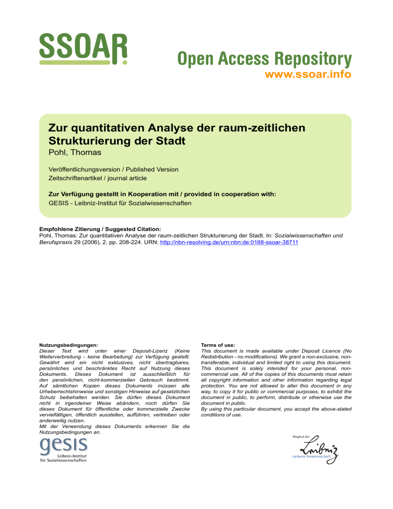 www.ssoar.info Zur quantitativen Analyse der raum-zeitlichen Strukturierung der Stadt Pohl, Thomas Veröffentlichungsversion / Published Version Zeitschriftenartikel / journal article Zur Verfügung gestellt in Kooperation mit / provided in cooperation with: GESIS - Leibniz-Institut für Sozialwissenschaften Empfohlene Zitierung / Suggested Citation: Pohl, Thomas: Zur quantitativen Analyse der raum-zeitlichen Strukturierung der Stadt. In: Sozialwissenschaften und Berufspraxis 29 (2006), 2, pp. 208-224. URN: http://nbn-resolving.de/urn:nbn:de:0168-ssoar-38711 Nutzungsbedingungen: Dieser Text wird unter einer Deposit-Lizenz (Keine Weiterverbreitung - keine Bearbeitung) zur Verfügung gestellt. Gewährt wird ein nicht exklusives, nicht übertragbares, persönliches und beschränktes Recht auf Nutzung dieses Dokuments. Dieses Dokument ist ausschließlich für den persönlichen, nicht-kommerziellen Gebrauch bestimmt. Auf sämtlichen Kopien dieses Dokuments müssen alle Urheberrechtshinweise und sonstigen Hinweise auf gesetzlichen Schutz beibehalten werden. Sie dürfen dieses Dokument nicht in irgendeiner Weise abändern, noch dürfen Sie dieses Dokument für öffentliche oder kommerzielle Zwecke vervielfältigen, öffentlich ausstellen, aufführen, vertreiben oder anderweitig nutzen. Mit der Verwendung dieses Dokuments erkennen Sie die Nutzungsbedingungen an. Terms of use: This document is made available under Deposit Licence (No Redistribution - no modifications). We grant a non-exclusive, nontransferable, individual and limited right to using this document. This document is solely intended for your personal, noncommercial use. All of the copies of this documents must retain all copyright information and other information regarding legal protection. You are not allowed to alter this document in any way, to copy it for public or commercial purposes, to exhibit the document in public, to perform, distribute or otherwise use the document in public. By using this particular document, you accept the above-stated conditions of use. Zur quantitativen Analyse der raum-zeitlichen Strukturierung der Stadt Thomas Pohl 1 Bedeutung eines zeitgeographischen Regionalisierungsverfahrens Resultierend aus dem Wechsel von (täglichen) Aktivitäts- und (nächtlichen) Ruhezeiten lassen sich in unseren Städten rhythmisch wiederkehrende Phänomene beobachten. Ein prominentes Beispiel hierfür ist die alltägliche „Rushhour“, die aus räumlicher Perspektive durch die funktionale Differenzierung innerstädtischer Quartiere und aus zeitlicher Perspektive durch kollektiv geteilte Arbeitszeiten erklärbar ist. Die derzeit diskutierten Flexibilisierungstendenzen spätmoderner Arbeitsbeziehungen geben Anlass zu der Vermutung, dass sich diese städtischen Alltagsrhythmen in einem strukturellen Wandlungsprozess befinden, zumindest aber eine Überformung erfahren. Der mit der Zunahme (zwangs-)flexibilisierter Arbeitsbeziehungen mit „freier“ Zeiteinteilung einhergehende Erosionsprozess relativ starr getakteter Normalarbeitsverhältnisse bleibt nicht ohne Folgen für die Gestalt der zeitlichen Aktivität in städtischen Teilräumen. Mit der Flexibilisierung der Arbeitsbeziehungen verlängern sich nicht nur die täglichen Aktivitätszeiten der Stadt – auch ihr Rhythmus wird komplexer. So muss eine zunehmende Diskordanz einer Vielzahl verschiedener Alltagsrhythmen angenommen werden (Eberling/Henckel 2002; ALR-Arbeitskreis 2002). Verstärkt wird die Tendenz der zeitlichen Entgrenzung und Flexibilisierung durch den Prozess der gesellschaftlichen Individualisierung und der Pluralisierung der Werte. Die Folge ist eine Vielfalt verschiedener optionaler Modelle der Lebensführung. Die „Normalbiographie“ mit ihrer geschlechtsspezifischen Rollenverteilung und dem an sie gekoppelten Modell des Kernfamilienhaushalts vermag keine „Normalität“ mehr zu repräsentieren, beläuft sich doch der Anteil der Kernfamilienhaushalte (Ehepaar mit mind. einem Kind u. 18 Jahren) an allen Privathaushalten in einer Großstadt wie Hamburg nur noch auf ca. 12 % (Statistisches Jahrbuch Hamburg 2004/2005). Die Debatte um die Ausdifferenzierung (vor allem städtischer) Lebens- und Mobilitätsstile verweist dabei auf die räumliche Dimension des routinisierten Alltagshandelns (Götz 1998; CITYmobil 1999; Hammer/Scheiner 2002). Der hier skizzierte Prozess stellt nicht nur die städtische Verkehrsplanung vor neue Herausforderungen – er bleibt auch nicht ohne Folgen für die wissenschaftliche Perspektive auf die Stadt. Obgleich Henckel schon vor über zehn Jahren „eine zunehmende Überformung des Tag-Nacht-Rhythmus vor allem in den Städten“ und eine „Tendenz … auf dem Weg in die kontinuierliche (rund-um-die-Uhr) Gesellschaft“ konstatierte (Henckel 1995, S. 159), existiert bislang noch kein strukturentdeckendes Verfahren zur Regionalisie- Sozialwissenschaften und Berufspraxis (SuB) · 29. Jg. (2006) · Heft 2 · S. 208-224 Zur quantitativen Analyse der raum-zeitlichen Strukturierung der Stadt 209 rung von Zeitzonen in der Stadt.1 Folglich sind auch die raum-strukturellen Konsequenzen zeitlicher Entgrenzungsphänomene bis dato noch weitgehend ungeklärt. Im Folgenden soll ein methodischer Zugang zur raum-zeitlichen Regionalisierung städtischer Quartiere entwickelt und anschließend am Beispiel Hamburgs empirisch erprobt werden. 2 Methodik zur Entdeckung städtischer Chronotope Mit dem Begriff des „Chronotops“ ist das Zusammenfallen von Raum und Zeit an einem spezifischen Ort angesprochen. Die Zonierung und Ausweisung von Chronotopen kann folglich als Ergebnis einer raum-zeitlichen Regionalisierung der Stadt verstanden werden. Die raum-zeitliche Strukturierung der Stadt ist die Folge des Zusammenspiels von infrastruktureller (angebotsseitiger) Gelegenheitsausstattung einerseits und nachfrageseitiger Nutzung dieser Gelegenheiten andererseits. Es ist offensichtlich, dass Gelegenheiten nur dann von handelnden Akteuren genutzt werde
