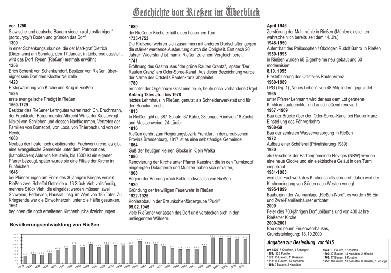 Geschichte von Rießen im Überblick vor 1250 Slawische und deutsche Bauern siedeln auf „rostfarbigen“ (sorb: „ryzy“) Boden und gründen das Dorf 1300 in einer Schenkungsurkunde, die der Markgraf Dietrich (Diezmann) am Sonntag, den 17.Januar, in Lieberose ausstellt, wird das Dorf Rysen (Rießen) erstmals erwähnt 1356 Erich Schenk von Schenkendorf, Besitzer von Rießen, übereignet sein Dorf dem Kloster Neuzelle 1420 Ersterwähnung von Kirche und Krug in Rießen 1535 erste evangelische Predigt in Rießen 1560-1729 Besitzer des Rießener Lehngutes waren nach Ch. Bruchmann, der Frankfurter Bürgermeister Albrecht Wins, der Klostervogt Nickel von Schlieben und dessen Nachkommen, Vertreter der Familien von Bomsdorf, von Loos, von Thierbach und von der Heyde. 1600 Neubau der heute noch existierenden Fachwerkkirche, es gibt eine evangelische Gemeinde unter dem Patronat des (katholischen) Abts von Neuzelle, bis 1600 ist ein eigener Pfarrer bezeugt, später wurde sie eine Filiale der Kirche in Fünfeichen 1646 bei Plünderungen am Ende des 30jährigen Krieges verliert Rießen zwei Scheffel Getreide u. 13 Stück Vieh vollständig, mehrere Stück Vieh, die eingelöst werden müssen, zwei Schweine, Federvieh, Hausrat, insg. im Wert von 185 Taler. Zu Kriegsende war die Einwohnerzahl unter die Hälfte gesunken. 1661 beginnen die noch erhaltenen Kirchenbuchaufzeichnungen 1680 die Rießener Kirche erhält einen hölzernen Turm 1733-1753 Die Rießener wehren sich zusammen mit anderen Dorfschaften gegen die stärker werdende Ausbeutung durch die Obrigkeit. Erst nach 20 Jahren Widerstand ist man in Rießen zu einem Vergleich bereit. 1741 Eröffnung des Gasthauses "der grüne Rauten Crantz", später "Der Rauten Cranz" am Oder-Spree-Kanal. Aus dieser Bezeichnung wurde der Name des Ortsteils Rautenkranz abgeleitet. 1780 errichtet der Orgelbauer Gast eine neue, heute noch vorhandene Orgel Anfang 18tes Jh. - bis 1978 letztes Lehmhaus in Rießen, genutzt als Schneiderwerkstatt und für den Schulunterricht. 1813 In Rießen gibt es 387 Schafe, 67 Kühe, 28 junges Rindvieh 18 Zuchtund Mastschweine, 24 Läufer 1816 Rießen gehört zum Regierungsbezirk Frankfurt in der preußischen Provinz Brandenburg, 1817 ist es eine selbständige Gemeinde 1864 Guß der heutigen kleinen Glocke in Klein Welka 1880 Renovierung der Kirche unter Pfarrer Kaestner, die in den Turmknopf eingelegten Dokumente und Münzen haben sich erhalten, 1908 Beginn der Bohrung nach Kohle südwestlich von Rießen 1920 Gründung der freiwilligen Feuerwehr in Rießen 1922-1925 Kohleabbau in der Braunkohlenfördergrube "Puck" 05.02.1945 viele Rießener verlassen das Dorf und verstecken sich in den umliegenden Wäldern Bevölkerungsentwicklung von Rießen 9 0 0 7 9 4 8 0 0 7 7 2 7 3 6 7 3 5 6 8 2 7 0 0 5 9 7 5 7 8 6 0 0 5 0 0 4 3 2 4 0 0 3 0 0 7 7 6 4 7 3 5 1 8 5 9 2 5 7 1 5 1 3 5 6 0 5 8 3 5 8 6 Angaben zur Besiedlung vor 1815 6 0 0 5 3 7 5 3 4 4 7 4 4 4 6 4 5 1 4 6 2 3 4 0 2 4 5 2 8 5 2 7 6 2 0 0 1 0 0 20 06 20 05 20 02 20 01 19 99 19 95 19 92 19 90 19 89 19 81 19 71 19 65 19 64 19 46 19 45 19 39 19 33 19 25 19 10 19 08 19 00 18 91 18 71 18 57 18 46 18 18 18 17 0 18 15 April 1945 Zerstörung der Mahlmühle in Rießen (Mühlen existierten wahrscheinlich bereits seit dem 14. Jh.) 1948-1950 Aufenthalt des Philosophen / Ökologen Rudolf Bahro in Rießen 1950-1995 in Rießen wurden 68 Eigenheime neu gebaut und 60 modernisiert 8.10. 1955 Elektrifizierung des Ortsteiles Rautenkranz 1960-1989 LPG (Typ 1) „Neues Leben“ von 48 Mitgliedern gegründet 1965 unter Pfarrer Lehmann wird der aus dem Lot geratene Kirchturm aufgerichtet und anschließend renoviert 1967 -1969 Bau der Brücke über den Oder-Spree-Kanal bei Rautenkranz, Einstellung des Fährverkehrs 1968-69 Bau der zentralen Wasserversorgung in Rießen 1972 Aufbau einer Schäferei (Privatisierung 1989) 1980 als Geschenk der Partnergemeinde Neviges (NRW) werden eine neue Glocke und ein elektrisches Geläut in den Turm eingebaut 1981-1983 wird das Fachwerk des Kirchenschiffs erneuert, dabei wird der Kircheneingang von Süden nach Westen verlegt 1995-1999 Baubeginn der Wohnanlage „Rießen-Nord“, es werden 55 Einund Zwei-Familienhäuser errichtet 2000 Feier des 700-jährigen Dorfjubiläums und von 400 Jahre Rießener Kirche 2000-2001 Bau des neuen Feuerwehrhauses, Grundsteinlegung: 18.10.2000 um 1425: 6 Kossäten, 1 Sonstiger 1553: 323 Familien 1570: 15 Bauern, 11 Kossäten 1618: 16 Bauern, 14 Kossäten 1656: 9 Bauern, 2 Kossäten 1673: 10 Bauern, 3 Kossäten 1700: 17 Bauern, 13 Kossäten, 2 Häusler 1708: 17 Bauern, 9 Kossäten 1750: 18 Bauern, 13 Kossäten, 8 Häusler, 2 Sonstige