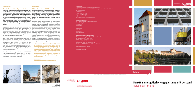 Klimaschutz Baukultur Zentraler Ansatzpunkt ist die gebaute Stadt Differenziert sanieren heißt Kultur bewahren Unser Klima ändert sich. Hauptgrund sind von Menschen verursachte Treibhausgase, die den natürlichen Treibhauseffekt verstärken. Mit dem Kyoto-Protokoll hat sich die internationale Gemeinschaft 1997 verpflichtet, gegenzusteuern und den Klimaschutz voranzubringen. Ziel muss es sein, die erneuerbaren Energien auszubauen, um fossile Brennstoffe als Energieträger zu ersetzen, die Energieeffizienz zu steigern und unseren Konsumstil zu ändern, um den Energieverbrauch zu senken. Das ist umso wichtiger, als sich der weltweite Primärenergieverbrauch in den letzten vierzig Jahren mehr als verdoppelt hat. So global das Problem ist, so klar ist auch: Handeln muss man auf lokaler Ebene. Großstädte wie Berlin stehen besonders in der Pflicht. Sie sind nicht nur Hauptbetroffene (weil hier die meisten Menschen leben), sondern auch Hauptverursacher: 40 Prozent des Endenergieverbrauchs in Deutschland entfallen auf den Gebäudesektor. Damit liegt eines der größten Potenziale zur CO2-Minderung im Gebäudebestand. Auch in Berlin wird der Klimawandel spürbar. Selbst wenn es gelänge, weltweit und in naher Zukunft die ehrgeizigsten Schutzziele zu erreichen, werden bis 2050 die Durchschnittstemperaturen in Berlin um bis zu 2,5 Grad steigen. Die Zahl heißer Tage und Nächte nimmt zu. Hitzeperioden werden häufiger, heißer und dauern länger. Die Niederschläge nehmen nur leicht ab, verteilen sich aber anders: die Winter werden feuchter, die Sommer trockener. Zugleich kommt es häufiger zu extremen Wetterereignissen. Klimaschutz und Anpassung an den Klimawandel sind dabei zwei Seiten ein und derselben Medaille. Beide sind eine gesellschaftliche und wirtschaftliche Notwendigkeit. Und für beide ist die gebaute Stadt zentraler Ansatzpunkt. Zeitgemäßes Bauen rückt den umsichtigen Umgang mit Ressourcen in den Mittelpunkt. Doch mitunter blieb bei energetischen Sanierungen bislang eine zentrale Ressource der Stadtgesellschaft außer acht: die Baukultur. Die gebaute Stadt birgt in sich die Energien und Ressourcen, die bei ihrer Errichtung verbraucht wurden. Ihre Gestaltung verfügt über vielfältige kulturelle Werte. Historische Gebäude, Straßen und Plätze sind Sehenswürdigkeit und Heimat. Sie stiften mit ihrer regionalen Vielfalt und Eigenart Identität, prägen ganze Straßenzüge und Quartiere und geben der Stadt erst ihr Gesicht. Vor allem aber sind Bauten Zeugen unserer Kulturgeschichte. Gestaltung, Konstruktion, Raumstruktur, Ausstattung und Haustechnik historischer Bauten können Auskunft geben über Lebensweise, Gestaltungswille und Arbeitswelt ihrer Entstehungszeit. Damit ein solches Stein gewordenes Gedächtnis heute und in Zukunft befragt werden kann, ist es notwendig, nicht nur sein Erscheinungsbild, sondern auch seine Substanz zu erhalten. Geht die überlieferte Substanz verloren, führt das einerseits zum Verlust von Echtheit – samt all der vielfältigen, an diese Authentizität gebundenen Informationen. Andererseits geht damit bereits investierte Energie verloren, was nachhaltiges Wirtschaften in Frage stellt. „Die Energiewende ist nicht nur eine technologische Herausforderung, sondern eine große kulturelle Aufgabe. Gerade bei der energetischen Ertüchtigung des baulichen Bestandes gilt es, den Blick über die Denkmale hinweg zu richten auf die Gestaltungsvielfalt des Gesamtbestands. Neben den Denkmalen geht es auch um die Vielfalt des baulichen Bestandes unserer Städte. Hier ist es wichtig, historische und baukünstlerische Werte und Qualitäten präzise zu benennen, so dass sie bei der energetischen Ertüchtigung in differenzierten Konzepten berücksichtigt werden.“ Fachabteilung Senatsverwaltung für Stadtentwicklung und Umwelt Stabsstelle Denkmalschutz und UNESCO-Welterbe/Oberste Denkmalschutzbehörde Am Köllnischen Park 3 10179 Berlin Telefon 030 9025-1501 Fax 030 9025-1547 [email protected] www.stadtentwicklung.berlin.de/denkmal In Zusammenarbeit mit BSQB | Büro für Stadt, Quartier und Beteiligung Franz-Mehring-Platz 1 10243 Berlin [email protected] Bearbeitung: Eckhard Hasler Diana Hasler Marita Klempnow Ausstellungs- und Informationszentrum der Senatsverwaltung für Stadtentwicklung und Umwelt Am Köllnischen Park 3, 10179 Berlin U-Bahn Linien U2, Märkisches Museum, U8, Jannowitzbrücke oder Heinrich-Heine-Straße S-Bahn Linien S5, S7, S75, Jannowitzbrücke Bus Linien 147, 248, 265, U-Bhf. Märkisches Museum www.stadtentwicklung.berlin.de Stand: November 2015 Dr. Dagmar Tille, Oberste Denkmalschutzbehörde/UNESCO-Welterbe Baukultur Titelbilder: © STADT UND LAND, Marc William Ruiken; Hochbauamt der Stadt Nürnberg; Olaf Mahlstedt, Hannover; BSQB © Andreas Muhs © SenStadtUm / Fotograf: Wolfgang Bittner © Andreas Muhs Vogelschwarm an der Moltkebrücke Gendarmenmarkt Fassade aus der Zeit um 1900 Kommunikation Württembergische Straße 6, 10707 Berlin [email protected] DenkMal energetisch – engagiert und mit Verstand Beispielsammlung ENERGIEEFFIEZIENZ IN DER PRAXIS Nutzung – Wollen wir Energie sparen oder vergeuden? Wie wir wohnen, ist ein wichtiger Faktor für die Energiebilanz von Gebäuden. 10 bis 15 Prozent des Verbrauchs lassen sich durch ein entsprechendes Nutzerverhalten sparen. Ein Weg, das Bewusstsein für den sparsamen Umgang mit Ressourcen zu schärfen, ist die Erziehung bereits der Jüngsten, ein anderer Aufklärung und Vernunft bei uns Erwachsenen. © SenStadtUm / Fotograf: Wolfgang Bittner © Andreas Muhs DenkMal energetisch – Heißt „energieeffizient“ wirklich „gesichtslos“? Weiße Stadt Mit dem Berliner Energie- und Klimaschutzprogramm stellt sich Berlin das anspruchsvolle Ziel, bis 2050 cO2-neutral zu sein. Erreicht werden kann das nur, wenn Akteure aus vielfältigen handlungsfeldern die Stadt gemeinsam klimaneutral gestalten. Das erfordert vor allem innovative Strategien, die den Wert der Bau- und Stadtstruktur berücksichtig